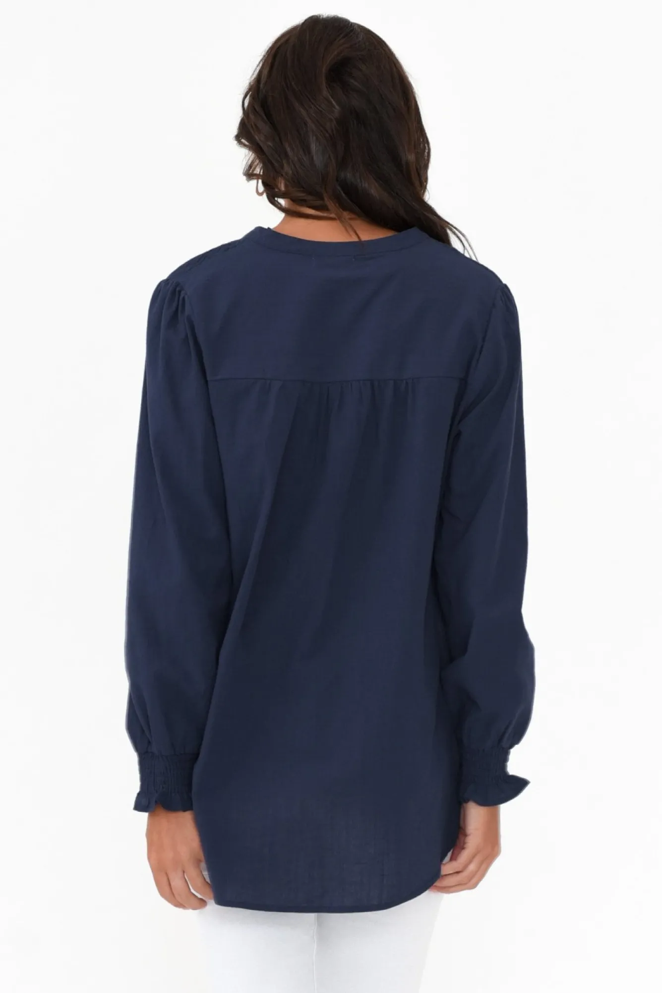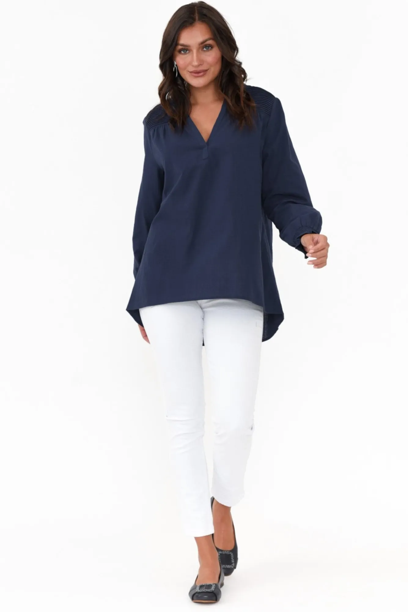 Sleeved Tops<Cali and Co April Navy Cotton V Neck Top
