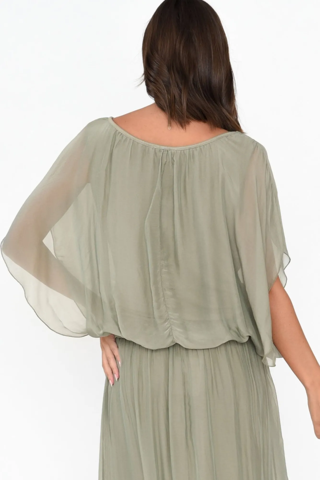 Fit: True To Size. Refer To Size & Fit Tab Below For Specific Size RecommendationNNfabric: Main: 70% Viscose, 30% Silk Lining: 95% Viscose, 5% Elastane Ncrafted In Italy From Breezy, Lightweight And Non-Stretch Silk-Blend Fabric With A Soft Hand Feel And An Elevated Sheen Finish Ndesigned With Full Singlet Lining Made From A Soft And Stretchy Fabric Nround Neckline Accentuated By Soft Pleating Detail NNopen Drape-Style Sleeves Cascade Down And Around The Arm NNeffortless Drape Silhouette NNtapered Jersey Hemline Falls Above Hip Length NNNcare: Cool Gentle Hand Wash RecommendedNNcolour: Soft Sage Hue