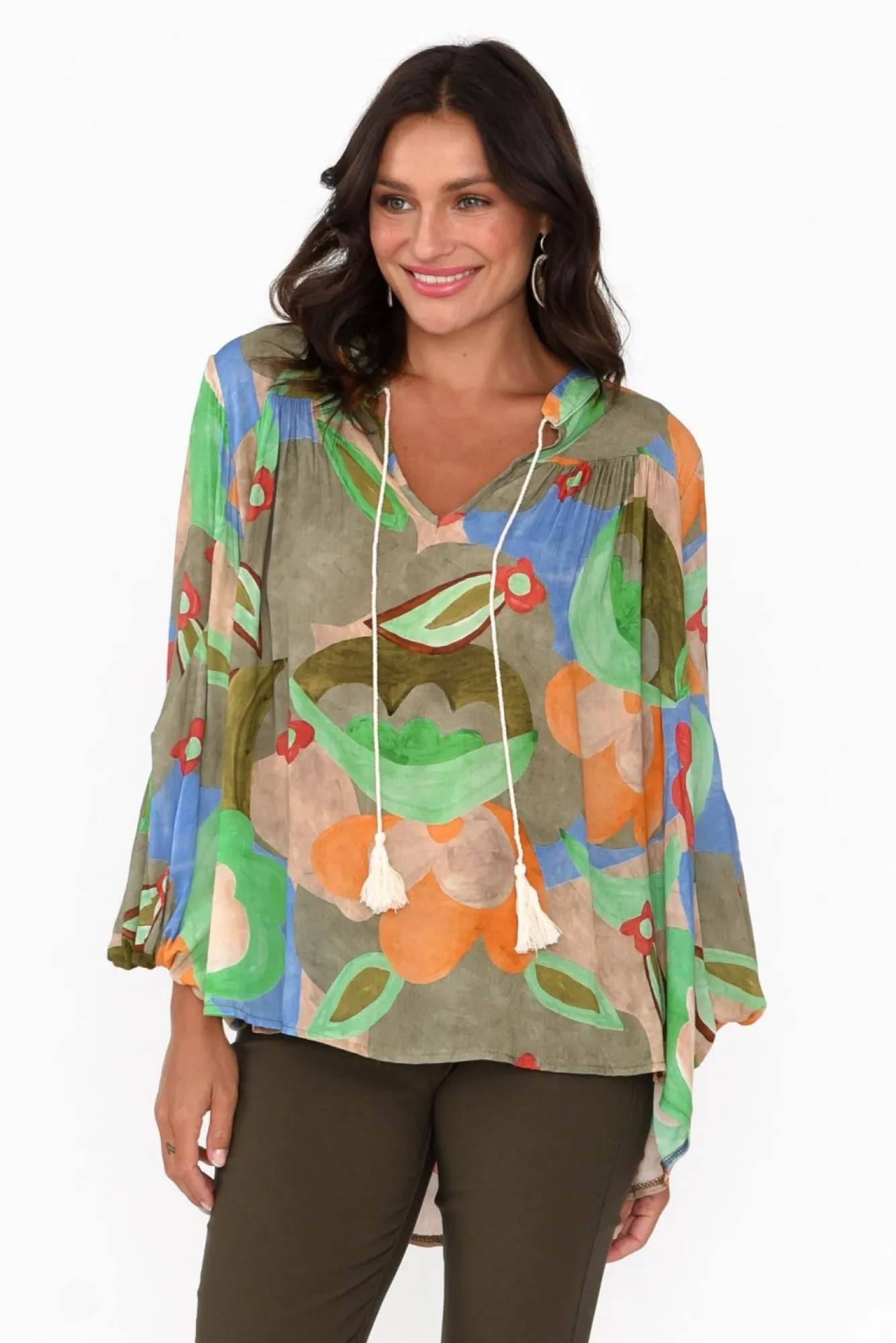 Fit: True To Size. Refer To Size & Fit Tab Below For Specific Size RecommendationNNfabric: 100% ViscoseNlightweight And Non-Stretch Fabric With A Lovely Soft Hand FeelNNbanded Round Collar With A Deep V-Split And Tassel Tie DetailNstatement Full-Length Puff Sleeves With An Elastic CuffNNsoft Pleating Details At The Yoke, Front Of The Shoulders And Sleeves Elevate The LookNrelaxed Straight Silhouette Flows Over CurvesNNcurved Hi-Lo Hem Provides More Coverage At The BackNNcare: Cool Gentle Hand Wash RecommendedNNcolour: Collage Of Flowers In Hues Of Khaki And Green