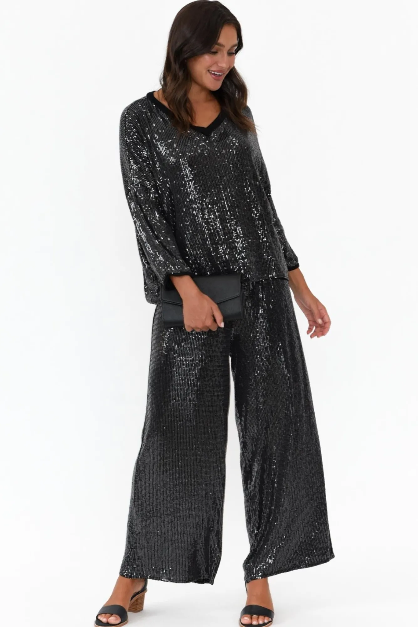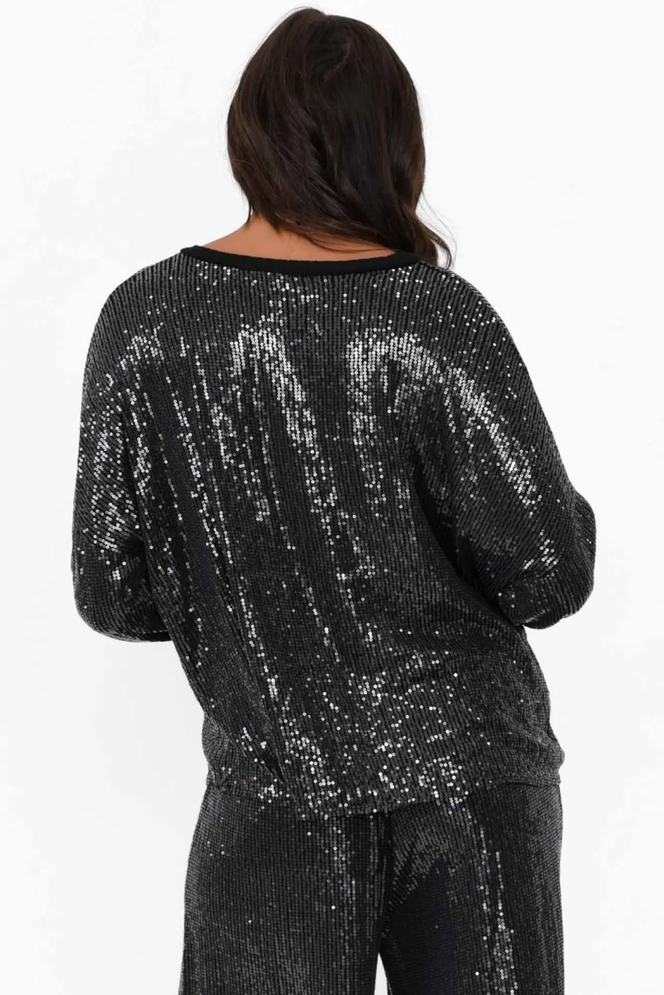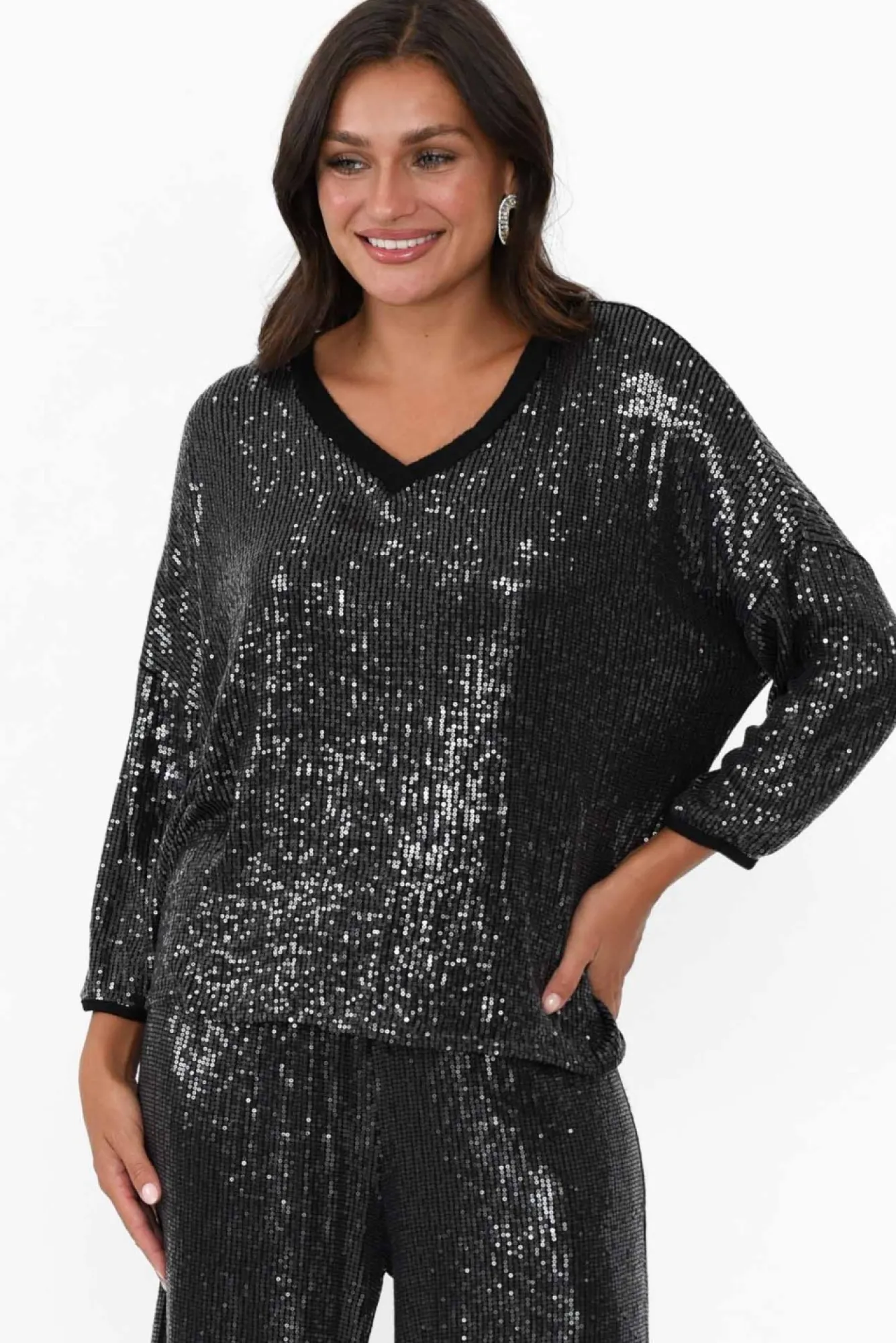 Be the first to review “Sleeved Tops<La Strada Braxton Black Sequin V Neck Top” Cancel reply