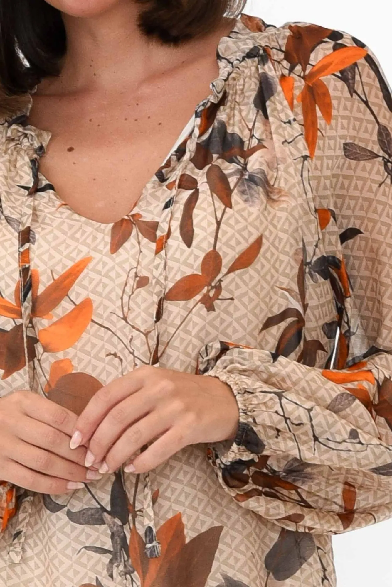 Fit: True To Size. Refer To Size & Fit Tab Below For Specific Size RecommendationNNfabric: Outer: 30% Silk 70% Viscose Lining: 95% Viscose 5% ElastaneNa Versatile And Elevated Blouse, Crafted In Italy From An Ultra-Lightweight Silk BlendNcomfortable And Stretchy Sleeveless Lining Provides Extra CoverageNstriking V-Split Neckline Enhanced By Frill Detail And Adjustable Tie Nbillowy And Sheer Full-Length Sleeves With An Elasticated CuffNNrelaxed Straight Silhouette With A Stretchy Lining For Additional Coverage Ndrapes To Hip Length NNNcare: Cool Gentle Hand Wash RecommendedNNcolour: Natural Base With A Stunning Rust Floral Overlay