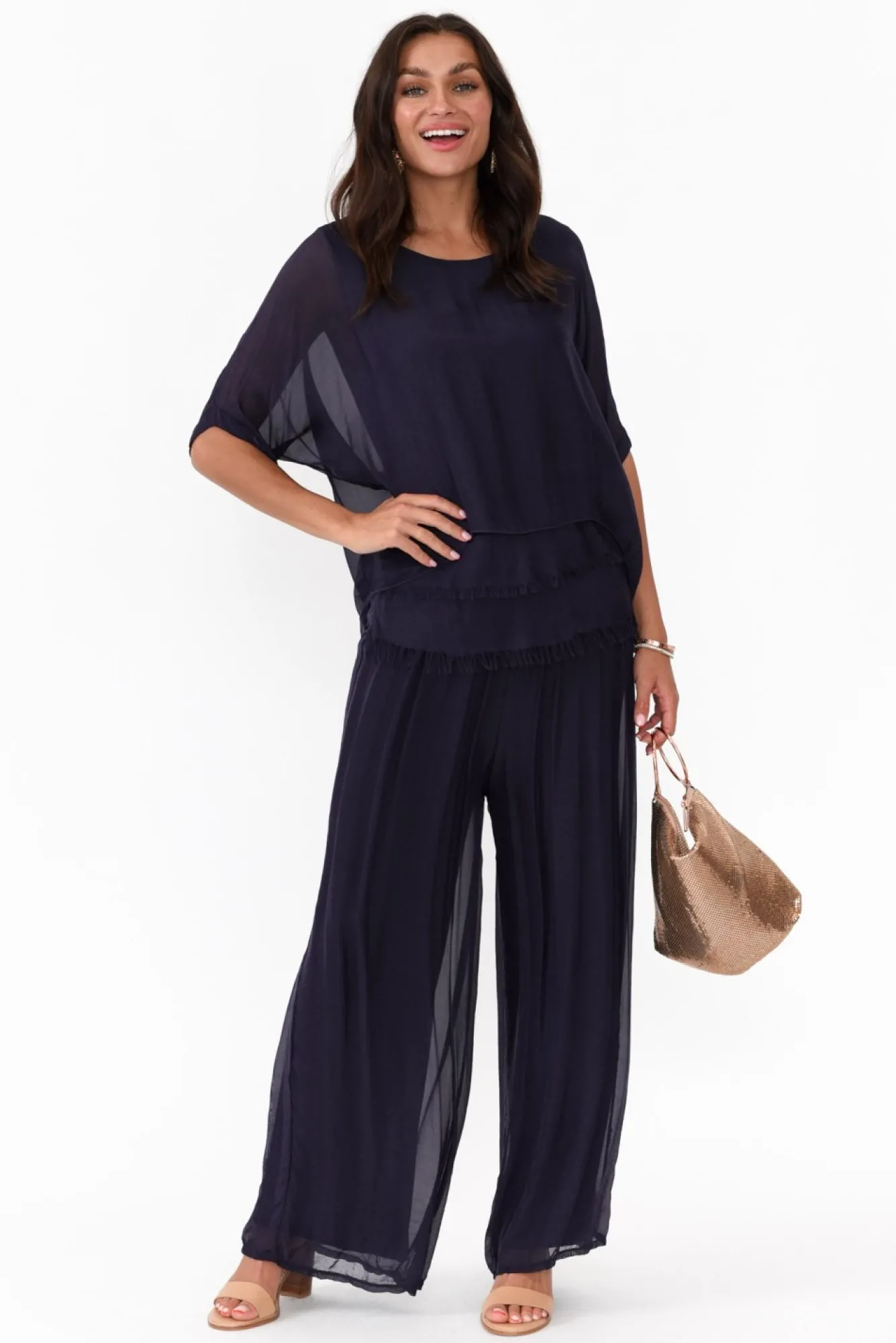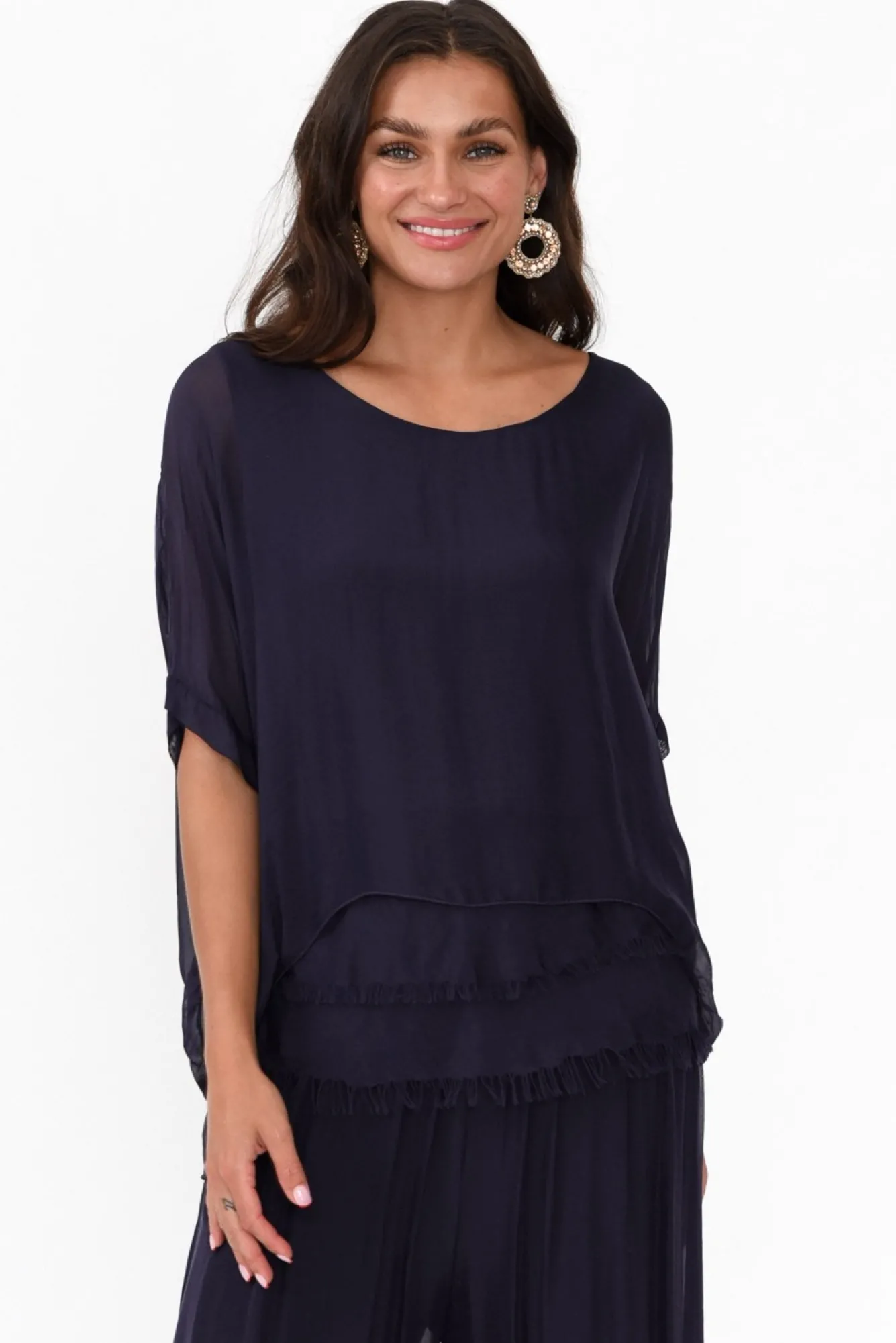 Be the first to review “Sleeved Tops<La Strada Talia Navy Silk Layer Top” Cancel reply
