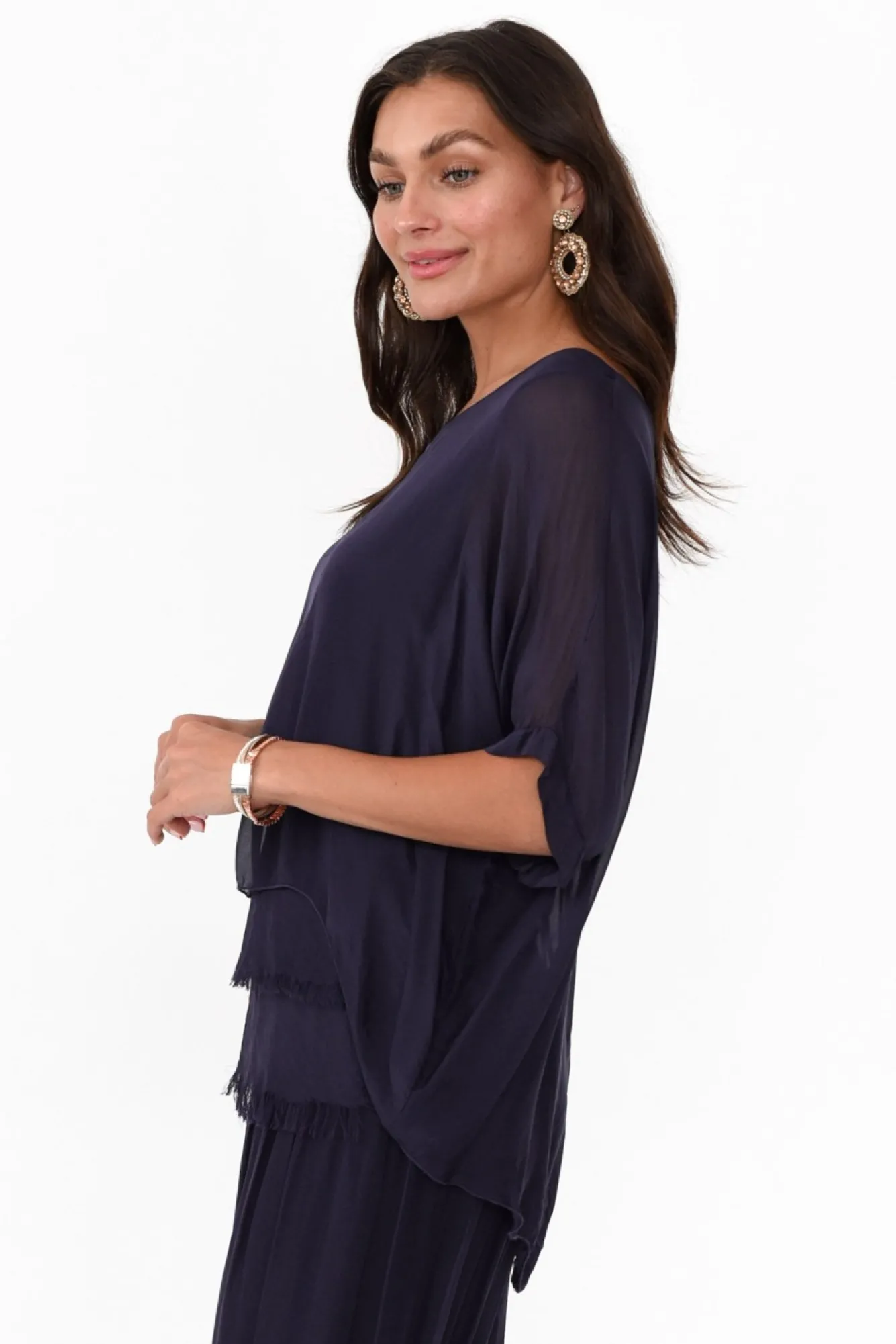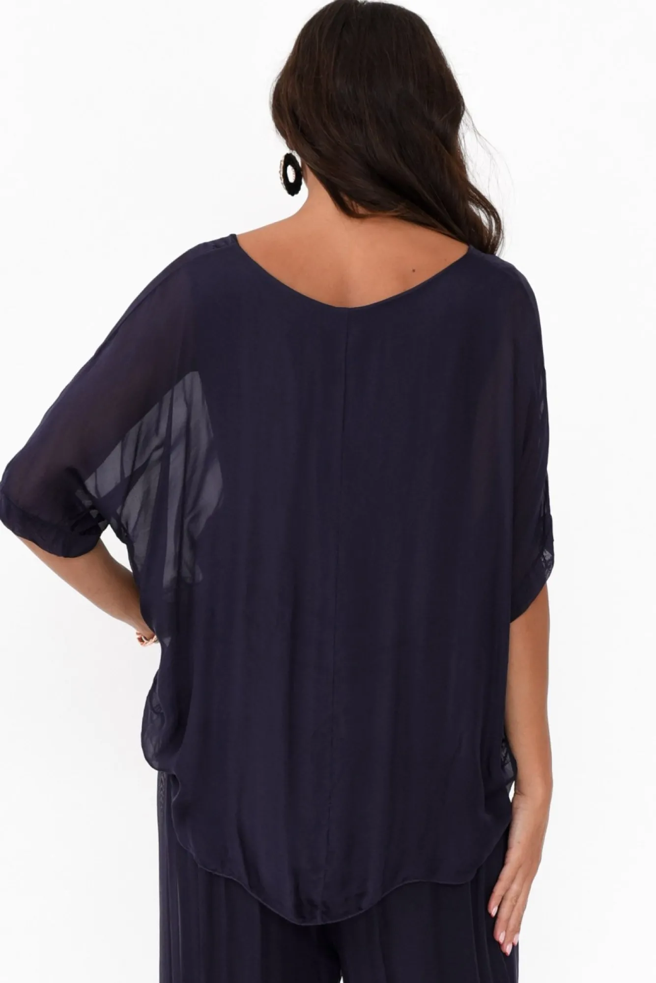 Fit: True. Refer To Size & Fit Tab Below For Specific Size RecommendationNNfabric: Outer: 70% Viscose, 30% Silk, Lining: 95% Viscose, 5% ElastaneNNhandmade In ItalyNlightweight, Soft, Breathable And Ultra-Stretchy Fabric Lining With Silky Smooth Sheer OuterNfeaturing A Round Neckline With Half-Length Sheer SleevesNdraping Straight Silhouette For A Flattering Floaty LookNstylish Hi-Lo Hemline With Layered EffectNhip-Skimming LengthNNcare: Cool Gentle Hand Wash RecommendedNNcolour: True Navy Colour