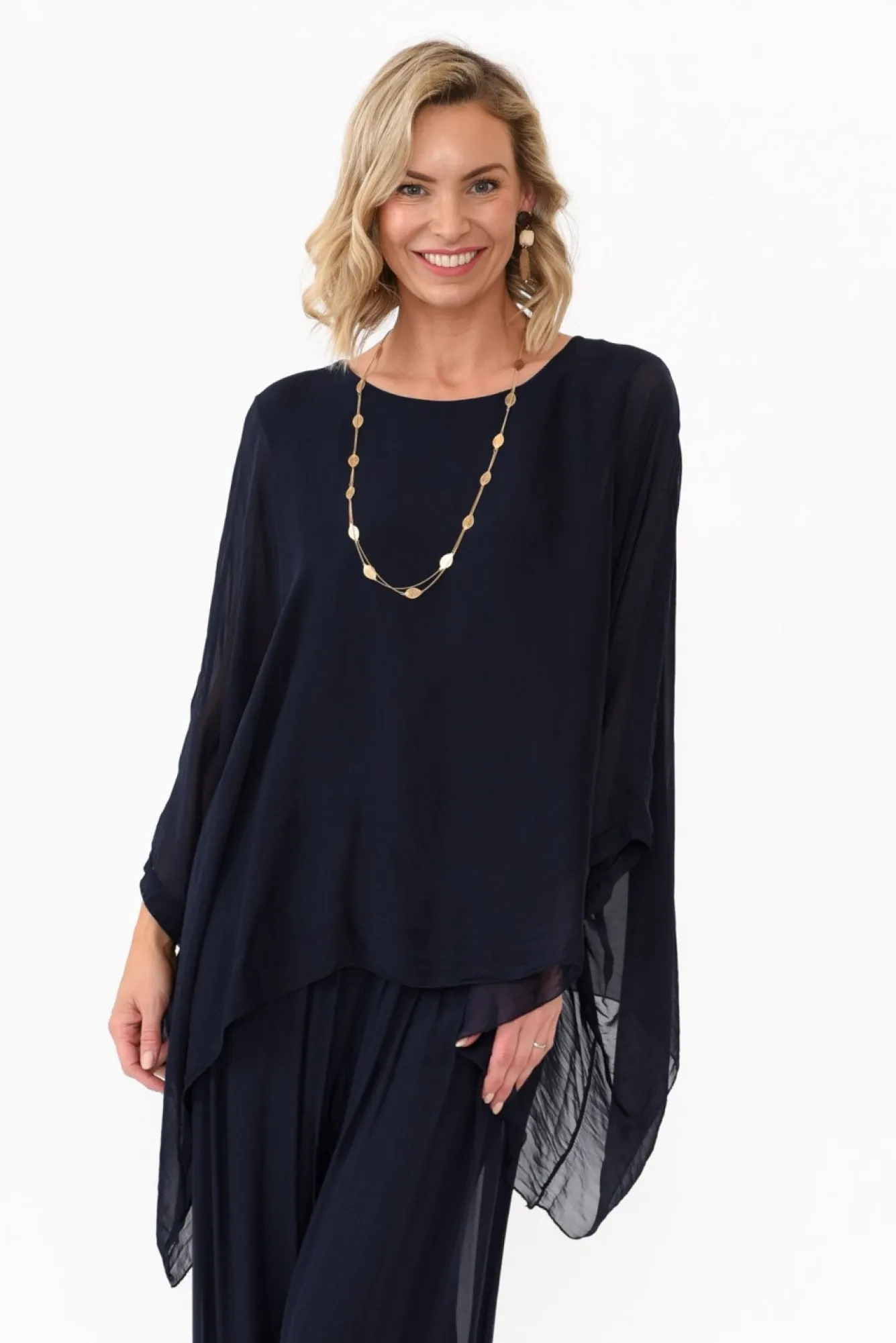 Fit: True To Size. Refer To Size & Fit Tab Below For Specific Size RecommendationNNfabric: Outer: 30% Silk, 70% Viscose Lining: 95% Viscose, 5% ElastaneNcrafted In Italy From A Silk Blend With A Soft And Lightweight FinishNfull Singlet Lining In A Soft And Ultra-Stretchy Fabric Complements The Sheer Outer Nhigh, Rounded Neckline Creates A Polished LookNdramatic Half-Length Batwing Sleeve DesignNbreezy Drape Silhouette Nstylish Asymmetric Hemline Falls To A Hip-Skimming LengthNNcare: Cool Gentle Hand Wash RecommendedNNcolour: Deep Navy