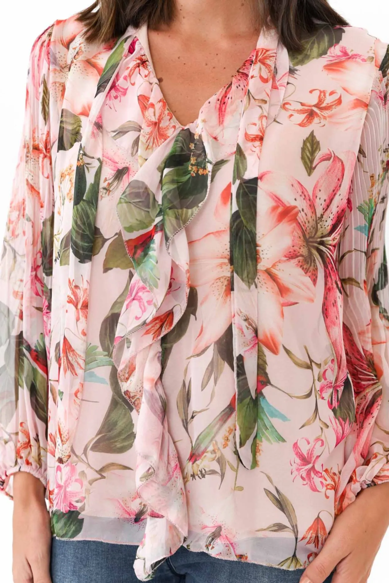 Fit: True To Size. Refer To Size & Fit Tab Below For Specific Size RecommendationNNfabric: Outer: 100% Chiffon Polyester Lining: 95% Viscose, 5% ElastaneNcrafted In Italy From A Lightweight, Sheer Chiffon OverlayNultra-Soft And Stretchy Singlet Lining Complements Sheer OuterNtimeless V-Neckline With A Statement Open Neck TieNruffle Detail Down The Front Of The Shirt Adds A Fun FlairNsheer, Full-Length Puff Sleeves With Feature PleatingNNrelaxed, Straight SilhouetteNNhip-Skimming LengthNNNcare: Cool Gentle Hand Wash RecommendedNNcolour: Blush Pink Base With A Stunning Garden Overlay