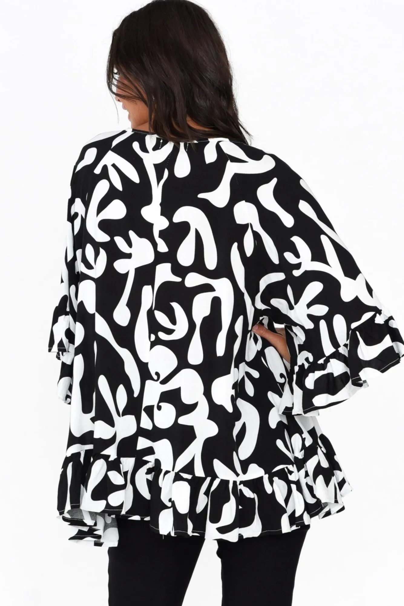 Sleeved Tops<New U Collection Chase Black Abstract Tassel Ruffle Top