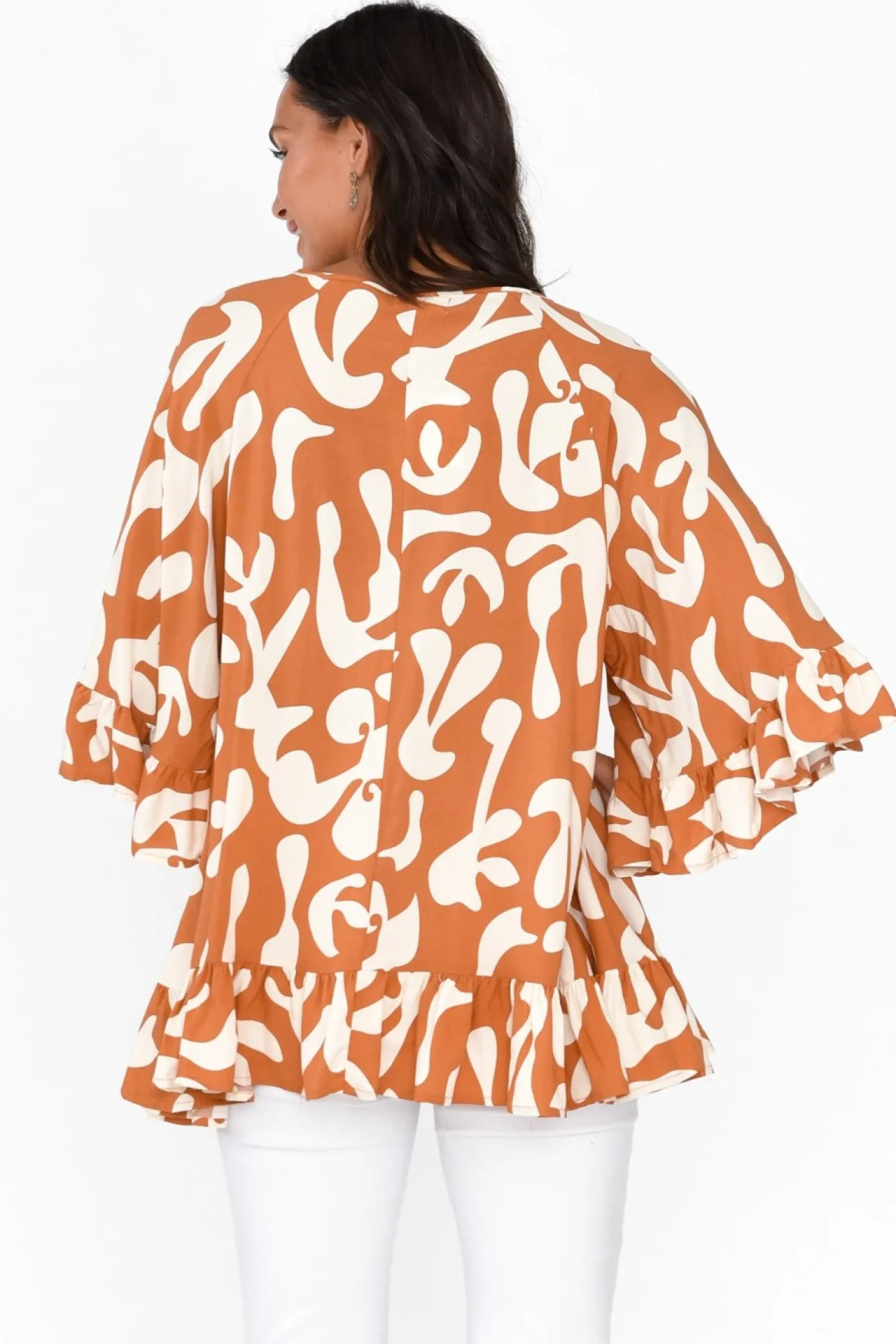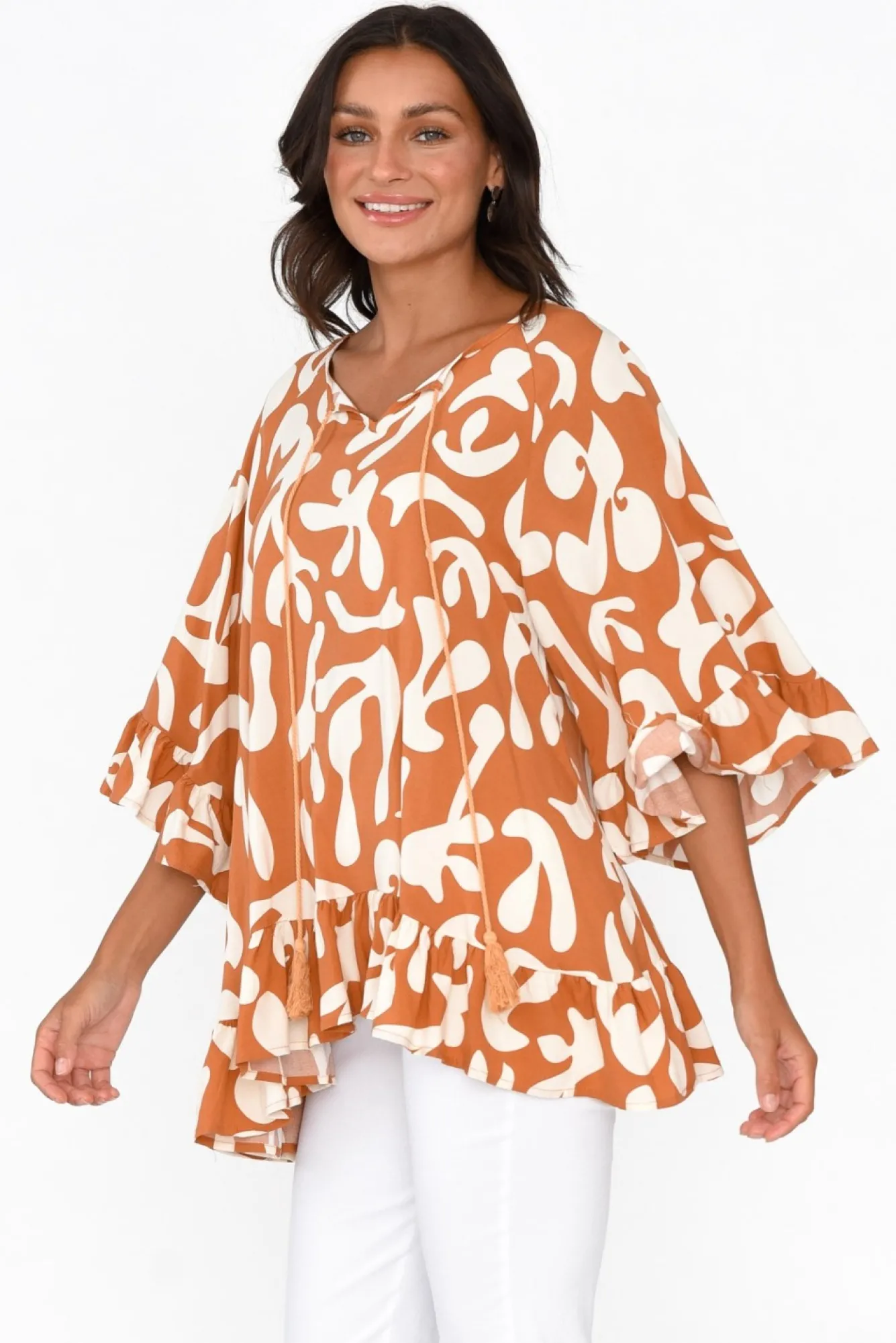 Fit: True To Size. Refer To Size & Fit Tab Below For Specific Size RecommendationNNfabric: 100% RayonNflowy Rayon Fabric With A Soft, Smooth And Lightweight FeelNv-Split Neckline Featuring A Timeless Adjustable Tassel TieNNfrilly 3/4 Length Billow Sleeves NNoversized Drape Silhouette Creates A Floaty LookNfrilled Hemline Cascades Past HipsNNNcare: Cool Gentle Hand Wash RecommendedNNcolour: Lovely Rust Orange Shade With A White Abstract Overlay