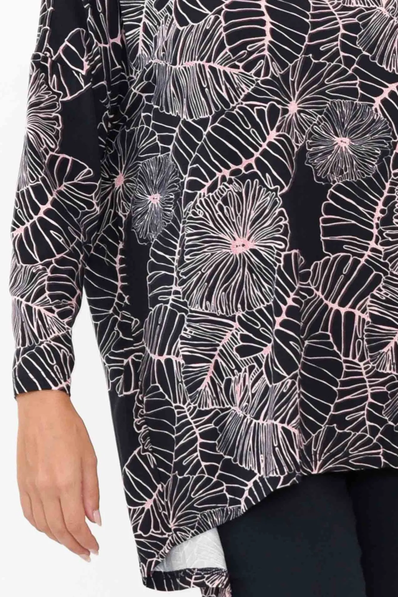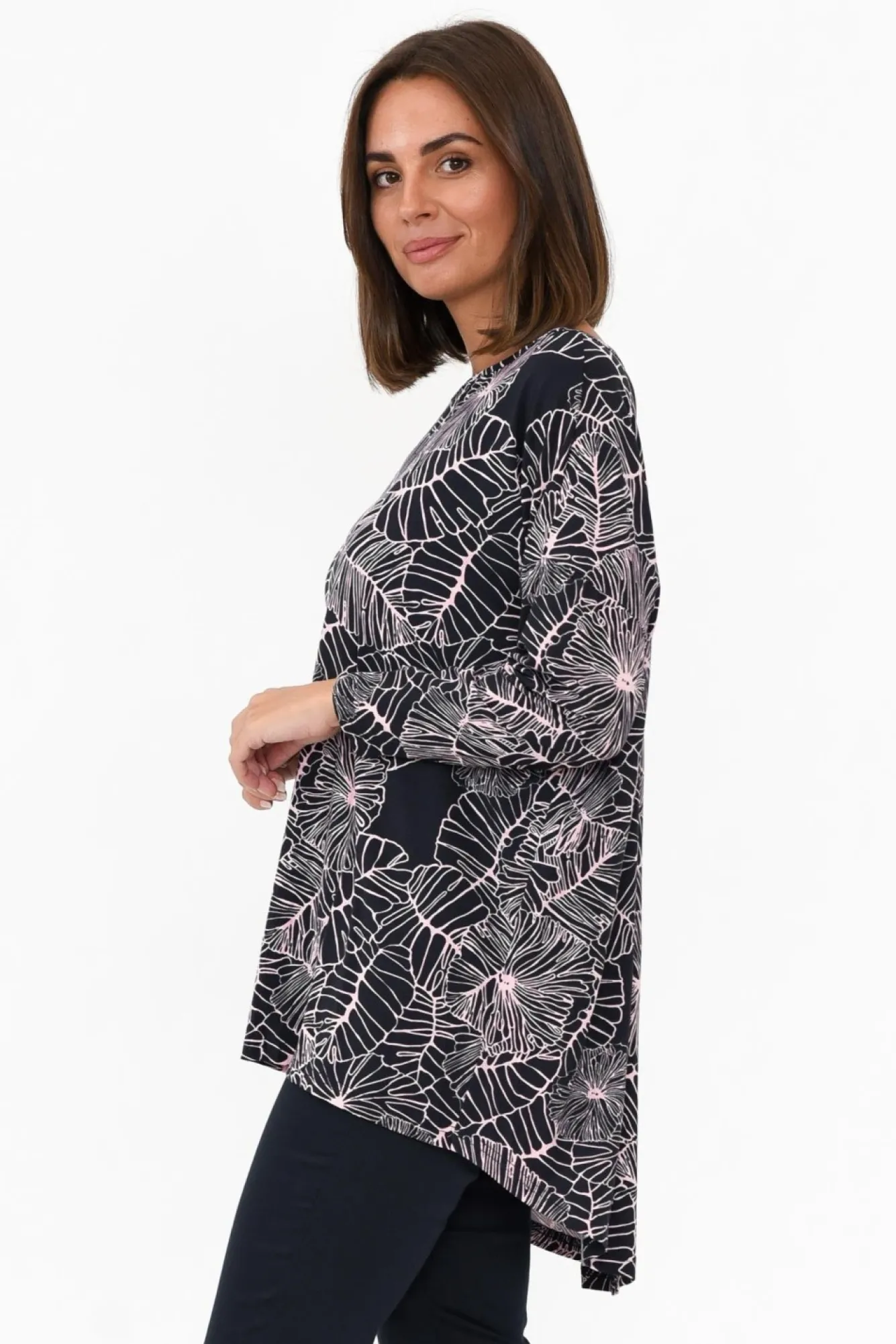 Fit: True To Size. Refer To Size & Fit Tab Below For Specific Size RecommendationNNfabric: 95% Bamboo Viscose, 5% SpandexNlightweight, Breathable And Stretchy Bamboo Jersey FabricNNboatneck Design Enhanced By Added Fabric Detail To Hide Bra Straps NNfull-Length Sleeves Featuring Drop Shoulder Seam NNeffortless Relaxed Silhouette Combines Comfort And StyleNhi-Lo Hemline Falls Below Hip Length NNNcare: Cool Gentle Machine Wash RecommendedNNcolour: Intricate Lilac Garden Print Over A Deep Navy Base