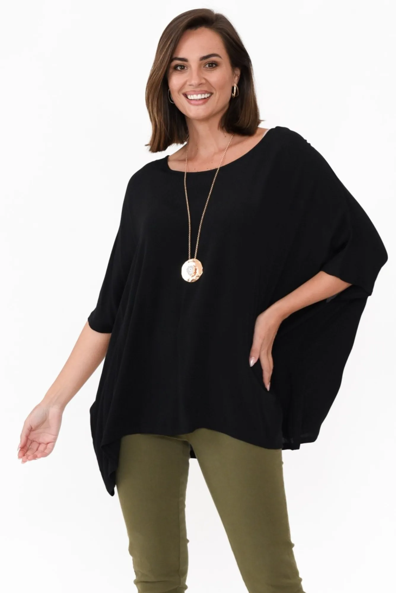 Fit: True. Refer To Size & Fit Tab Below For Specific Size RecommendationNNfabric: 100% RayonNlightweight, Soft And Breathable Non-Stretch FabricNround NecklineNN3/4 Length SleevesNNdraping SilhouetteNdraped Shape Falls To A Flattering Asymmetrical HemlineNNcare: Cool Gentle Hand Wash RecommendedNNcolour: Classic BlackNNnote: Please See Photos Rather Than Video For Most Accurate Colour.
