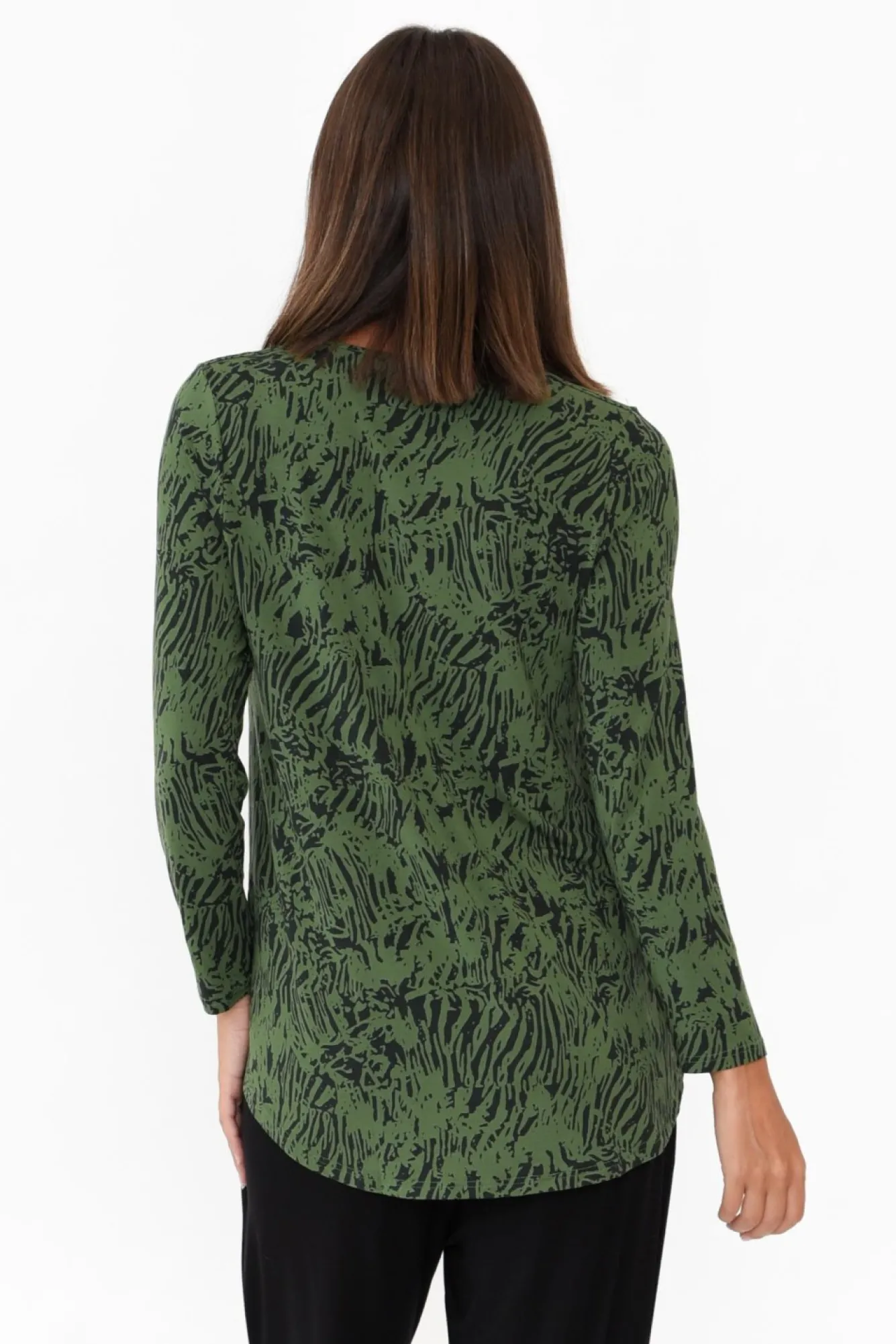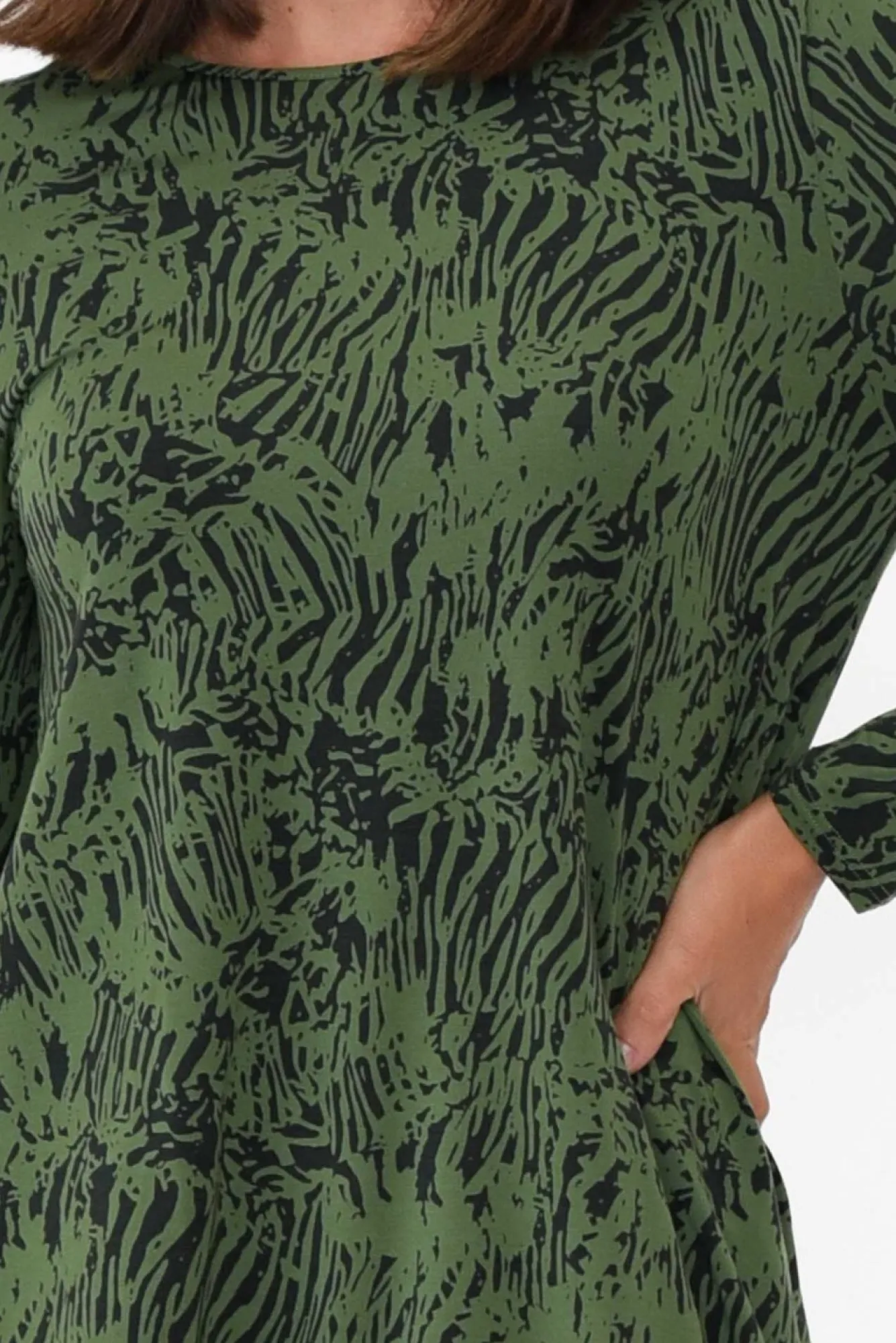 Fit: True. Refer To Size & Fit Tab Below For Specific Size RecommendationNNfabric: 96% Micromodal®Air, 4% LycraNlightweight, Ultra-Soft And Stretchy Micro Modal Fabric Offering Wonderful Thermoregulating Qualities Nmade From Sustainably Sourced Beechwood FibresNsimple Rounded Neckline NNtimeless Long Sleeves Nsubtle A-Line Silhouette NNcurved Hemline Falls To Hip Length NNcare: Warm Gentle Machine Wash RecommendedNNcolour: Forest Green Base With Black Abstract Tiger Print