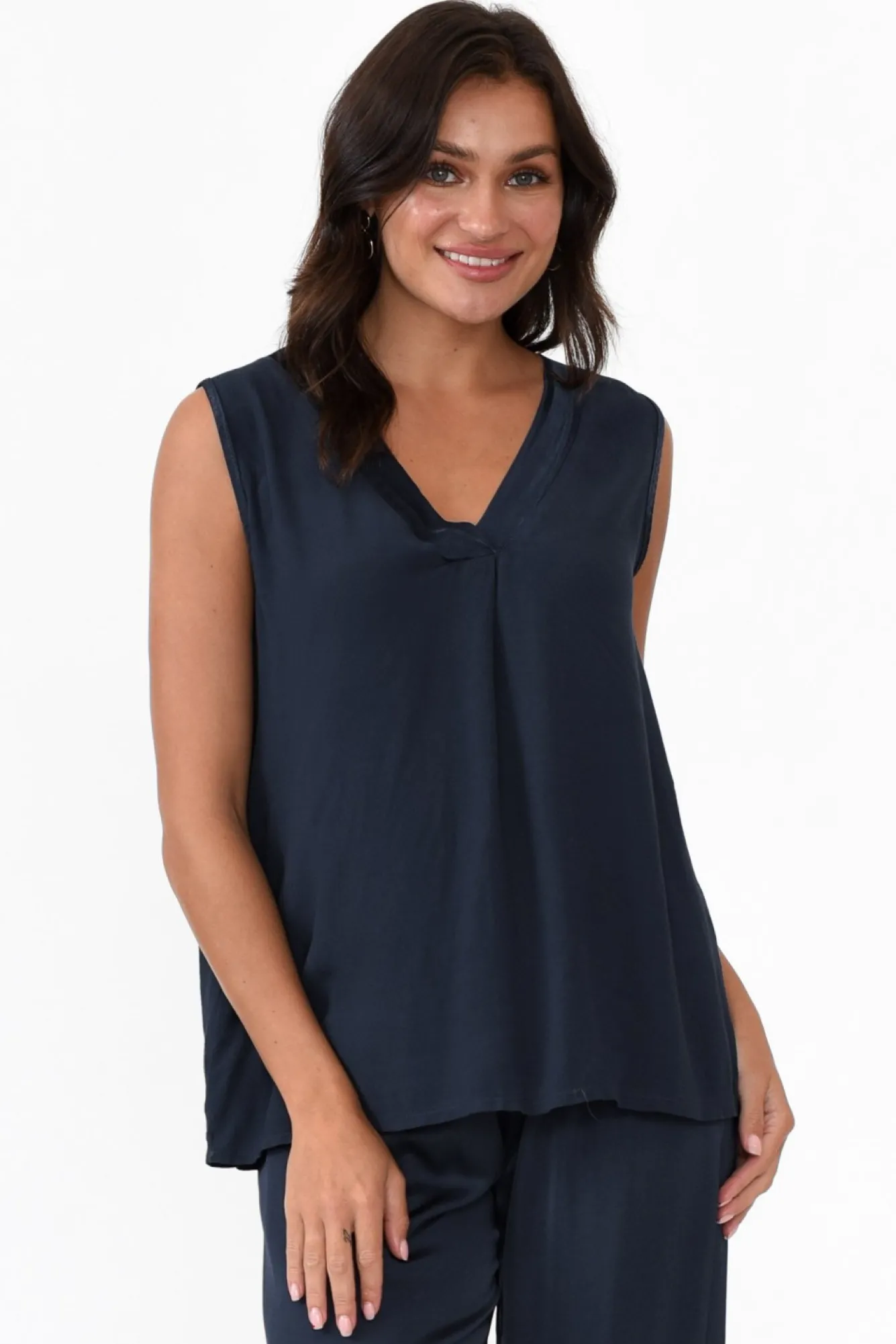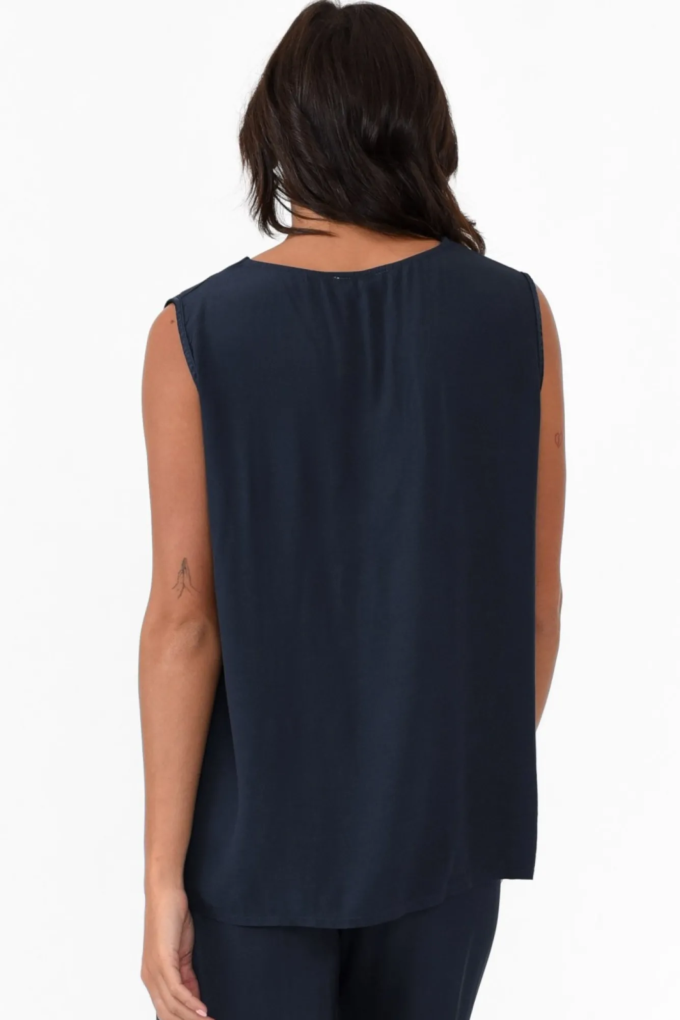 Fit: True To Size. Refer To Size & Fit Tab Below For Specific Size RecommendationNNfabric: 100% Viscose Nconstructed From Breezy, Lightweight And Non-Stretch Fabric With A Slightly Sheer Finish And A Subtle Crepe Hand Feel Nsharp V-Neckline Defined By Elevated Gloss-Style Trim NNelegant Sleeveless Design NNversatile A-Line Silhouette Falls Delicately Over The Body NNhi-Lo Hemline Falls To Hip-Length NNNcare: Cool Gentle Hand Wash RecommendedNNcolour: Deep Navy Hue