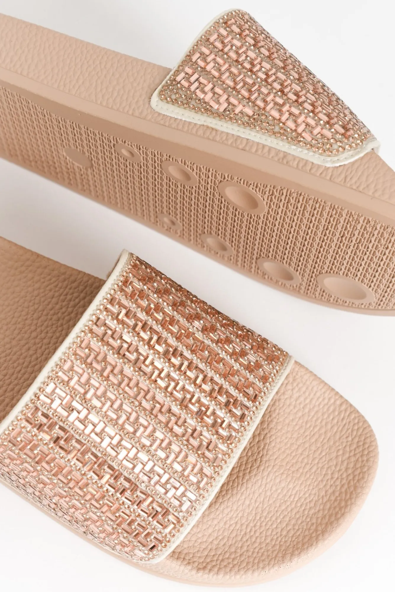 True To Size: Pick The Size You Would Normally BuyNNfit: StandardNa Versatile Everyday Slide With A Lovely Touch Of Bling! Nfeaturing A Wide Strap Over The Toes With A Padded Lining For Comfort Nstatement Rose Gold Emerald-Cut Diamantes Cover The Strap Nmoulded Footbed With Arch Support NNhoneycomb Printed Sole To Reduce Slipping NNupper: SyntheticNNlining: SyntheticNsole: SyntheticNcolour: Nude Shade With Rose Gold DiamantesNheel Height: 2Cm