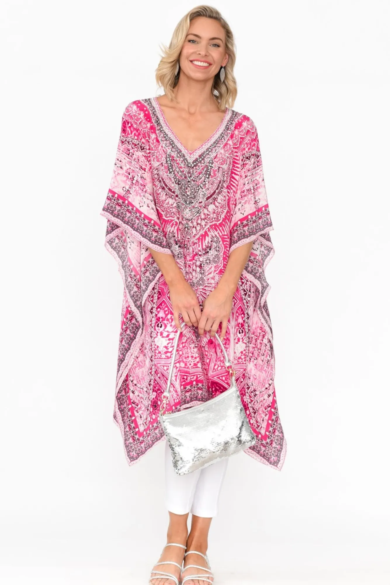 Fit: One Size. Refer To Size & Fit Tab Below For Specific Size RecommendationNNfabric: 100% SilkNa Fabulous Lightweight, Non-Stretch Silk GarmentNv-Neckline With Beaded Sparkle EmbellishmentsNkaftan Drape Style Shape Creating The Ultimate Floaty Summer EssentialNbatwing Style Sleeves With Stunning Waterfall DrapeNdesign Falls To The KneeNNNcare: Specialist Dry Clean OnlyNNcolour: Intricate Boho Style Print In Hues Of Hot PinkNNNstyle Tip: Wear As A Dress Or Style Over Pants For A Tunic Look!