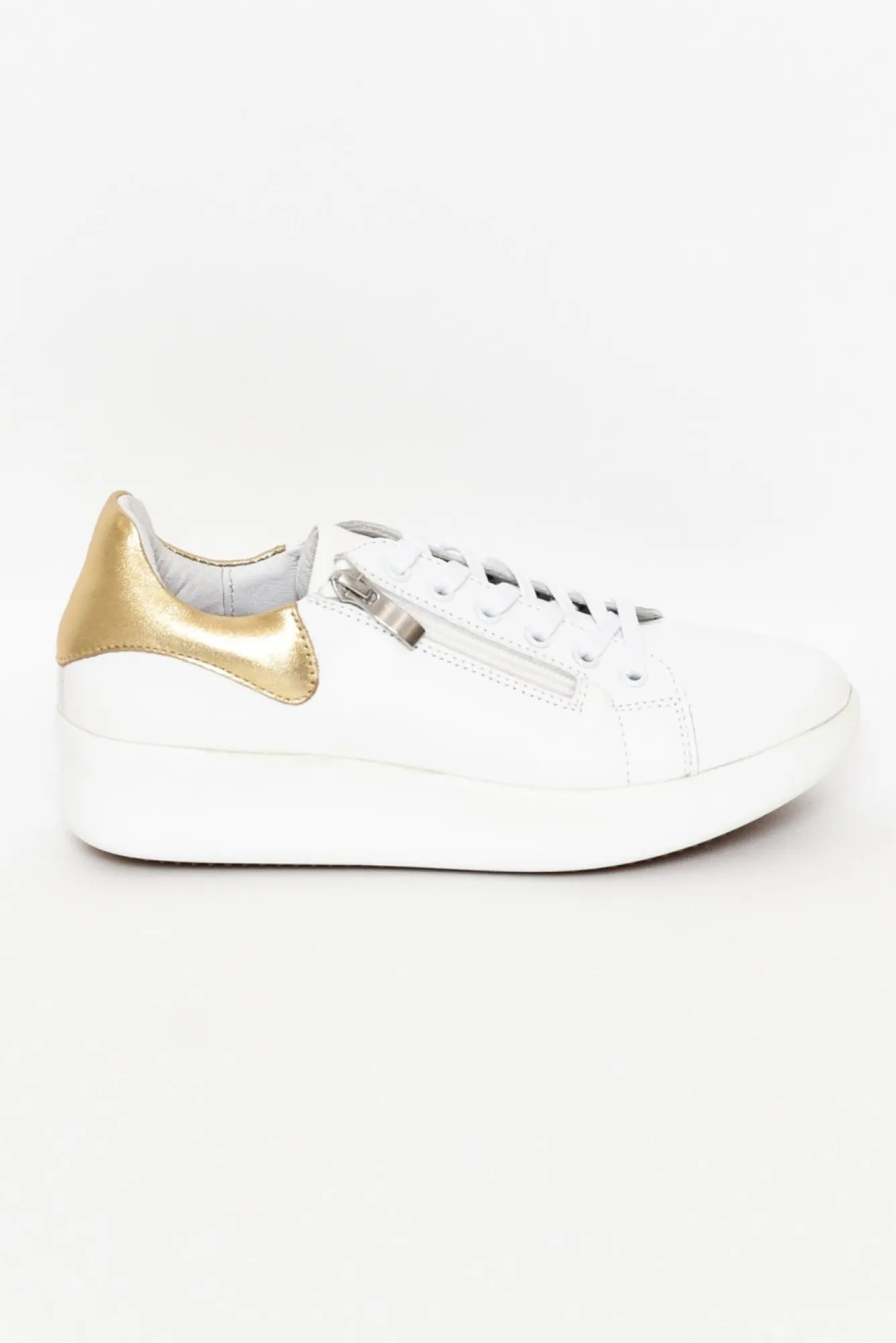 True To Size: Pick The Size You Would Normally BuyNNfit: Standard – WideNstylish Platform Sneaker Designed With Luxurious White LeatherNmetallic Gold Strip Highlighting The HeelNzipper Alongside White Laces Making These Super Easy To Slip OnNorthotic-Friendly Padded Insole Ncorrugated Sole Prevents SlippingNNupper: LeatherNNlining: LeatherNsole: SyntheticNheel Height: 4CmNNshoe Care: Use A Water And Stain Repellent Spray To Protect Before Wearing. To Clean, Use A Damp Cloth And Polish Afterwards.