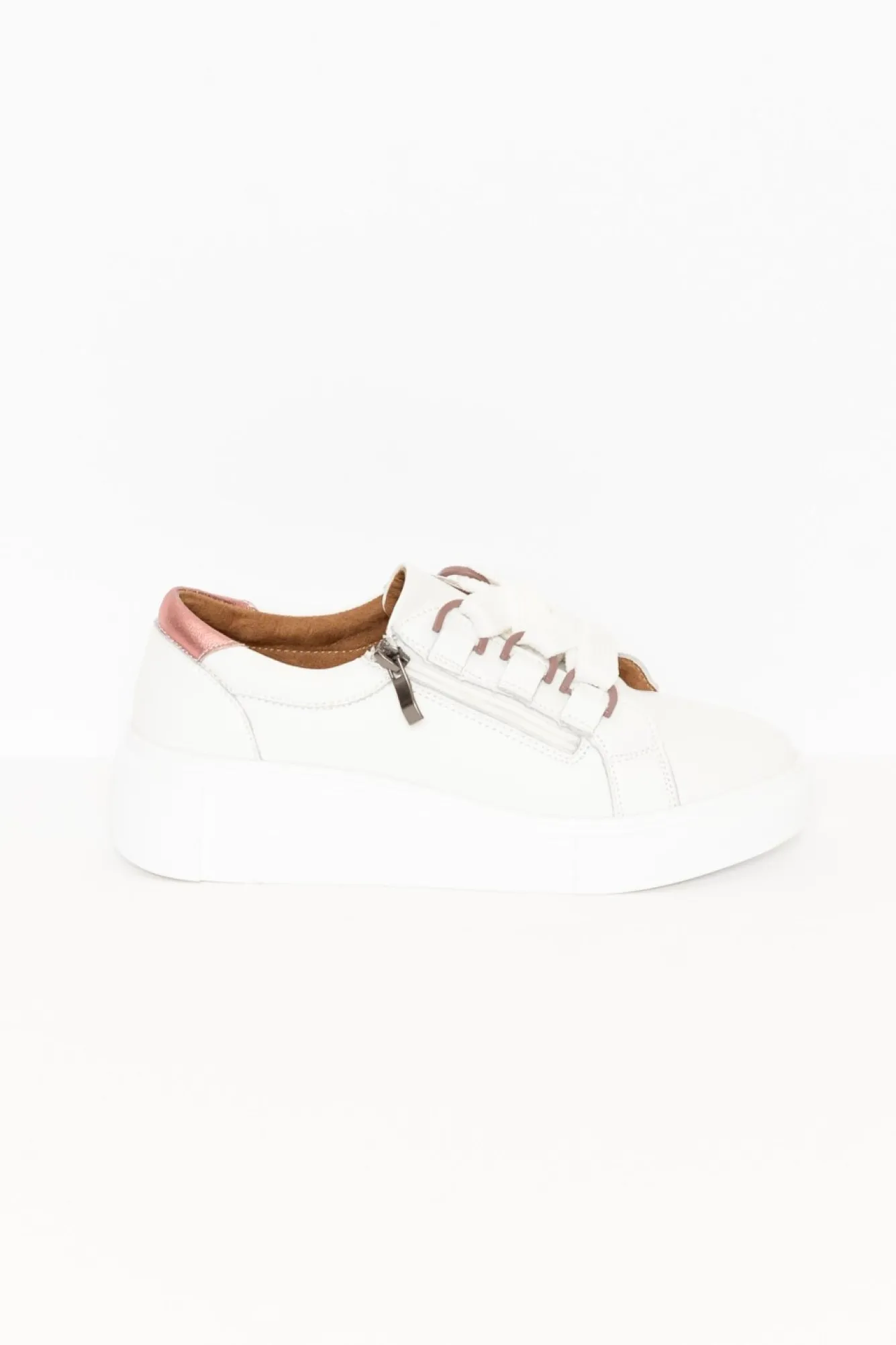 True To Size: Pick The Size You Would Normally BuyNNNfit: Standard – WideNNchunky White Leather Lace-Up SneakerNset Of Thick Knit Laces Threaded Through Makeshift Eyelet HoopsNfunctional Zip Entrance, Minimising Time Spent Doing Your LacesNclassic White Shoe With Pink Metalic Accent Detail On Heel And EyeletsNfolded Collar For Ankle Support And ComfortNremovable Machine-Washable Insoles – Pick Between The Luxuriously Cushioned Insole For Arch Support Or The Lightweight And Thin Insole For A Wider FootNraised Chunky HeelNnon-Slip Scored Rubber SoleNNupper: LeatherNNlining: Man MadeNsock: LeatherNsole: Man MadeNheel Height: 4.5CmNNshoe Care: Use A Water And Stain Repellent Spray To Protect Before Wearing. To Clean White Sneakers Use A Damp Cloth And Polish Afterwards.