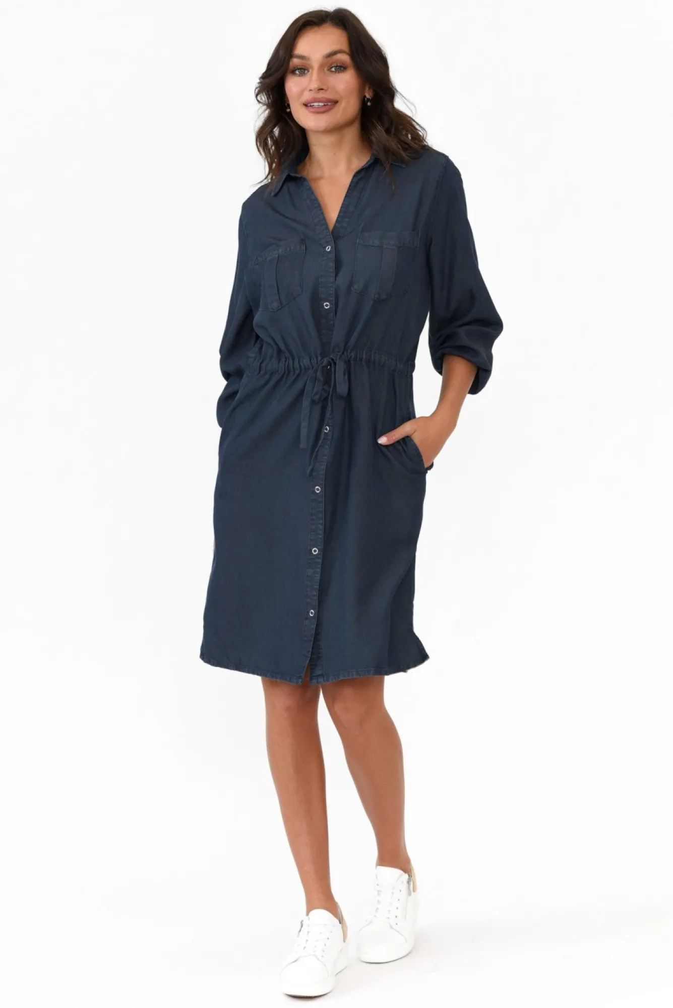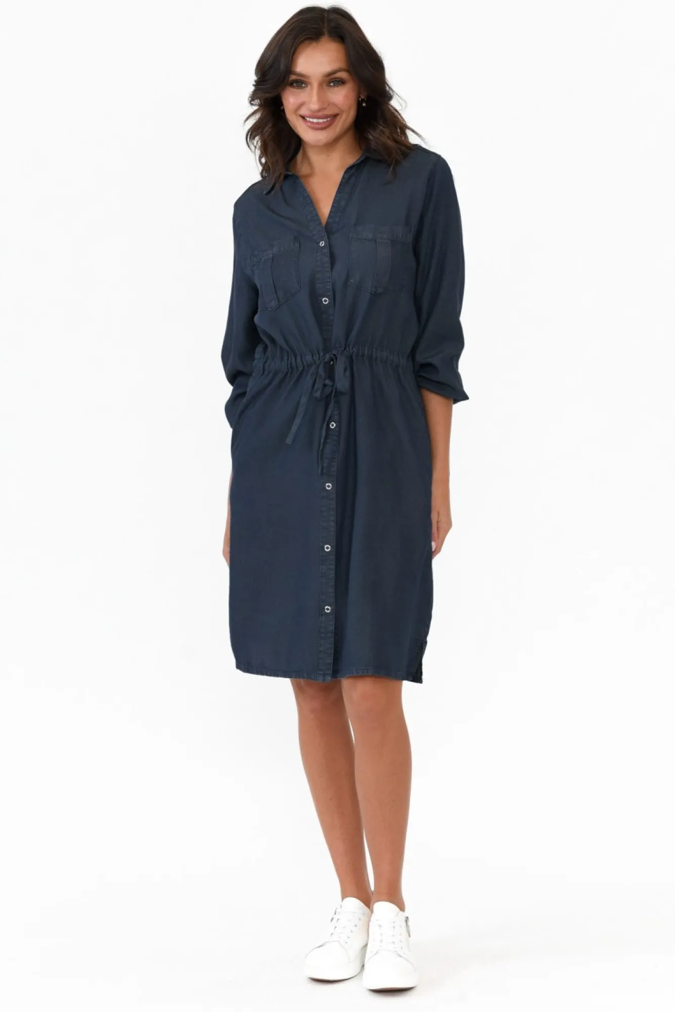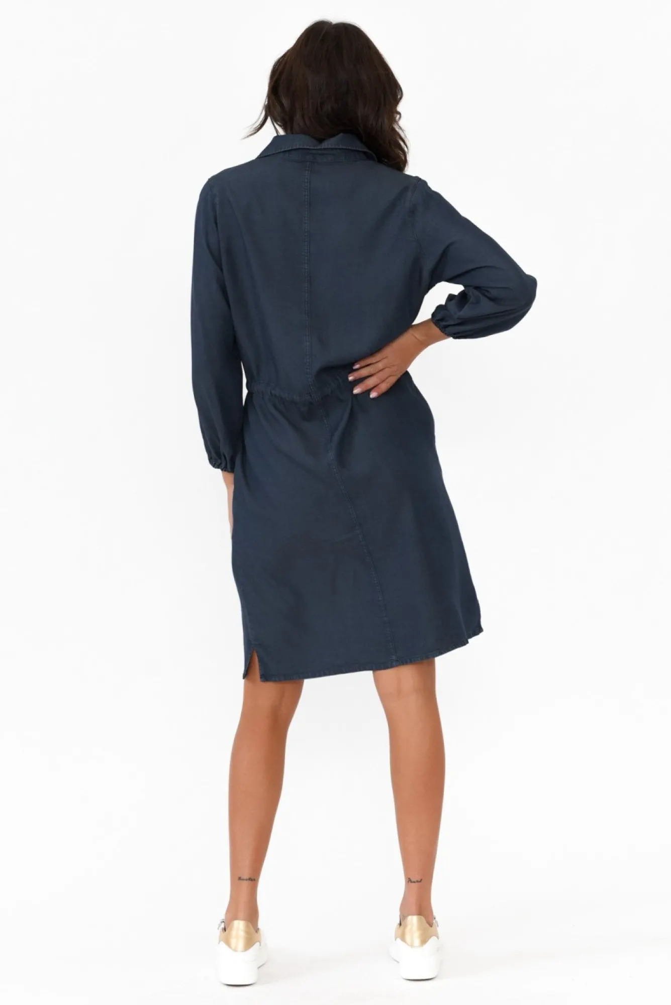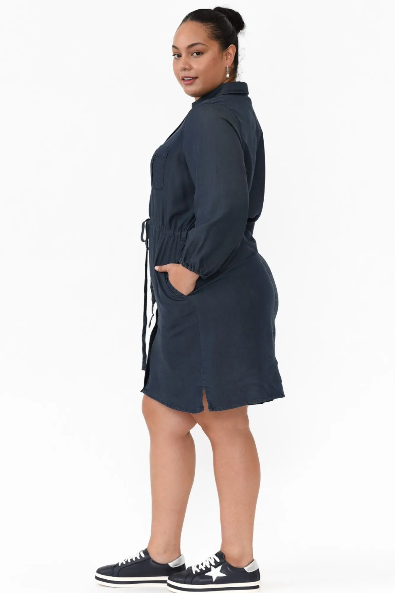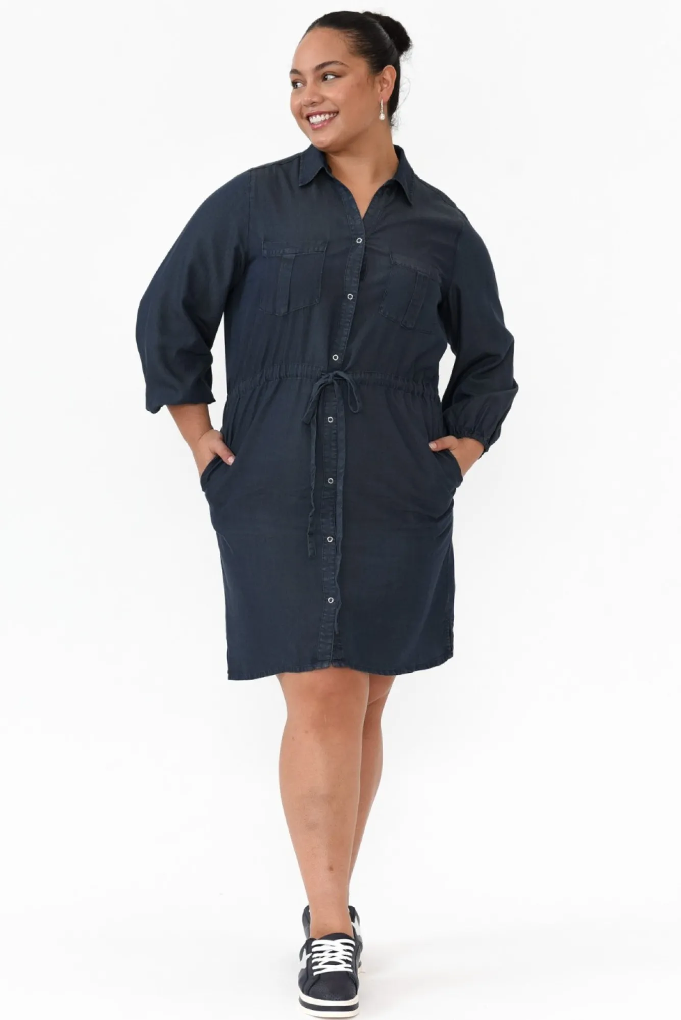 Fit: True To Size. Refer To Size & Fit Tab Below For Specific Size RecommendationNNfabric: 100% LyocellNdesigned Using Lightweight, Non-Stretch Denim-Look Fabric With A Soft Hand Feel And Slight SheenNv-Neck Complemented By A Collar And Snap Button FrontNdrawstring Waist Creates Shape Through The MidlineNtwo Functional Breast PocketsNfull-Length Puff Sleeves Finished With An Elastic Cuff Na-Line Silhouette Flows Over CurvesNNtwo Discreet Hip Pockets NNstraight Hem Falls To An Above-Knee LengthNNcare: Cool Gentle Machine Wash RecommendedNNcolour: Navy Blue
