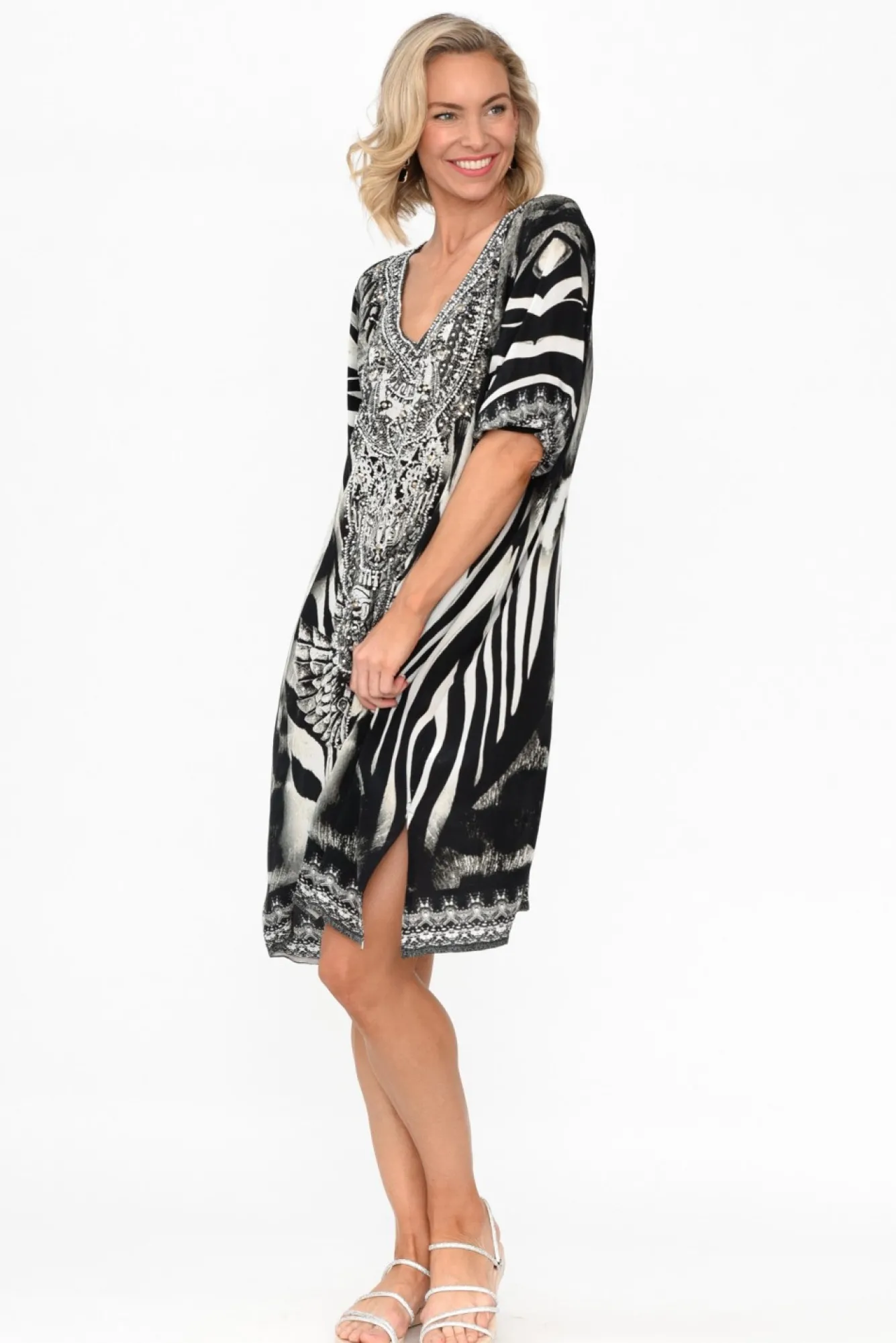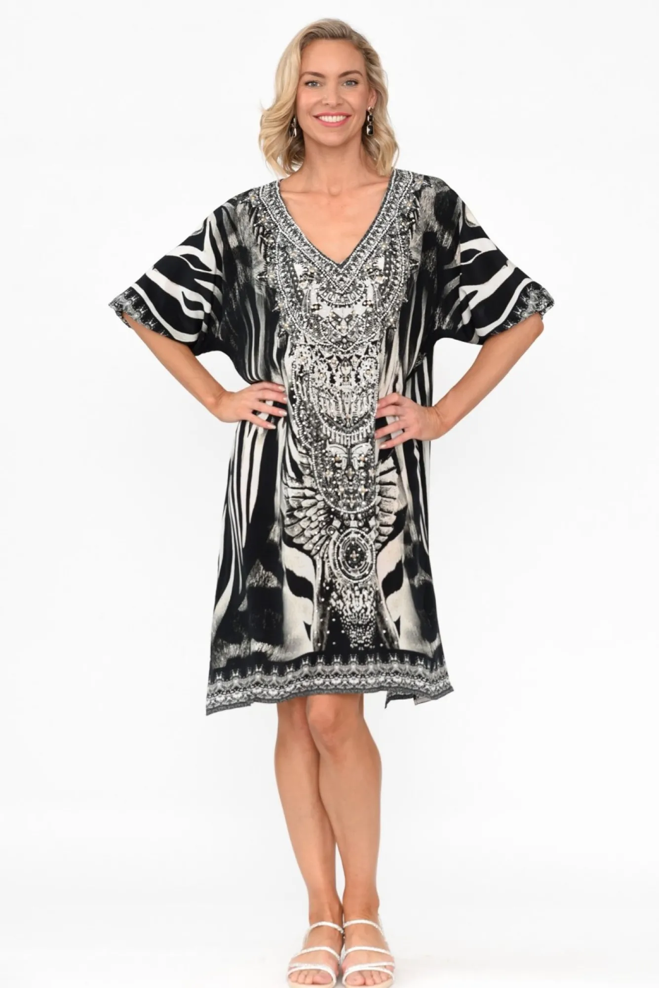 Fit: True To Size. Refer To Size & Fit Tab Below For Specific Size RecommendationNNfabric: 100% SilkNcrafted From 100% Silk Fabric, Designed With An Elevated Sheen And Lightweight FeelNNsharp V-Neckline Enhanced By Embellished Border Detailing NNbillowy Half Sleeves With An Elasticated Cuff NNbreezy Drape Silhouette Creates A Subtle Handkerchief Style Hem NNfeaturing Small Side Splits For Increased Drape Nhemline Falls Just Above Knee LengthNNNcare: Specialist Dry Clean OnlyNNcolour: Oversized Animal-Inspired Print In Black Hues