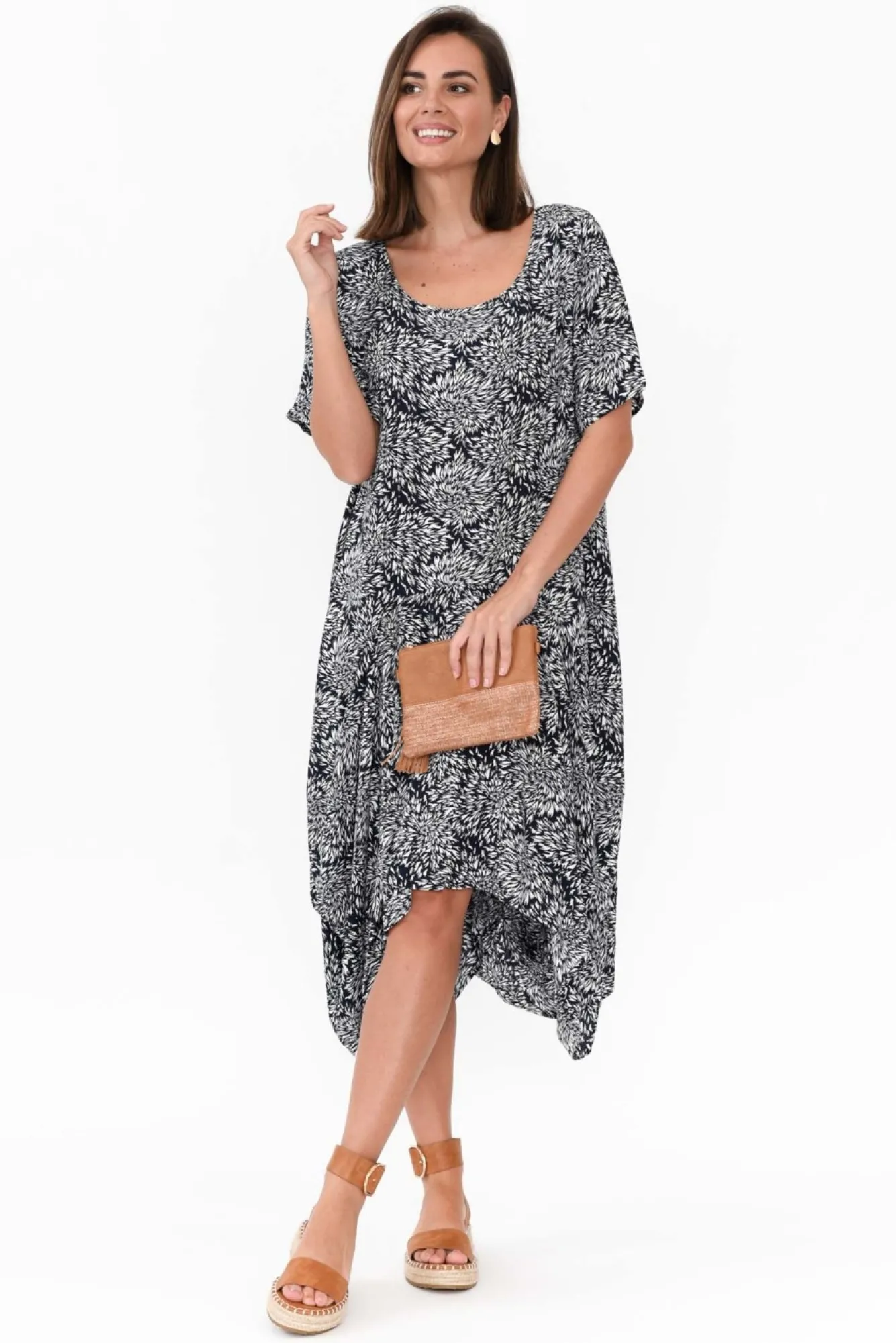 Fit: True To Size. Refer To Size & Fit Tab Below For Specific Size Recommendation NNfabric: 100% RayonNlightweight, Non-Stretch Fabric With A Lovely Smooth Hand FeelNNrounded Neckline Sits Just Below The CollarbonesNNstraight Half-Length Sleeves NNrelaxed A-Line SilhouetteNfeature Curve Seam Detail Creates Tulip-Like Skirt Nasymmetric Hi-Lo Hemline Falls To Knee Length NNNcare: Cool Gentle Hand Wash RecommendedNNcolour: Deep Navy Base With Ornate White Abstract Print