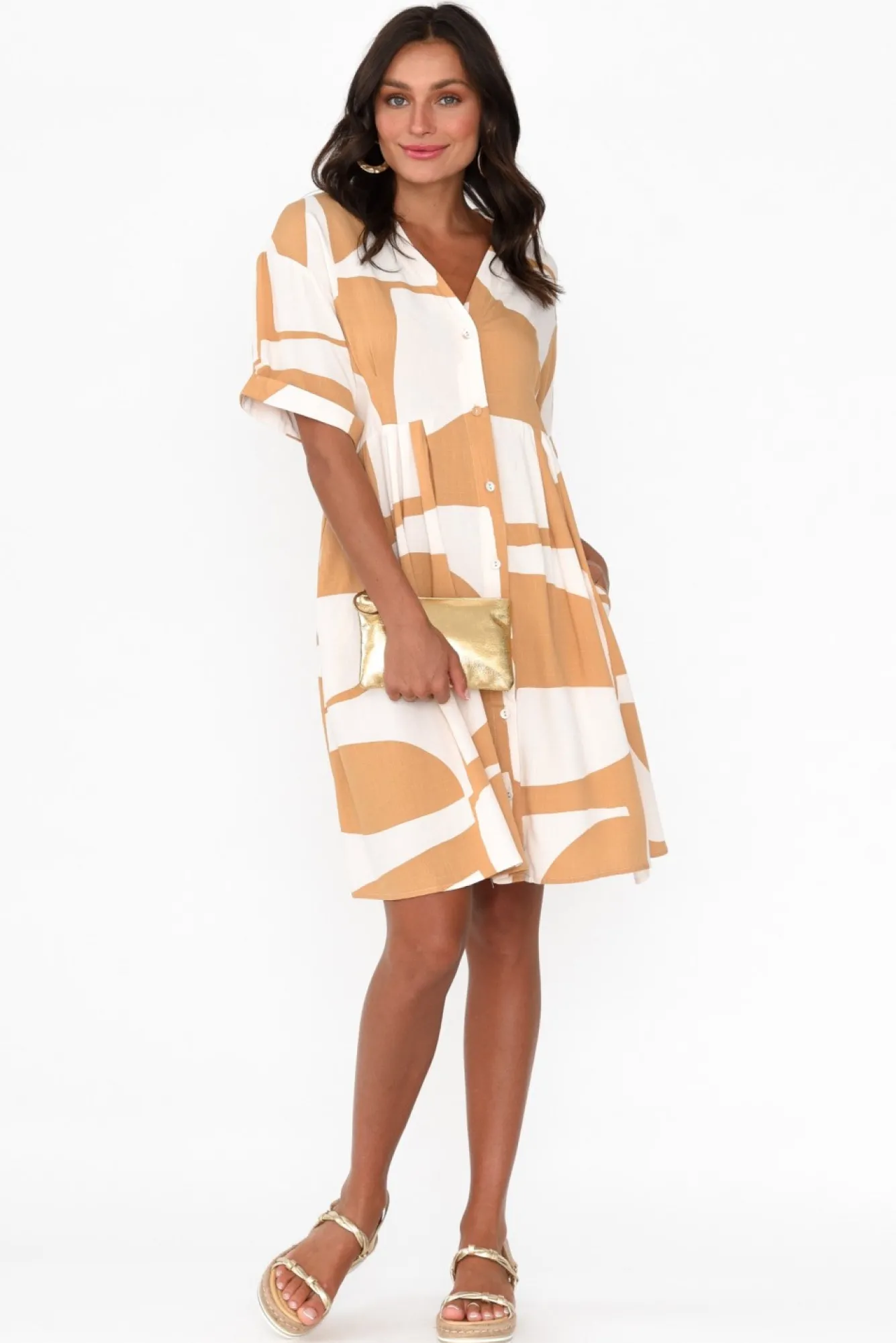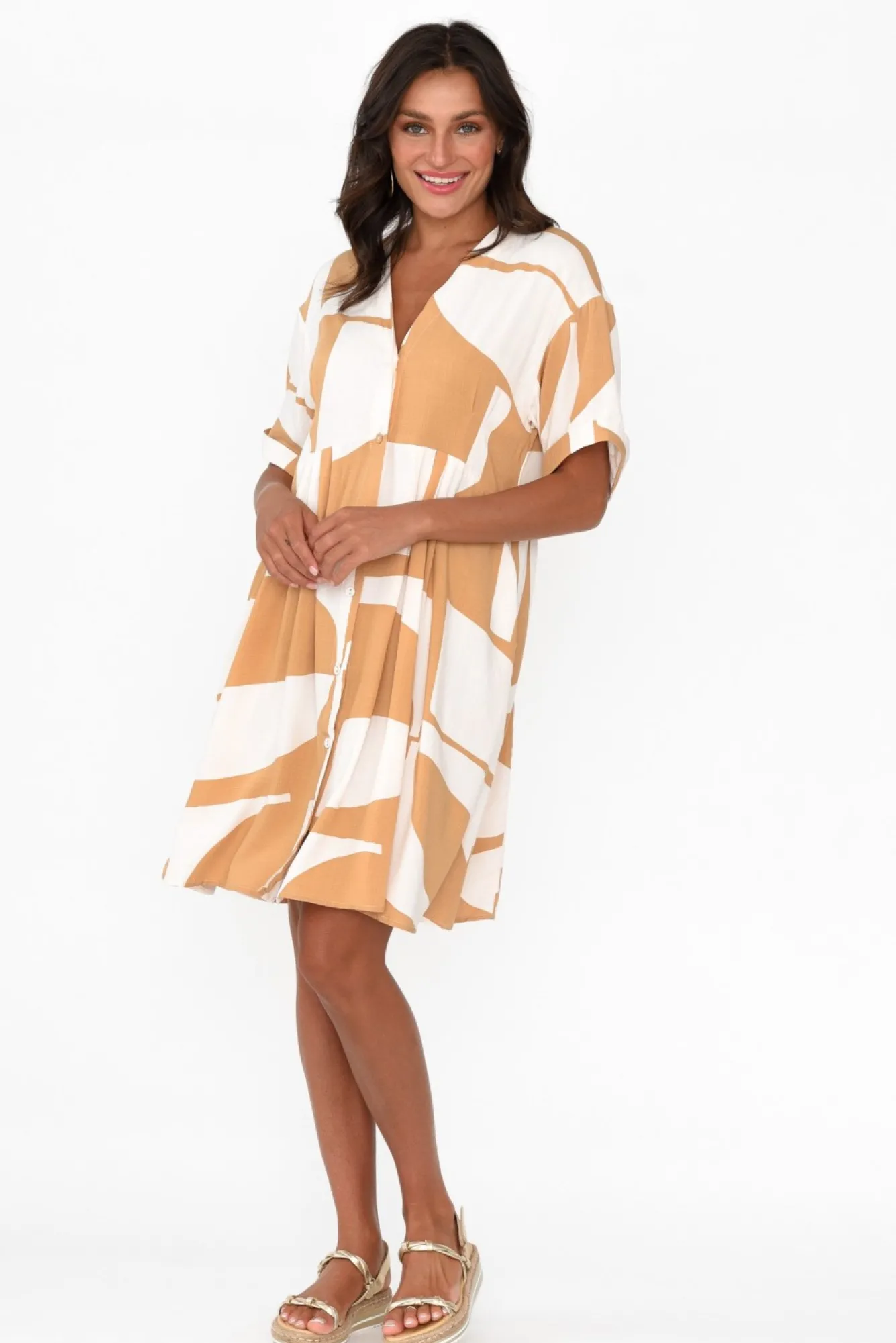Fit: True To Size. Refer To Size & Fit Tab Below For Specific Size RecommendationNNfabric: 100% RayonNmade From Lightweight, Non-Stretch Rayon With A Soft And Smooth Hand Feel Nsoft V-Neckline Leads To A Button-FrontNNstraight Half-Length Sleeves With A Fixed Cuff Detail NNbreezy A-Line Silhouette With Soft Gathered Waist Seam NNtwo Discreet Hip Pockets NNstraight Hemline Falls Above Knee LengthNNNcare: Cool Gentle Hand Wash RecommendedNNcolour: Oversized Tan And White Abstract Print