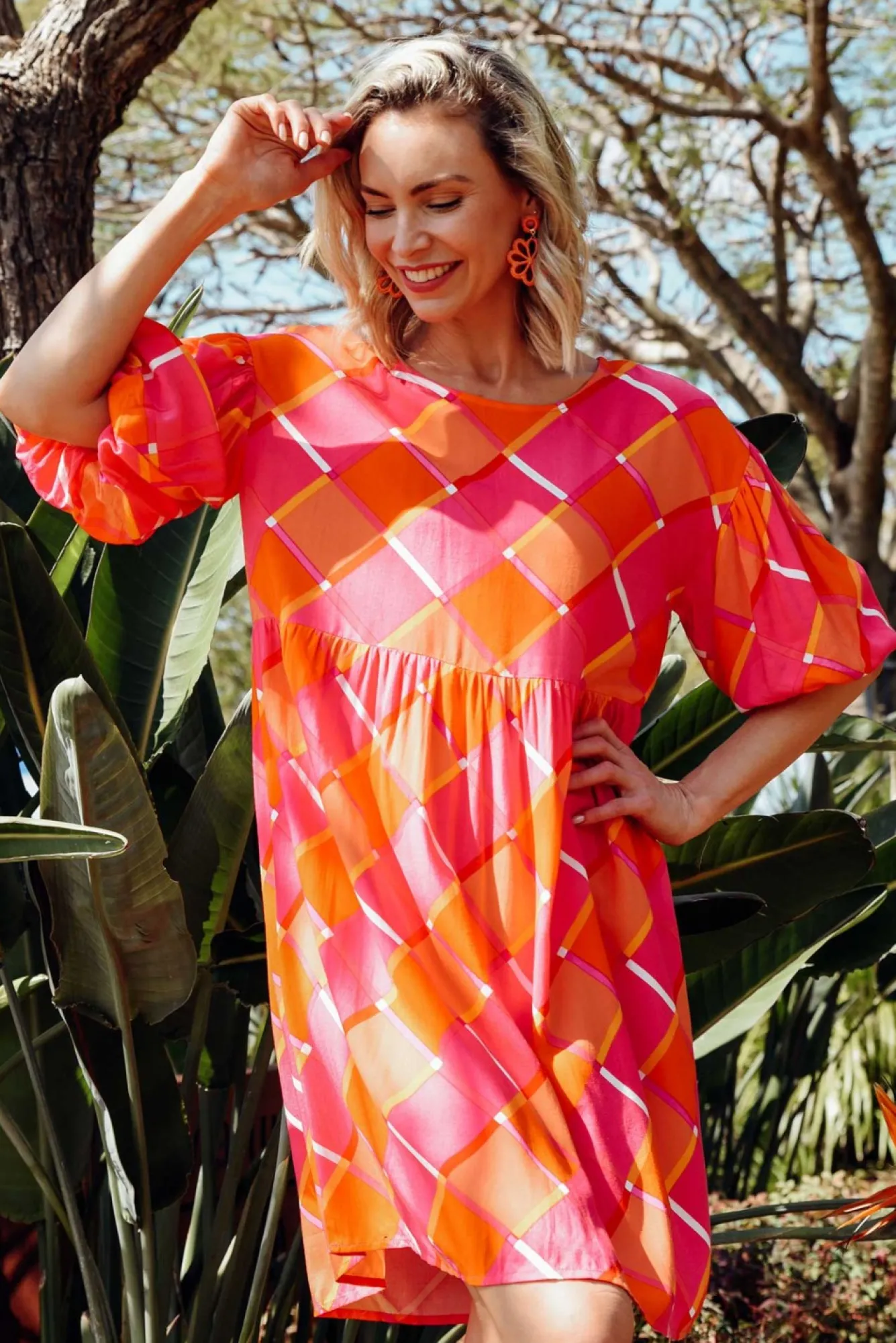 Fit: True To Size. Refer To Size & Fit Tab Below For Specific Size RecommendationNNfabric: 100% RayonNsmooth, And Lightweight Rayon Fabric Glides Down The BodyNNthe Rounded Neckline Sits Just Below The CollarbonesNNsmall Keyhole Cut Out With A Button Sits At The Nape Of The NeckNpuffy Half-Length Sleeves For An Effortlessly Feminine LookNsimple A-Line Silhouette Is Defined By An Underbust SeamNNsummery Above Knee Length NNNcare: Cool Gentle Hand Wash RecommendedNNcolour: Bold Geometric Pattern In Shades Of Pink And Orange