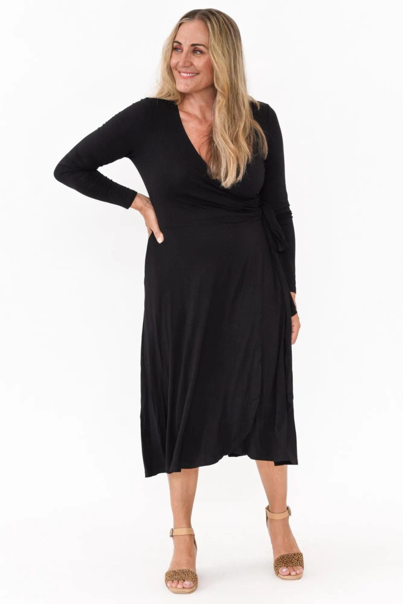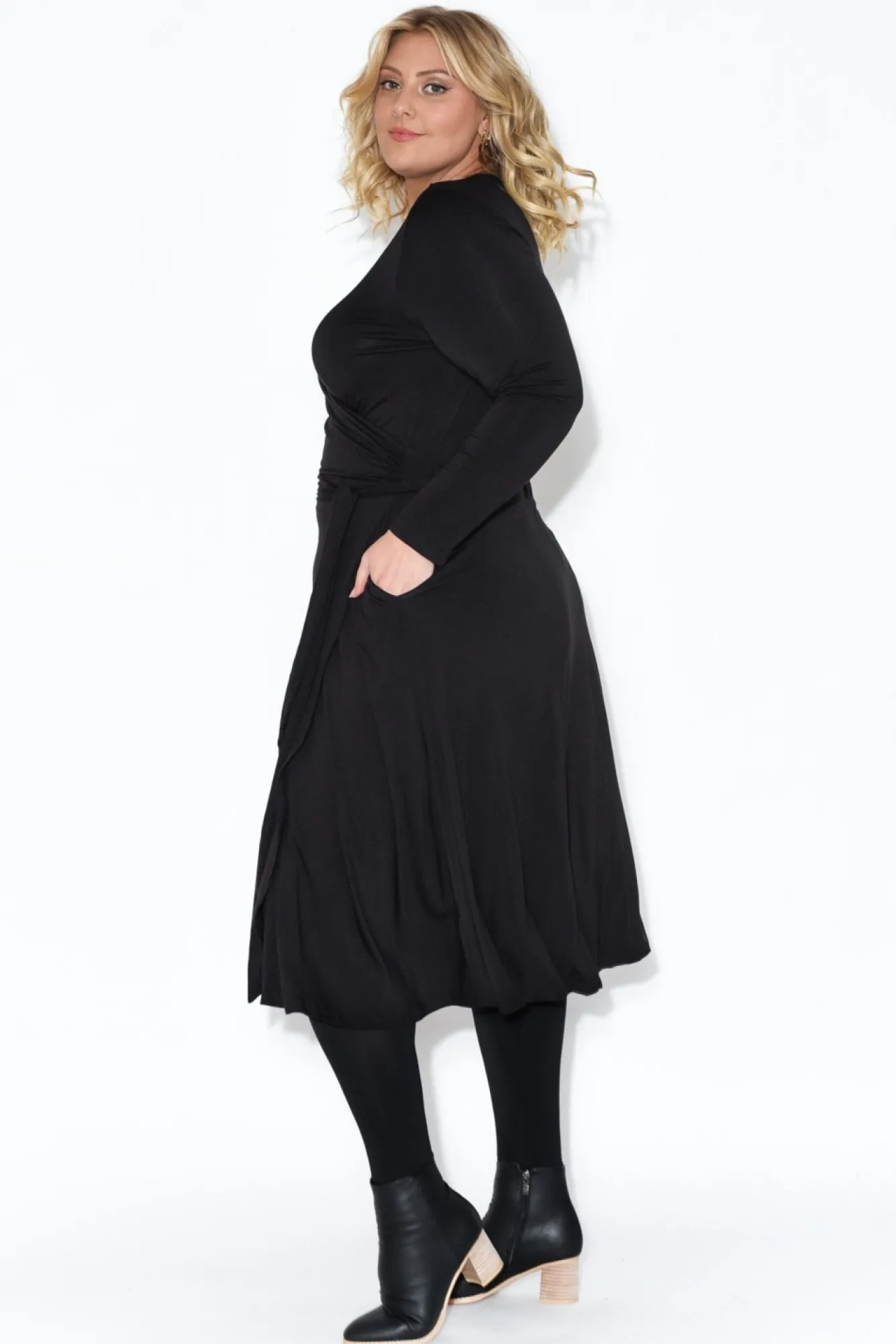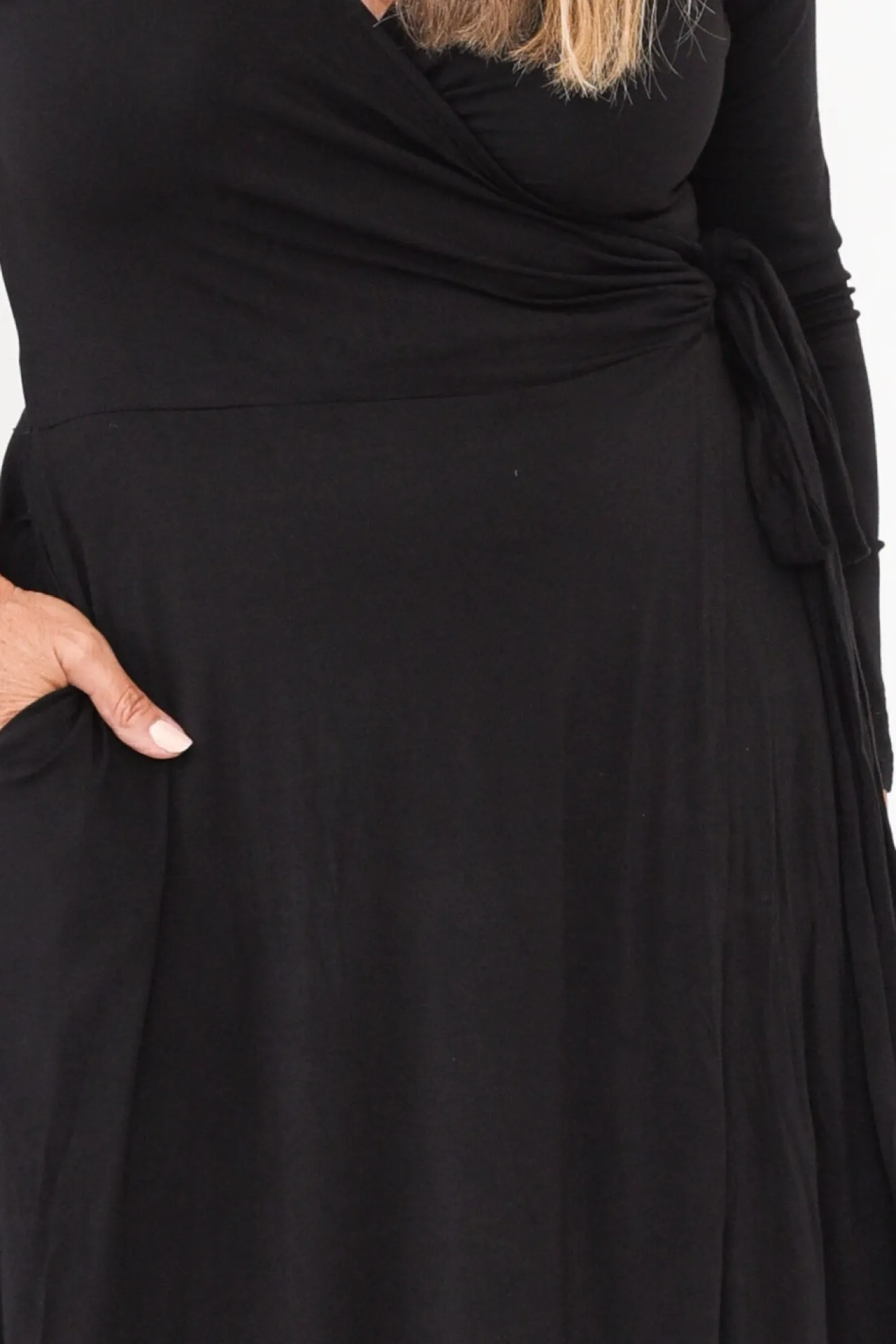 Fit: True To Size. Refer To Size & Fit Tab Below For Specific Size Recommendation NNfabric: 100% BambooNluxurious And Stretchy Lightweight Bamboo Fabric With A Silky Smooth FeelNbamboo Is Moisture-Wicking, Hypo-Allergenic, And Thermoregulating Making It The Perfect Year-Round Fabric!Nwrap Crossover Style Makes A Deep V NecklineNNtrue Wrap Dress Design With Waist Ties Able To Tie In A Bow At The Front Or BackNtwo Concealed Side Hip PocketsNNhemline Hits A Below Knee LengthNNNcare: Cool Gentle Hand Wash RecommendedNNcolour: Classic Black Colour