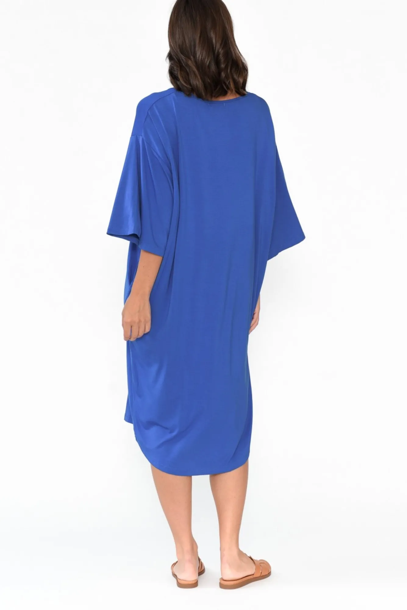Fit: Relaxed Fit. Refer To Size & Fit Tab Below For Specific Size RecommendationNNfabric: 95% Bamboo Viscose, 5% SpandexNultra-Breathable, Stretchy And Midweight Bamboo Fabric With A Lovely Soft And Smooth Hand Feel NNfeature Wide Round Neckline NNwide 3/4 Length Sleeves Accentuated By Drop Shoulder SeamNrelaxed T-Shirt Dress Silhouette With Subtle Tapering Towards The HemNNpractical Side Seam Pockets NNsubtle Hi-Lo Hemline Falls To The KneeNNNcare: Cool Gentle Machine Wash RecommendedNNcolour: Vibrant Cobalt Hue