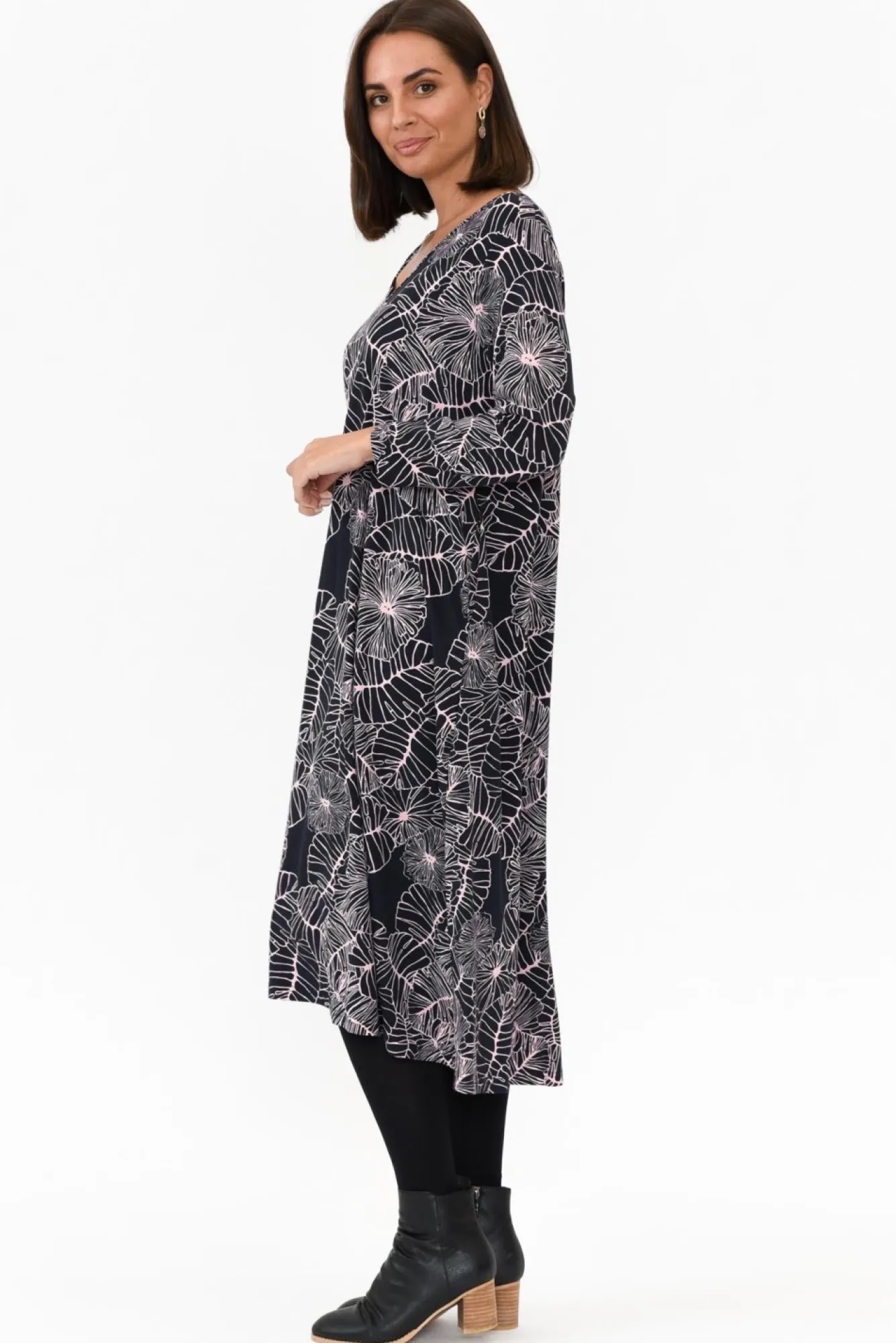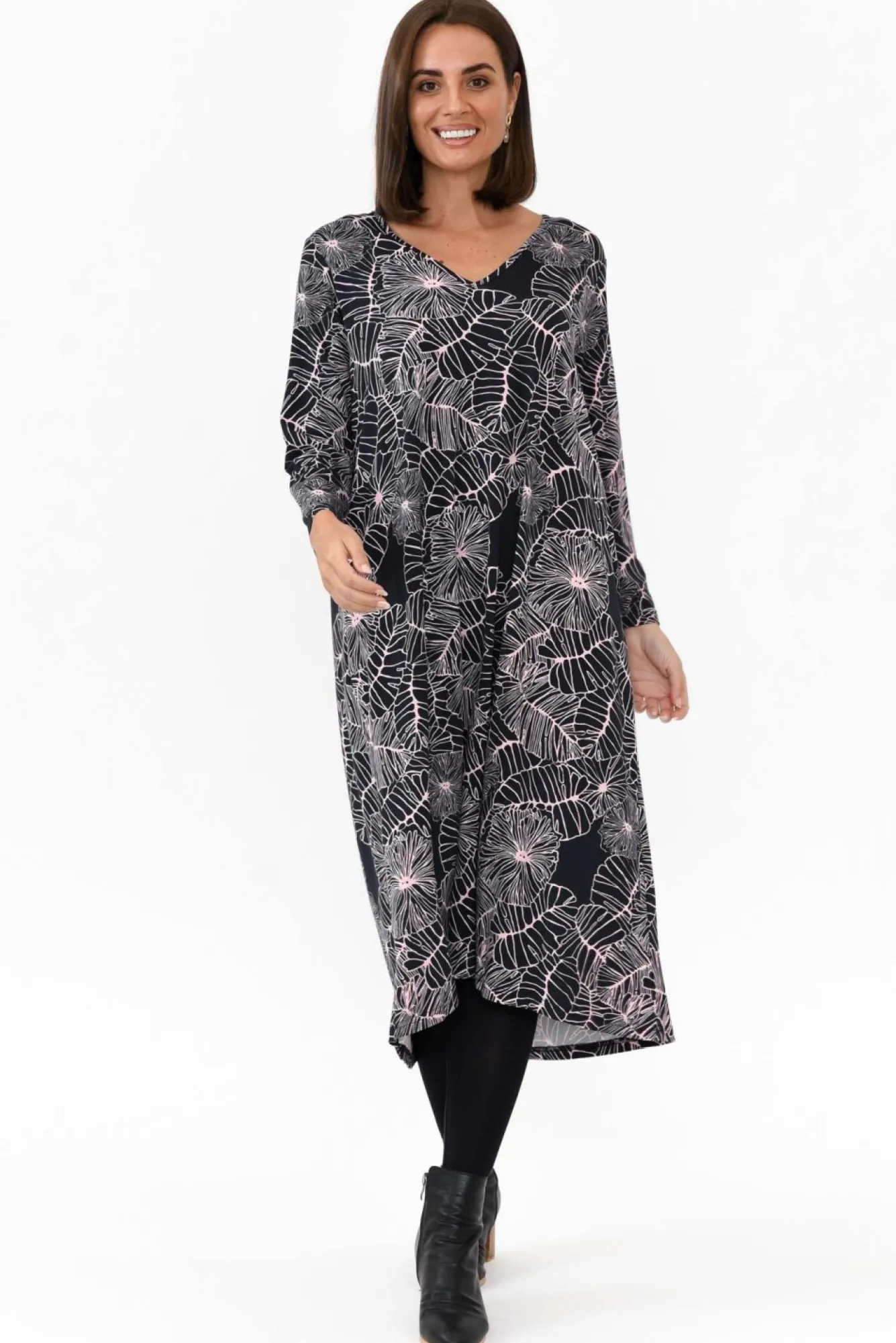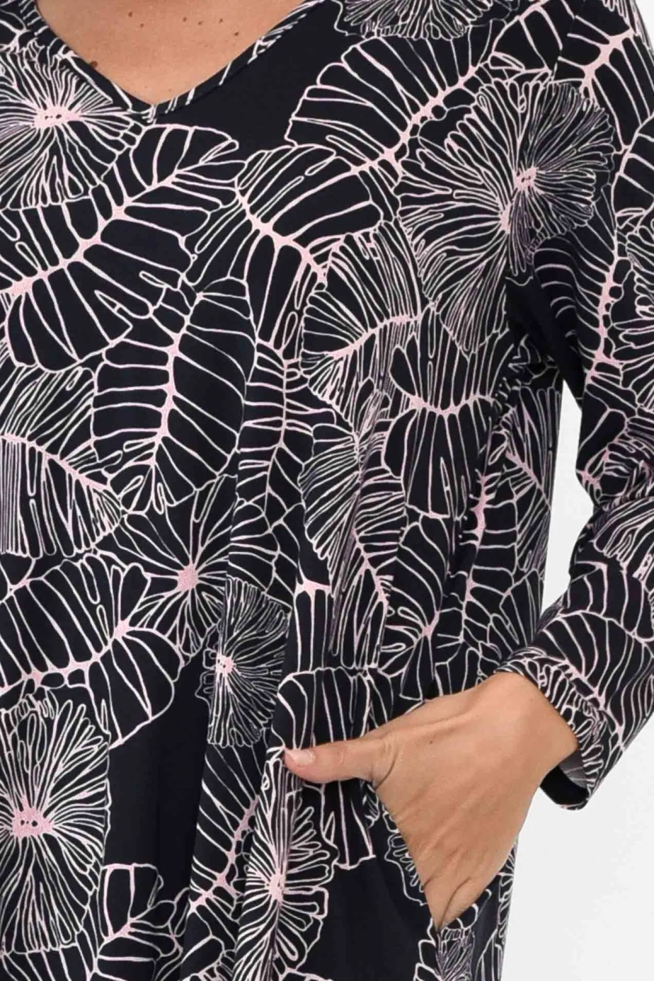Fit: True To Size. Refer To Size & Fit Tab Below For Specific Size RecommendationNNfabric: 95% Bamboo Viscose, 5% SpandexNa Wardrobe Staple Designed Using Lightweight, Breathable And Stretchy Bamboo Jersey Fabric NNsharp V-Neckline Complements The 3/4 Length Sleeves NNclassic A-Line Silhouette For An Effortlessly Elegant LookNtwo Handy Side Seam Pockets Located Near The Hips NNstraight Hemline Falls Below Knee Length NNNcare: Cool Gentle Machine Wash RecommendedNNcolour: Navy With A Dainty Lilac Garden Overlay