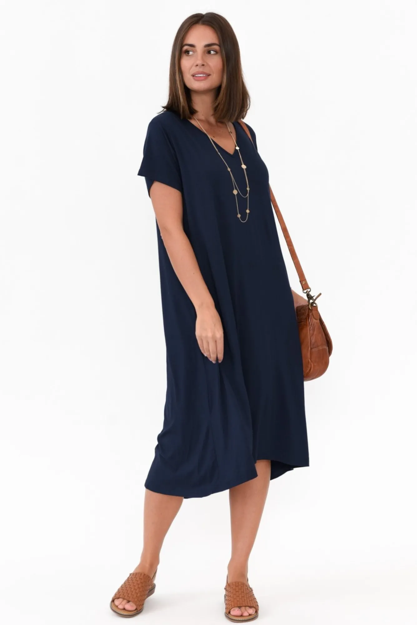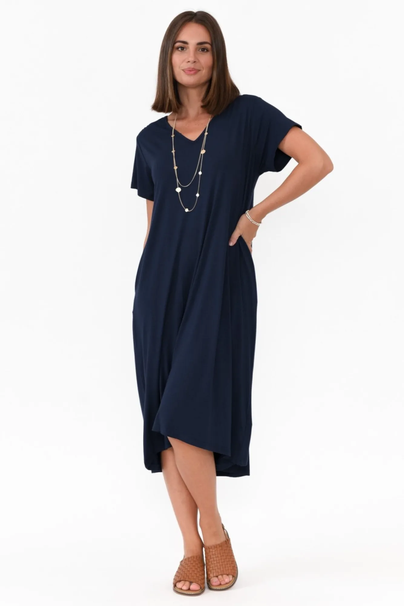 Fit: Oversized. Refer To Size & Fit Tab Below For Specific Size RecommendationNNfabric: 95% Bamboo Viscose, 5% SpandexNluxurious Lightweight Bamboo Fabric Boasts Stretch And Breathability Nclassic Tee Style Dress With A Flattering V-Neckline And Short SleeveNtwo Internal Hip PocketsNsubtle Hi-Lo HemlineNbelow-Knee LengthNNcare: Cool Gentle Machine Wash RecommendedNNcolour: Classic Navy Shade