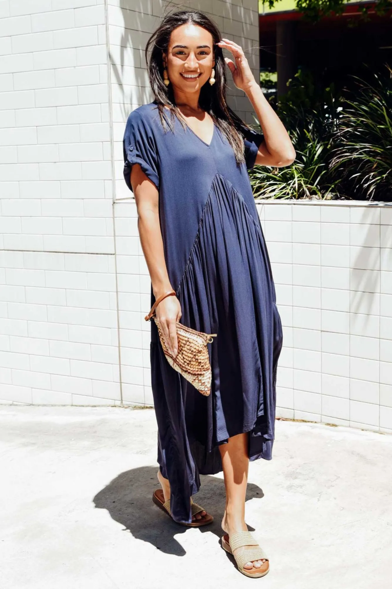 Fit: Oversized. Refer To Size & Fit Tab Below For Specific Size RecommendationNNfabric: 100% RayonNlightweight, Soft Fabric Without StretchNv-NecklineNhalf Sleeve Length Can Be Rolled And Secured With Button DetailNgathered Peak Detail Under Bust For A Flattering FitNflared, A-Line Silhouette With Peak PanelNmaxi LengthNNcare: Cool Gentle Machine Wash RecommendedNNcolour: Deep Navy ToneNNnote: Please See Photos Rather Than Video For Most Accurate Colour.