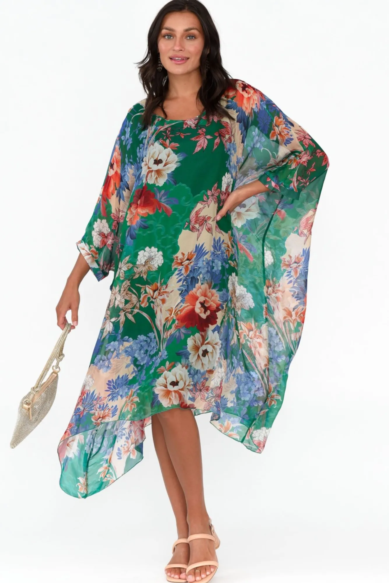 Fit: True To Size. Refer To Size & Fit Tab Below For Specific Size RecommendationNNfabric: Outer: 70% Viscose, 30% Silk Lining: 93% Cotton, 7% ElastaneNultra-Lightweight And Breezy Silk Blend Fabric With An Elegant Sheen NNfeaturing A Full Singlet Lining Made From Soft And Stretchy Cotton Blend Fabric Nwide Boatneck Design Falls Below The Collarbones NNdramatic Batwing Sleeves For An Effortless Look NNtimeless Drape Silhouette Creates And Asymmetric Hemline NNfalls Just Below The Knee NNcare: Cool Gentle Hand Wash RecommendedNNcolour: Emerald Base With A Lush Floral Overlay