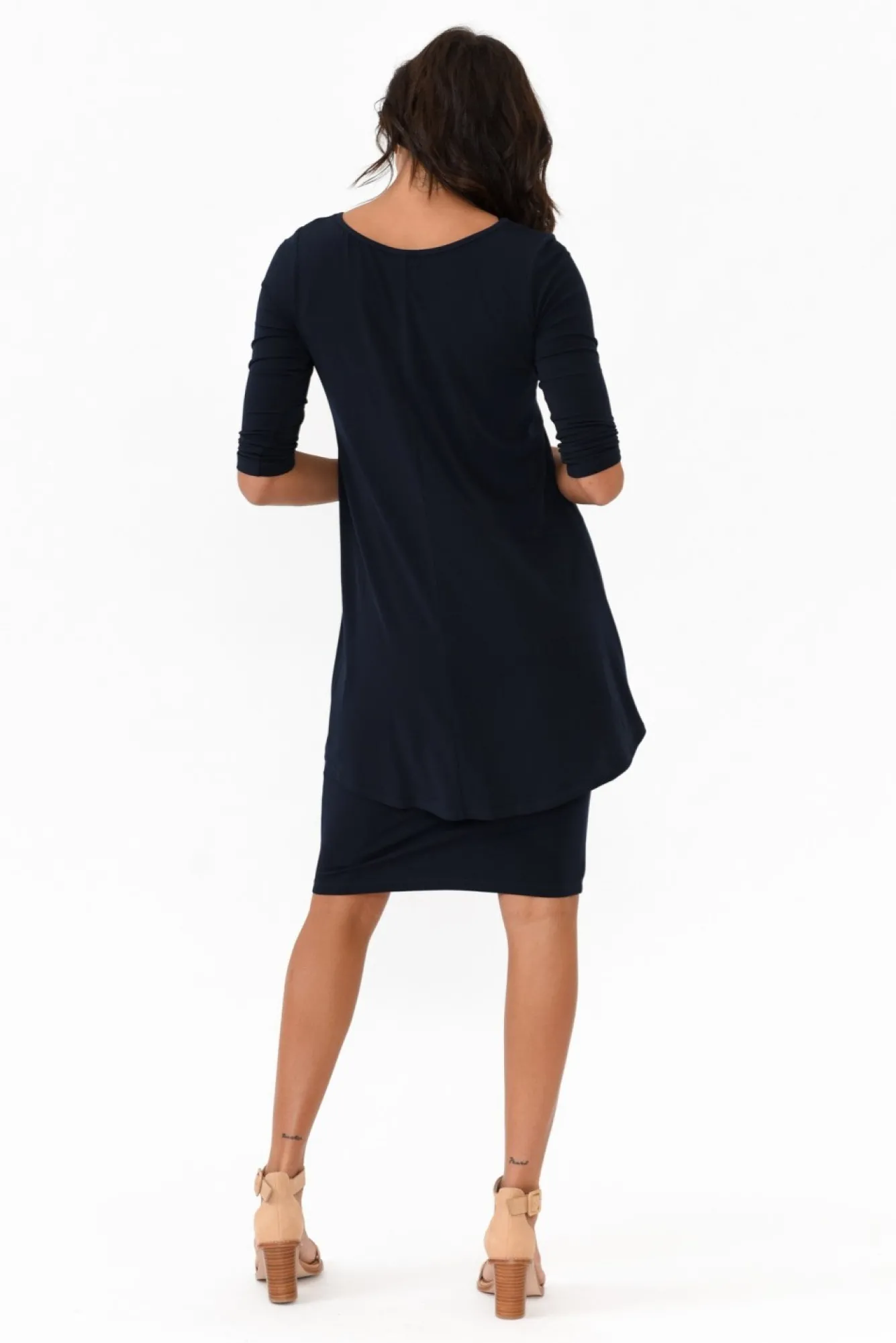 Fit: True To Size. Refer To Size & Fit Tab Below For Specific Size RecommendationNNfabric: Main: 95% Polyester, 5% Spandex Lining: Nylon MeshNproudly Made In AustraliaNstretchy And Comfortable Fabric With A Subtle Textured Feel And Lovely SheenNNmesh Singlet Lining Attaches The Two LayersNstriking V-Neckline Complements CollarbonesNNthree-Quarter-Length Sleeves Can Be Ruched To The Elbow NNunique Layered Design With A Draping Tunic Style Top Flowing To A Fitted Skirt – For All The Benefits Of A Two-Piece Outfit Without The Fuss!NNstraight Hem Falls To The KneeNNcare: Cool Gentle Machine Wash RecommendedNNcolour: True Navy Blue