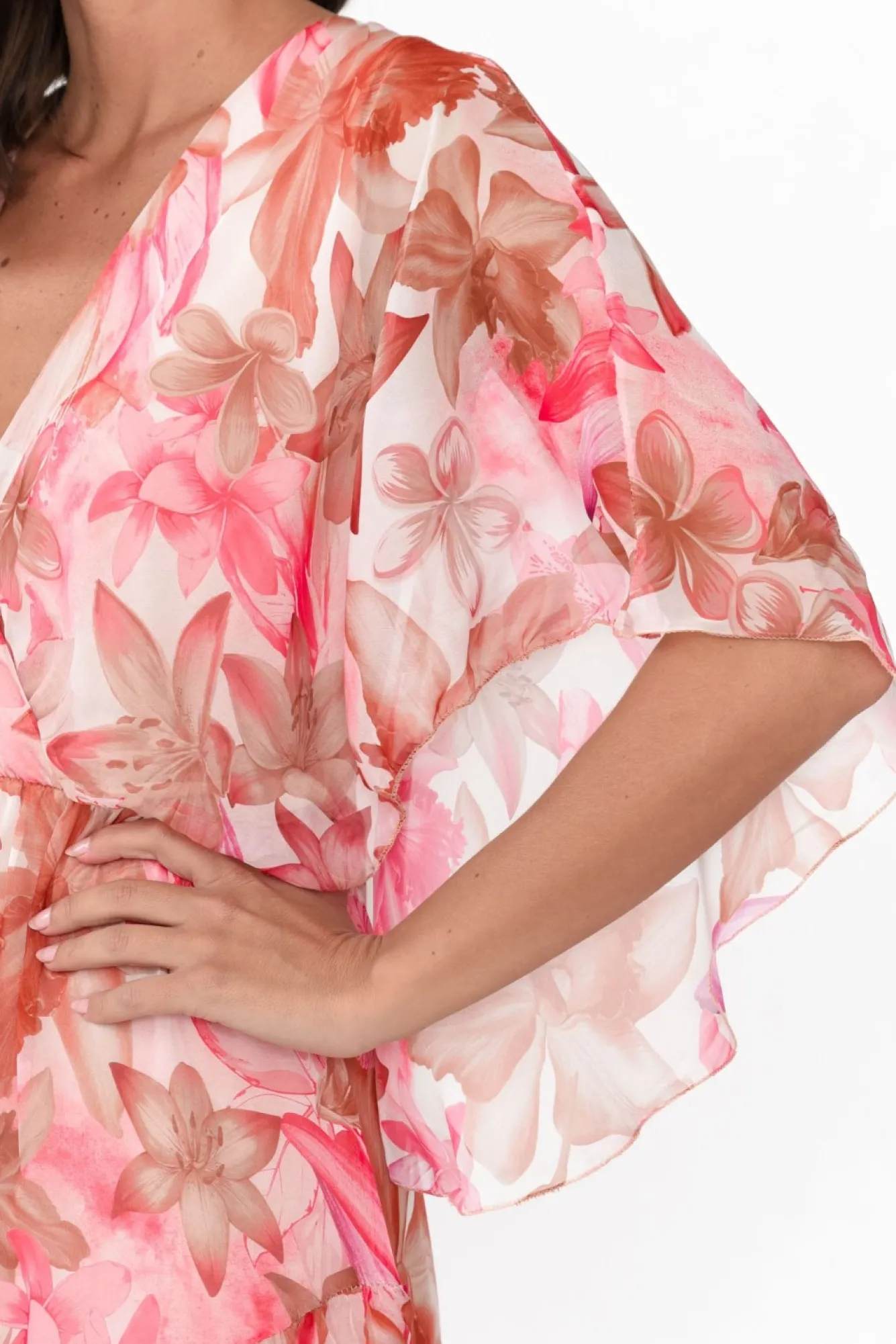 Fit: True To Size. Refer To Size & Fit Tab Below For Specific Size RecommendationNNfabric: Outer: 100% Chiffon Polyester, Lining: 95% Viscose, 5% Elastane Nmade In Italy From A Lightweight, Sheer Chiffon OverlayNfull-Length Singlet Lining With A Soft And Ultra-Stretchy FinishNchic V-Neckline Nstretch Waistline Is Comfortable And Figure-Flattering Nhalf-Length Sheer, Drape Sleeves Na-Line Silhouette With A Faux Wrap Detail And Frill Trim NNdrapes Just Below Knee Length NNNcare: Cool Gentle Hand Wash RecommendedNNcolour: Pink With A Feminine Floral Overlay