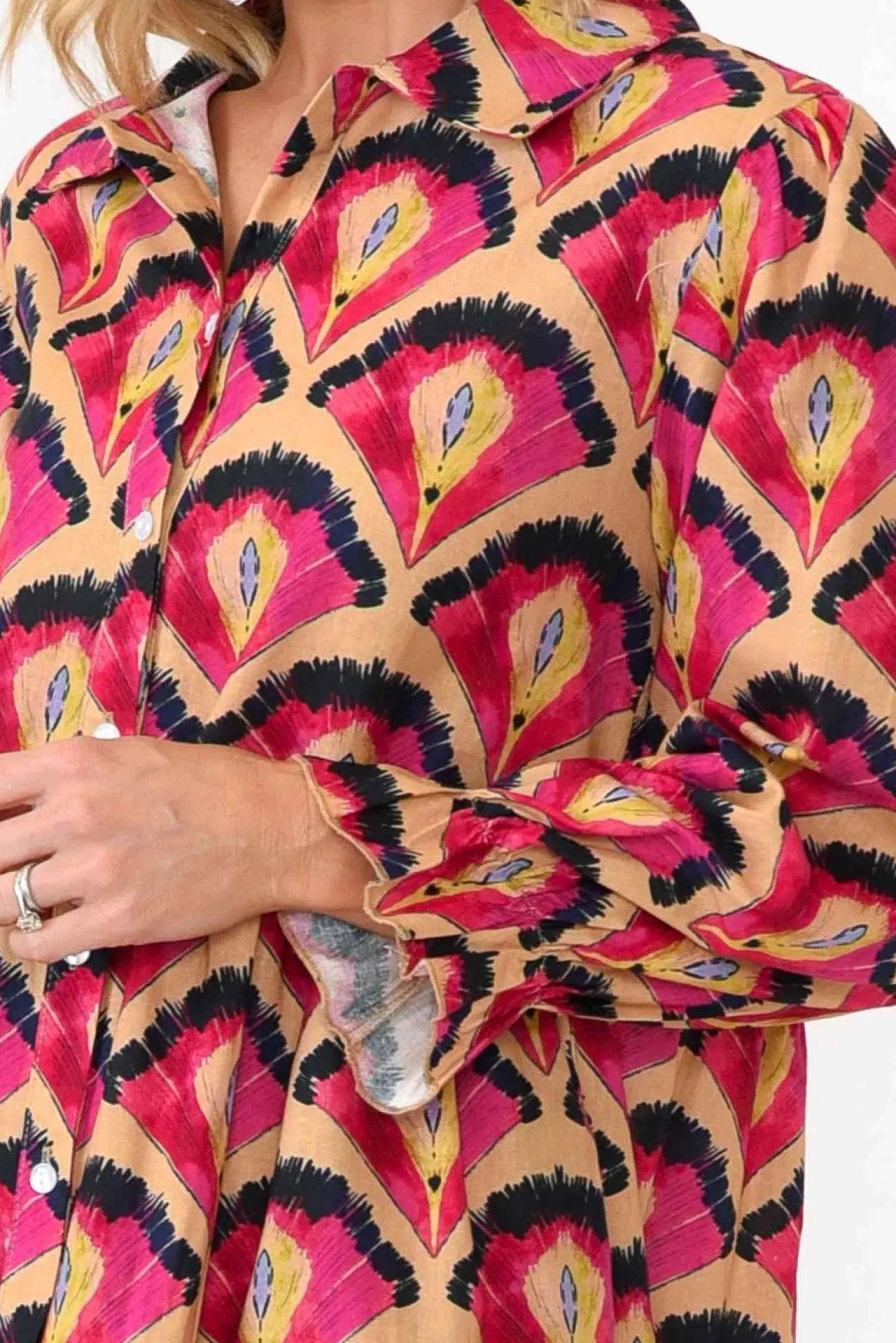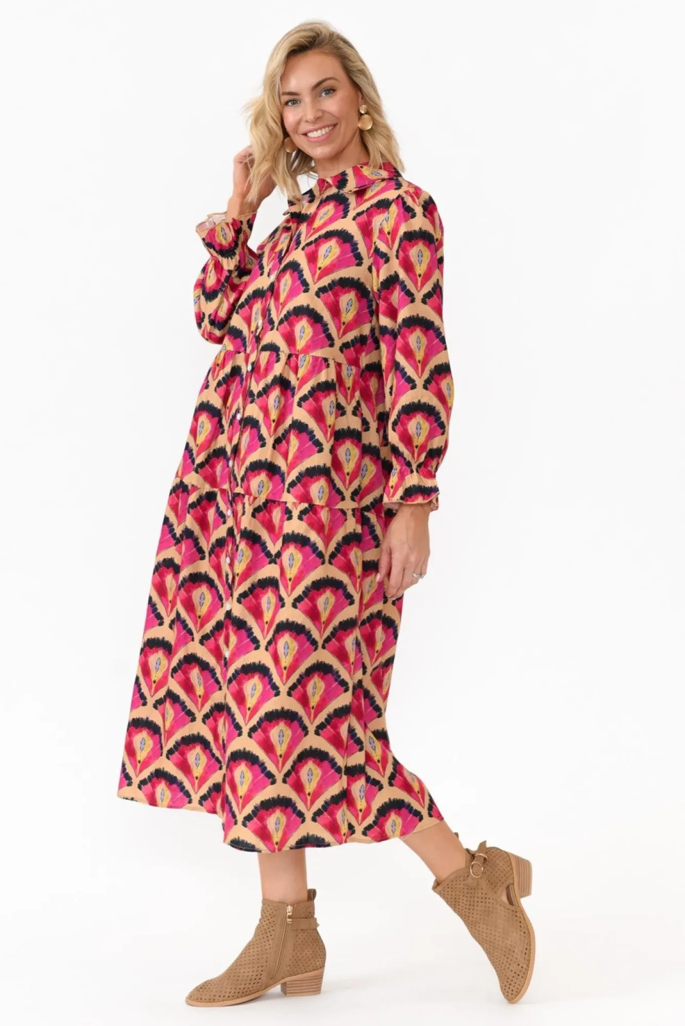 Fit: True To Size. Refer To Size & Fit Tab Below For Specific Size RecommendationNNfabric: 55% Linen, 45% CottonNquality Linen-Cotton Blend Offers Breathable, Non-Stretch And Lightweight Qualities, Along With A Woven Hand FeelNNcollared Neckline Flows Into A Button Front To Create A Timeless Shirt Style Design NNfull-Length Sleeves With An Elasticated, Frill CuffNNa-Line Silhouette With A Full Draping SkirtNNnon-Stretch Waist Seam Creates Flattering Shape Ntwo Hip Pockets Nstraight Hem Falls To A Midi LengthNNcare: Cool Gentle Hand Wash RecommendedNNcolour: Light Tan With A Bold Pink Geometric Print