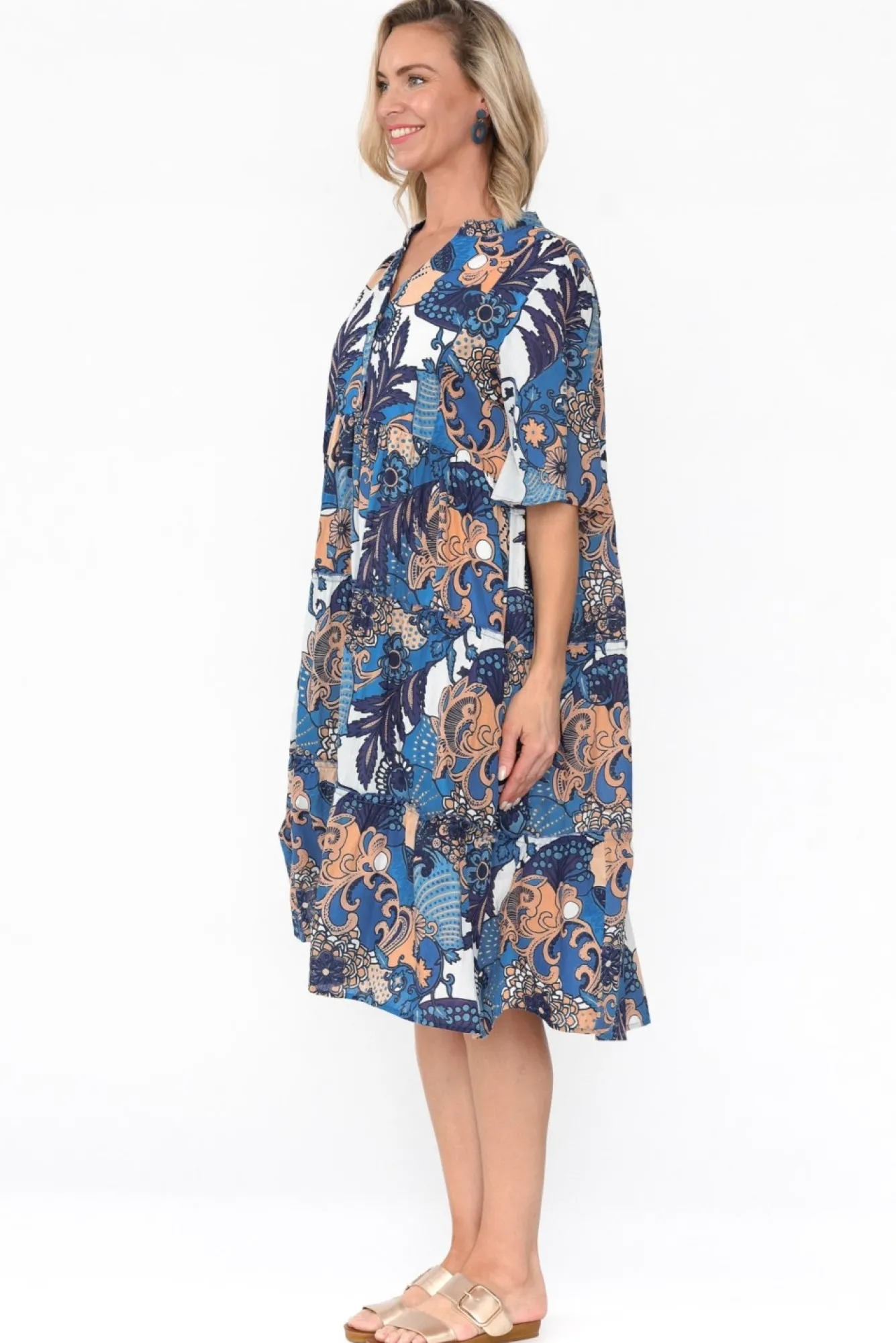 Fit: True To Size. Refer To Size & Fit Tab Below For Specific Size RecommendationNNfabric: 100% CottonNNlightweight, Breathable And Soft Cotton, Fully Lined For Added CoverageNNround, Banded Neckline With A V-Split And Double Button FrontNhalf-Length Straight Sleeves NNa-Line Silhouette Features Ruffled TiersNNpractical Design Features Two Hip PocketsNNstraight Hem Falls To The Knees NNNcare: Cool Gentle Hand Wash RecommendedNNcolour: Multicolour Blossom Pattern Featuring Navy, Tan And White
