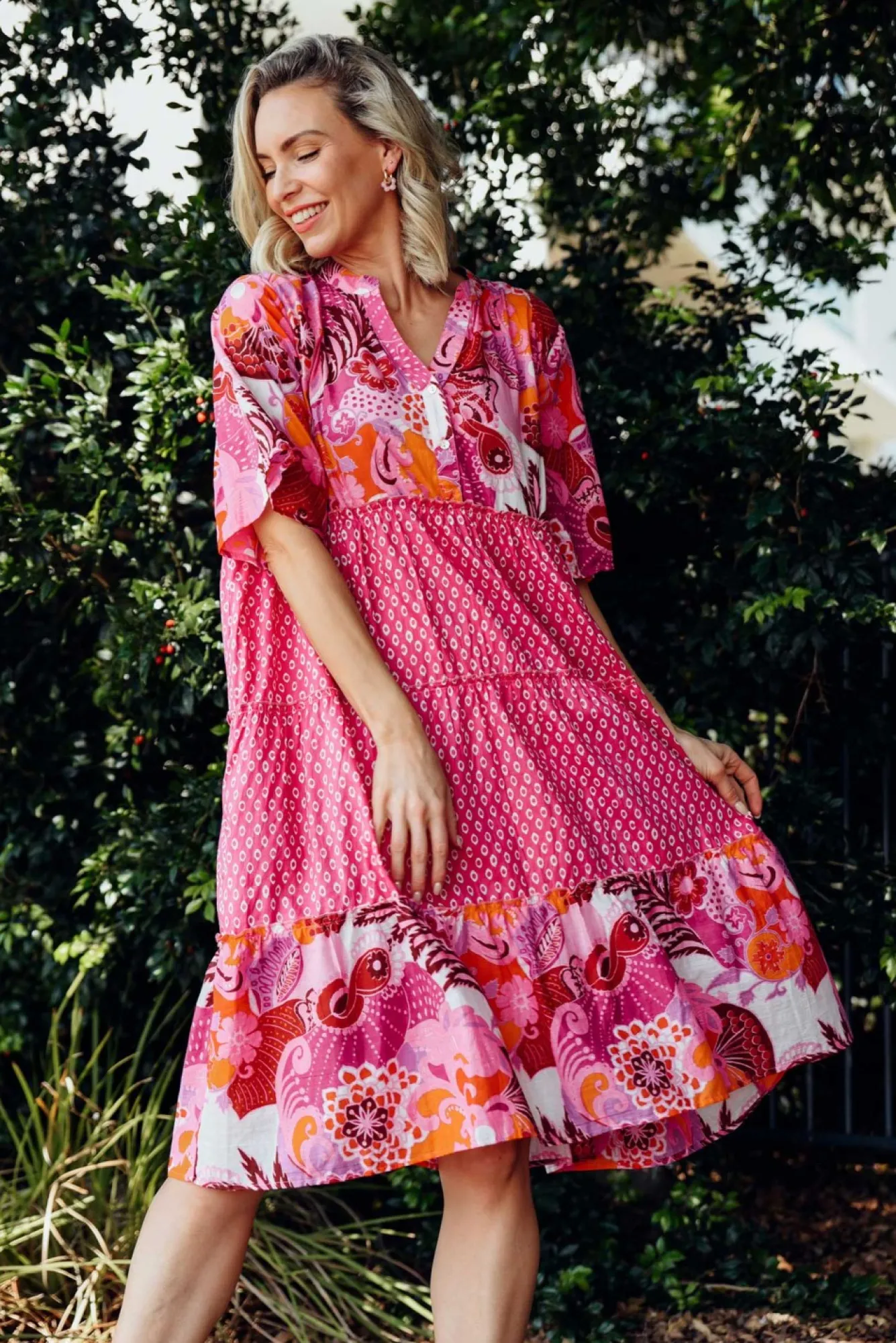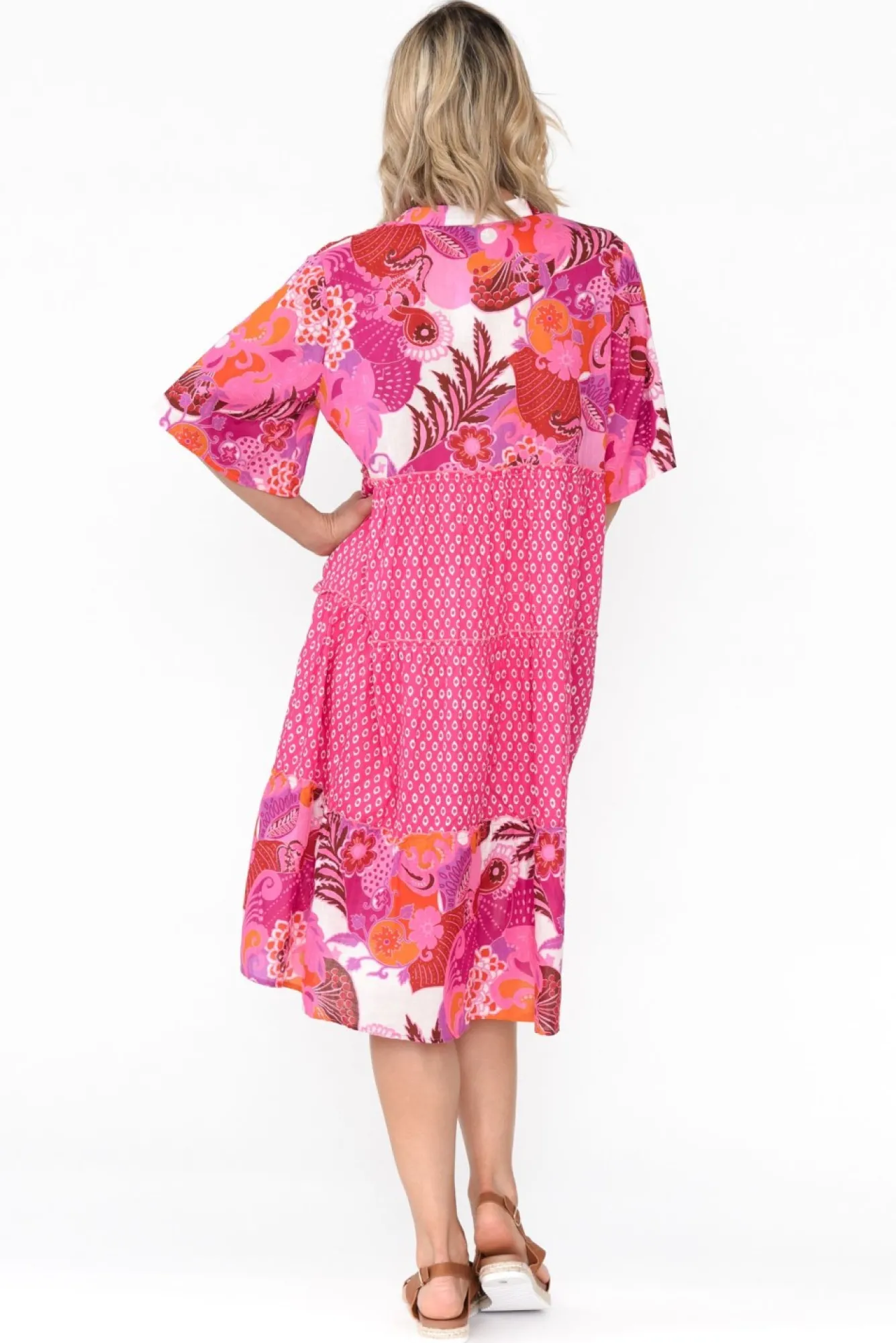 Fit: True To Size. Refer To Size & Fit Tab Below For Specific Size RecommendationNNfabric: 100% CottonNNlightweight, Breathable And Soft Cotton Featuring A Full Lining NNround, Banded Neckline With A V-Split And Double-Button FrontNstraight Sleeves Falls To The Elbow For Upper Arm CoverageNNa-Line Silhouette Features Ruffled TiersNNtwo Hip PocketsNNstraight Hem Falls To The Knees NNNcare: Cool Gentle Hand Wash RecommendedNNcolour: Print Block Design With A Pink Tropical Overlay At The Bust And Hem With A Pink Spot Pattern Through The Skirt