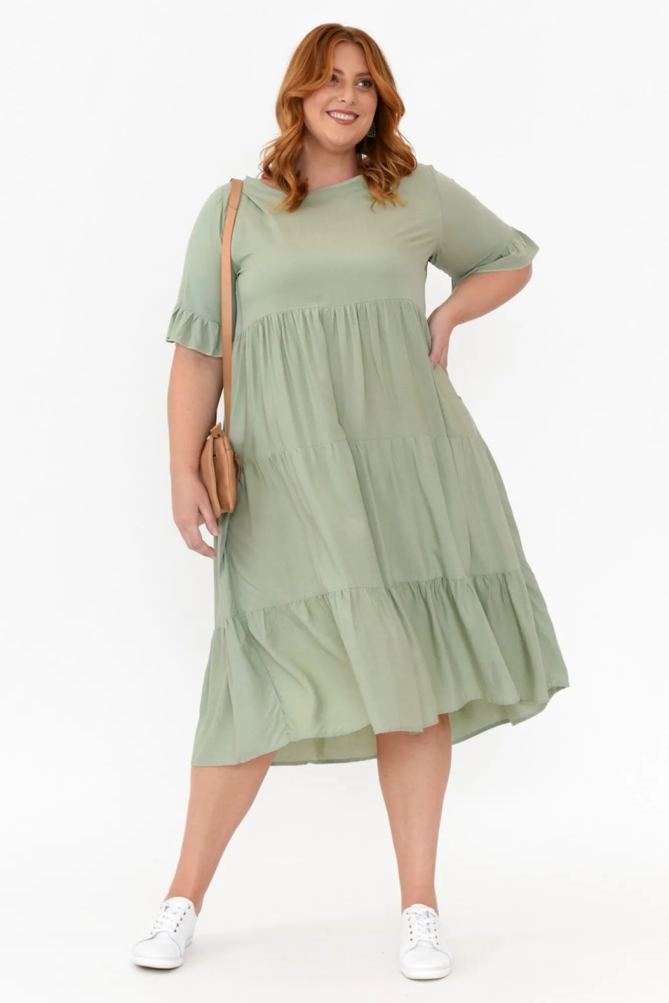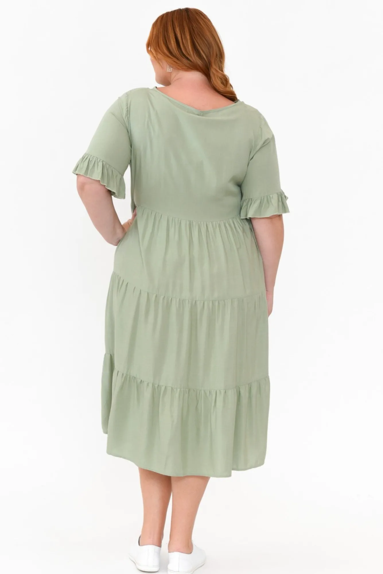 Fit: True To Size. Refer To Size & Fit Tab Below For Specific Size RecommendationNNfabric: 100% RayonNcomfortable, Lightweight Non-Stretch Fabric With A Soft Hand Feel NNround Neckline For A Timeless LookNNhalf-Length Sleeves Elevated With Frill Sleeve NNflattering Tiered A-Line Silhouette FeaturingNtwo Side Seam Pockets Located At The Hips Nfalls To Easy-To-Wear Midi Length NNNcare: Cool Gentle Hand Wash RecommendedNNcolour: Soft Sage ShadeNNNfit Tip: This Style Features A Non-Stretch Waist Seam That Must Fit Over Your Bust. If You Have A Larger Bust, We Suggest Sizing Up. Please Consult The Size & Fit Tab Below To Determine The Size Best For You.
