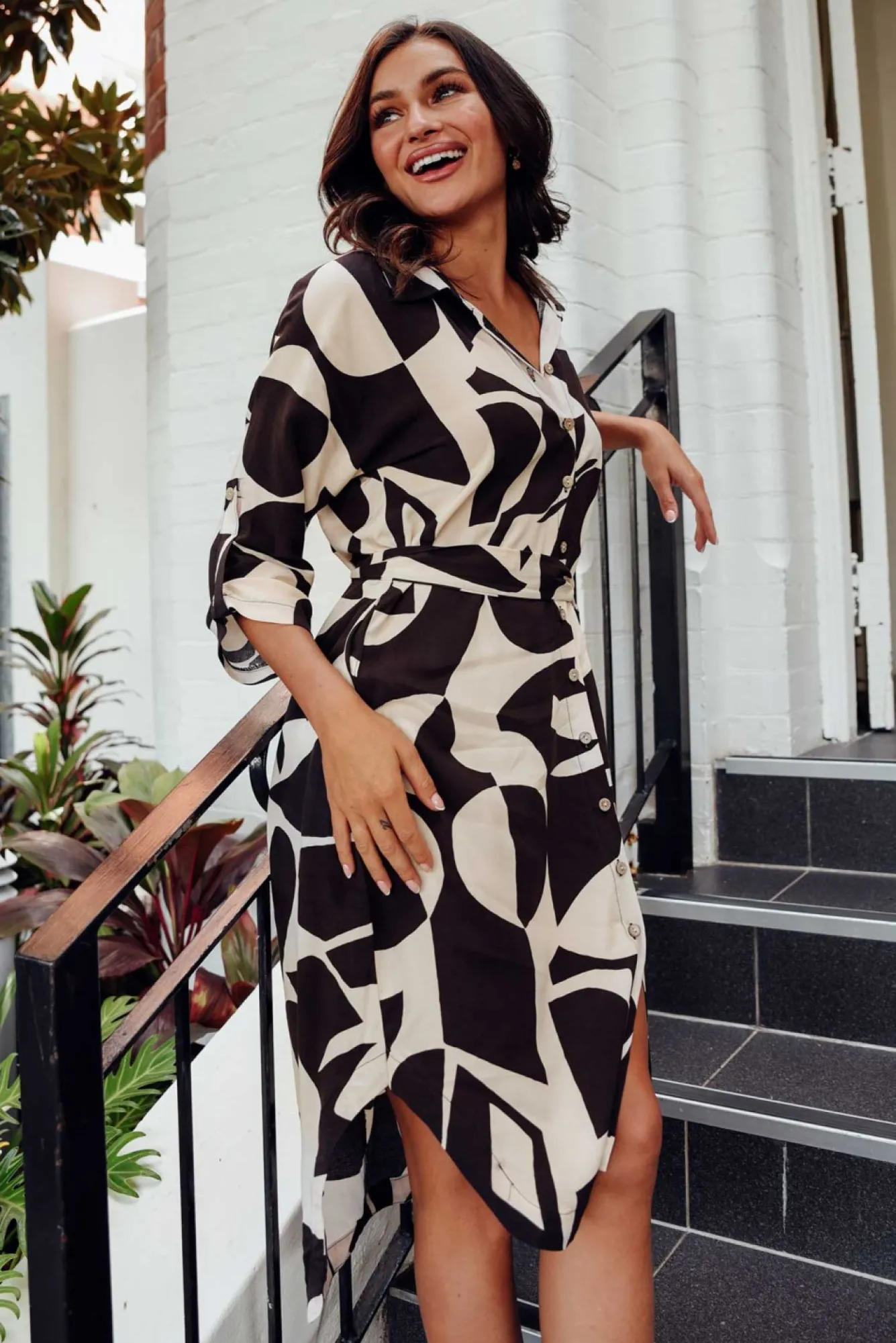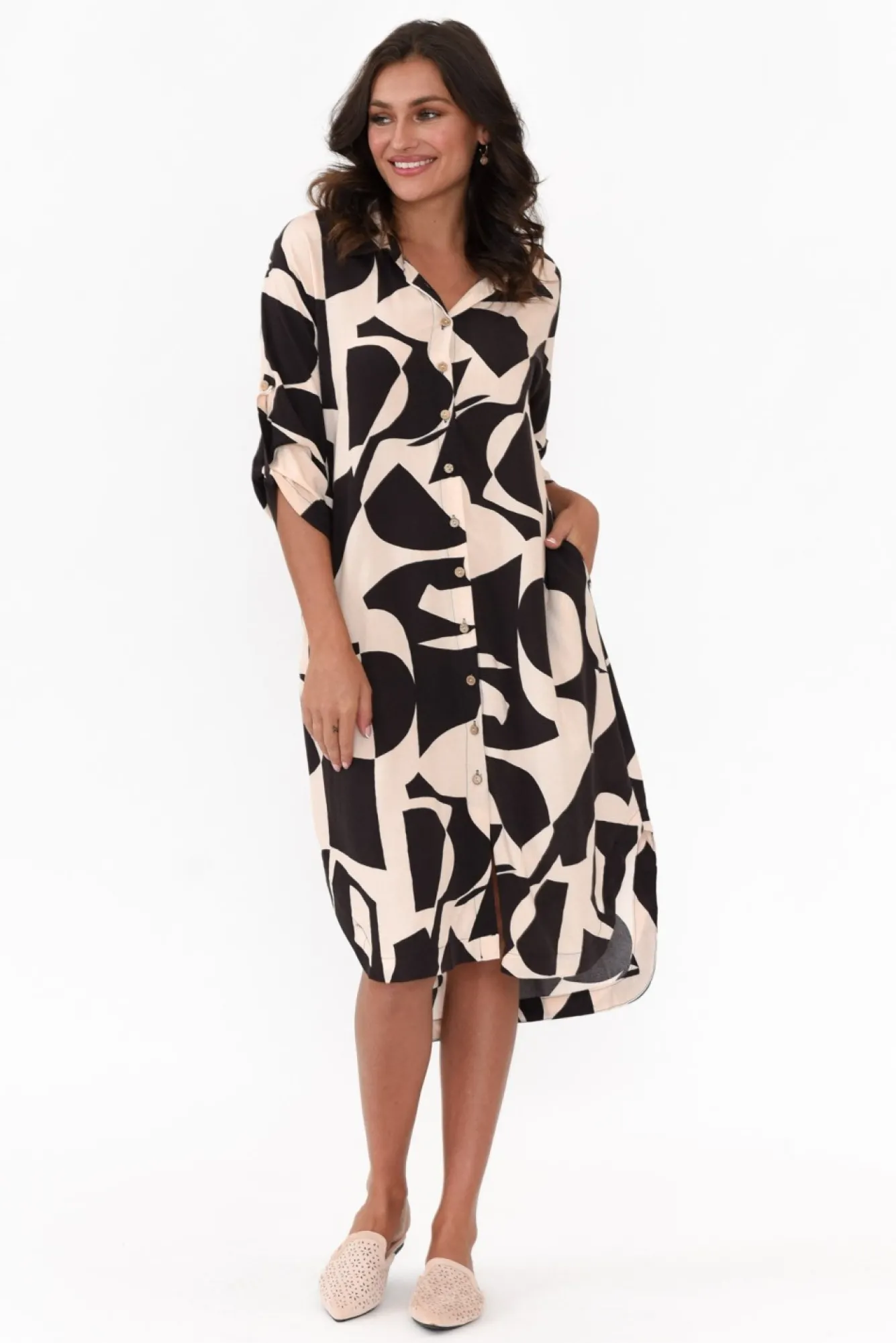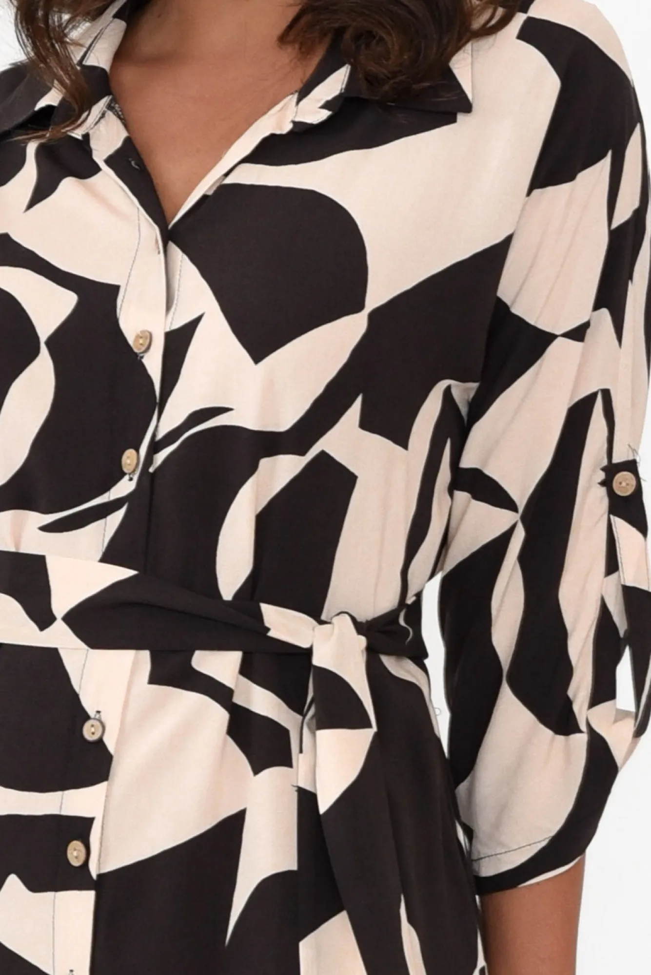 Fit: True To Size. Refer To Size & Fit Tab Below For Specific Size RecommendationNNfabric: 100% RayonNmade From Lightweight, Non-Stretch Fabric With A Smooth Hand Feel NNsharp Collared Neckline Complements The Full-Length Button-Down Front NNfull-Length Sleeves Can Be Rolled Up And Secured With Button Tab Closure NNversatile Straight Shirt Dress SilhouetteNNoptional Waist Tie For Figure Definition Ntwo Side Seam Pockets NNcurved Hi-Lo Hemline Falls To Knee LengthNNcare: Cool Gentle Hand Wash RecommendedNNcolour: Cream Base With Statement Black Abstract Design