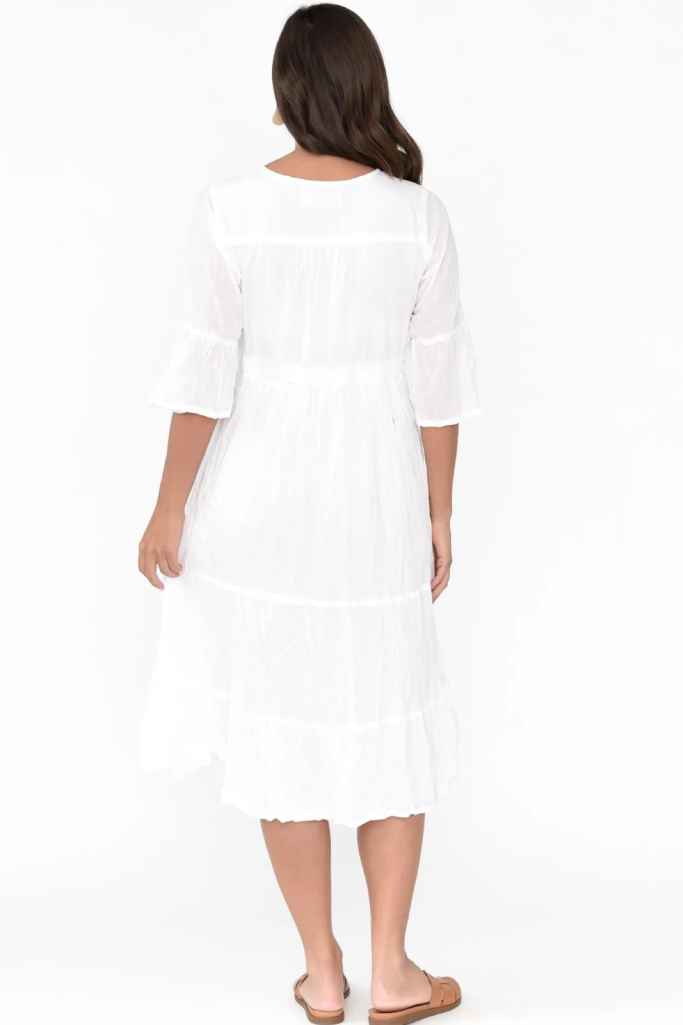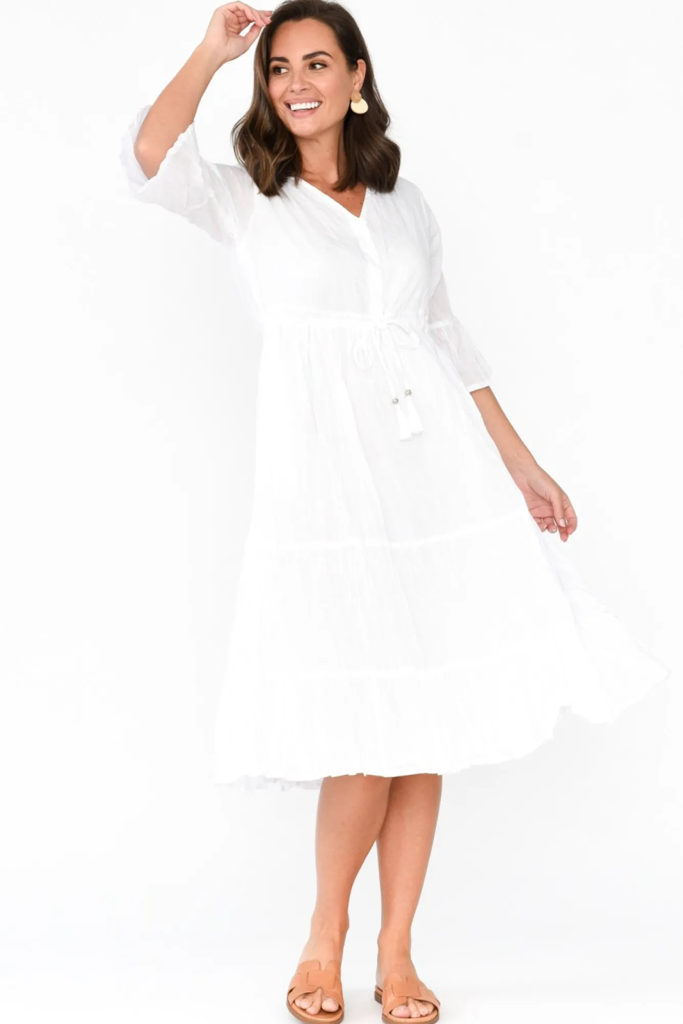 Fit: True To Size. Refer To Size & Fit Tab Below For Specific Size RecommendationNNfabric: 100% Cotton Nlightweight And Breathable Cotton In A Customer Favourite Crinkle CottonNNfabric Is Semi Sheer, We Recommend Pairing With Nude Undergarments Ntimeless V-Neck Style Flows To A Button Front NNthree-Quarter Sleeves With A Flared, Frill DetailNeffortless Tiered A-Line SilhouetteNNdrawstring Waist For A Personalised Fit, Featuring Soft Pleating Details Nfunctional Style Features Two Hip Pockets NNstraight Hem Falls Below The Knees NNcare: Cool Gentle Hand Wash RecommendedNNcolour: Classic WhiteNNfabric Tip: Store It Rolled Up Either In The Wardrobe Or In Your Suitcase To Keep The Crinkle Alive!