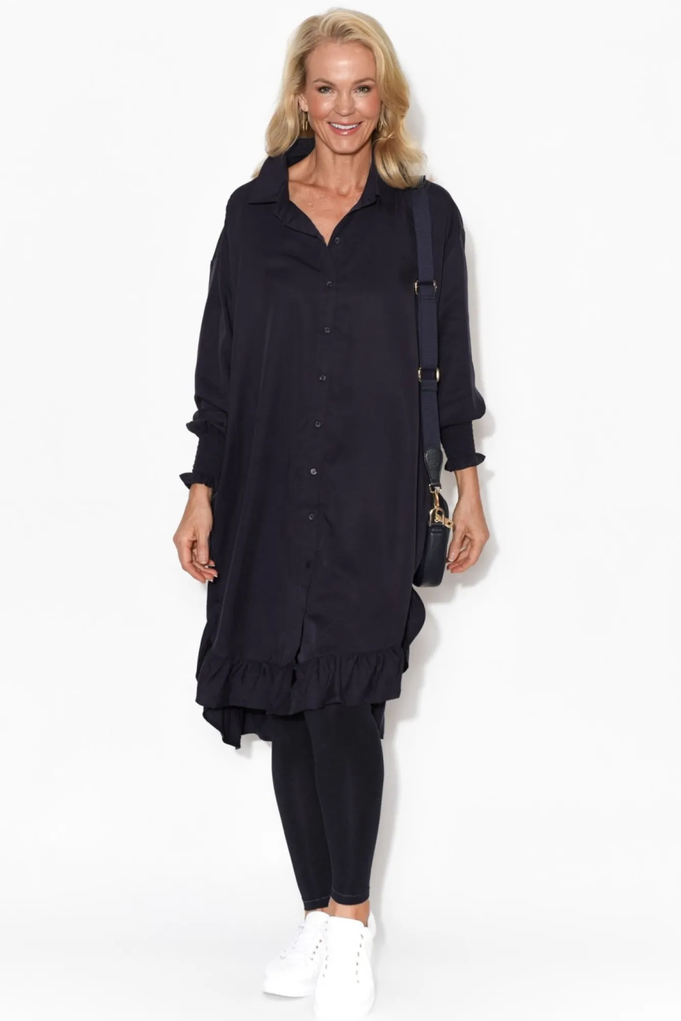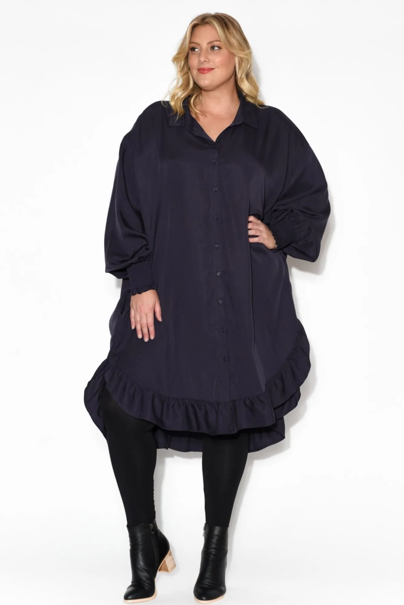 Fit: True To Size, Oversized Style. Refer To Size & Fit Tab Below For Specific Size Recommendation NNfabric: 100% TencelNmade From Incredibly Soft And Breathable Tencel This Dress Feels Ultra-Luxurious NNtraditional Collared Neckline And Button-Down Shirt StyleNNrelaxed Oversized Fit NNfull-Length Sleeves With A Shirred And Frilled CuffNNtwo Side Hip Pockets Nsmall Side Splits At The Hem For Easy MovementsNfrilled Hi-Lo Hemline Adds A Delicate Look To This Oversized StyleNNknee-LengthNNcare: Cool Gentle Hand Wash RecommendedNNcolour: True Navy Shade