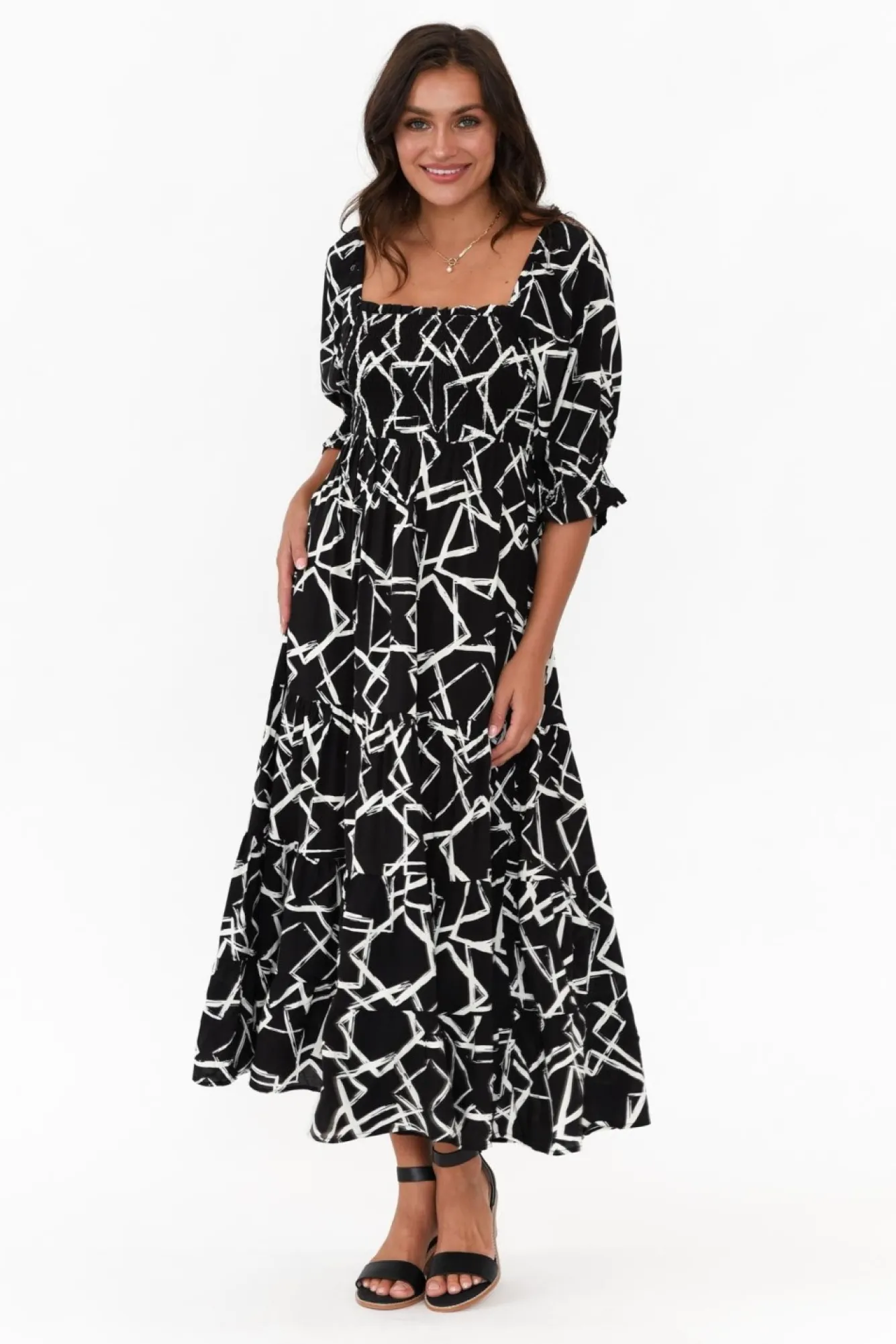 Fit: True To Size. Refer To Size & Fit Tab Below For Specific Size RecommendationNNfabric: 100% Viscose Nlightweight And Soft Fabric With A Billowy DrapeNsleeves Can Be Pulled Down To Create An Off-The-Shoulder Look Or Left On The Shoulders For A Statement Square NecklineNNstretchy, Shirred Bodice Hugs The BustNballoon Sleeves With A Shirred Frill Cuff Give This Style A Dramatic FlairNtiered Fit And Flare SilhouetteNstraight Hem Falls To A Midi LengthNNcare: Cool Gentle Hand Wash RecommendedNNcolour: Black With A Geometric White Overlay