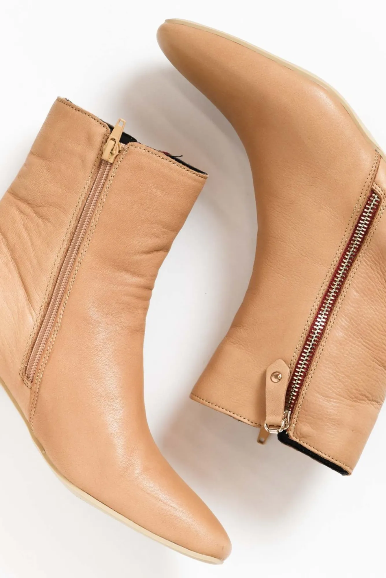 True To Size: Pick The Size You Would Normally BuyNNfit: Standard – NarrowNsleek And Sophisticated, Easy-To-Wear, Tan Leather Ankle BootNultra Padded Insole And Lining For All-Day ComfortNmade From Premium Soft Turkish LeatherNinternal And External Zips To Base Allow For Easy Slip-On Or OffNsquared Toe BoxNscored Sole And Rubber Heel Prevent SlippingNfeature Red And Gold External Zip Add A Fun Pop Of ColourNslant On Heel Creates A Trendy Geometric LookNNupper: LeatherNNlining: Non-LeatherNsole: Man-MadeNheel Height: 4CmNNshoe Care: Use A Water And Stain Repellent Spray To Protect Before Wearing. Clean With A Damp Cloth And Polish Afterwards.