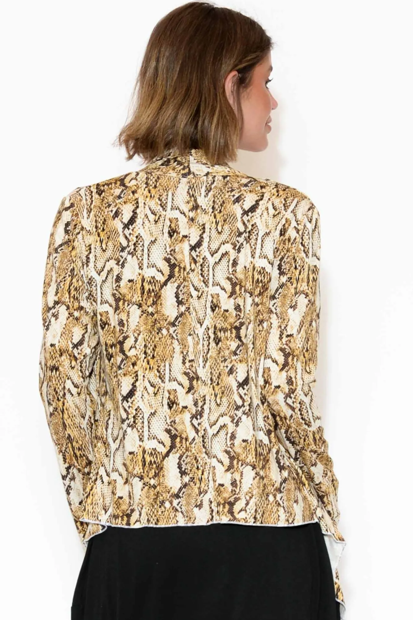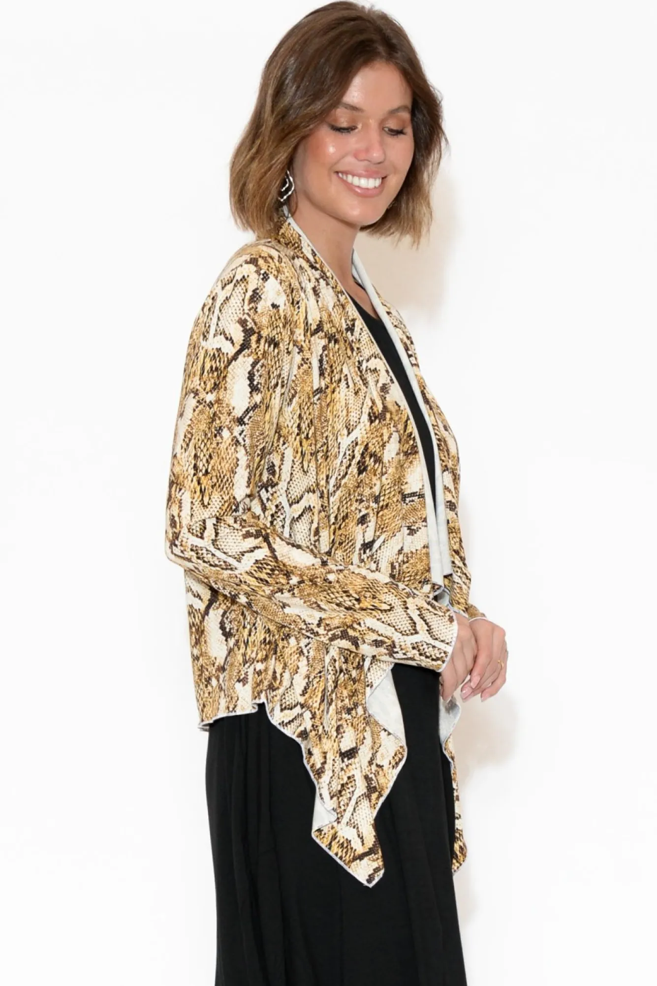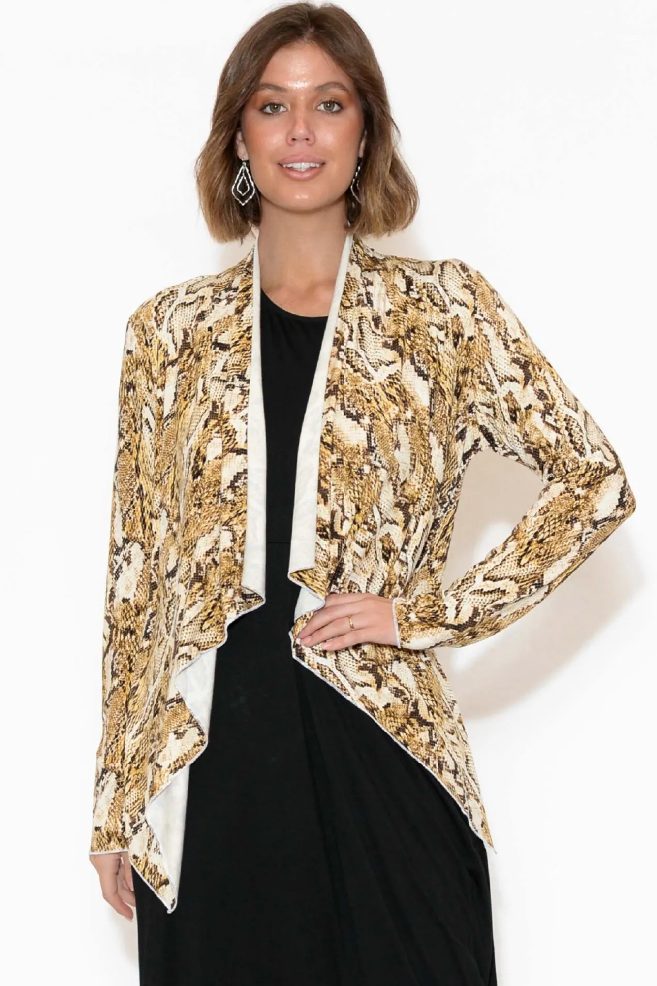 Fit: True To Size. Refer To Size & Fit Tab Below For Specific Size Recommendation NNfabric: 93% Bamboo, 7% ElastaneNpremium, Ultra-Soft And Stretchy, Mid-Weight Bamboo FabricNNtrendy Open Style JacketNthe Waterfall Hemline Drapes Down The BodyNlong Slimming SleevesNNcropped Length Hits Above The HipsNNcare: Cool Gentle Machine Wash RecommendedNNcolour: On-Trend Animal Print In A Lovely Mustard Yellow Shade
