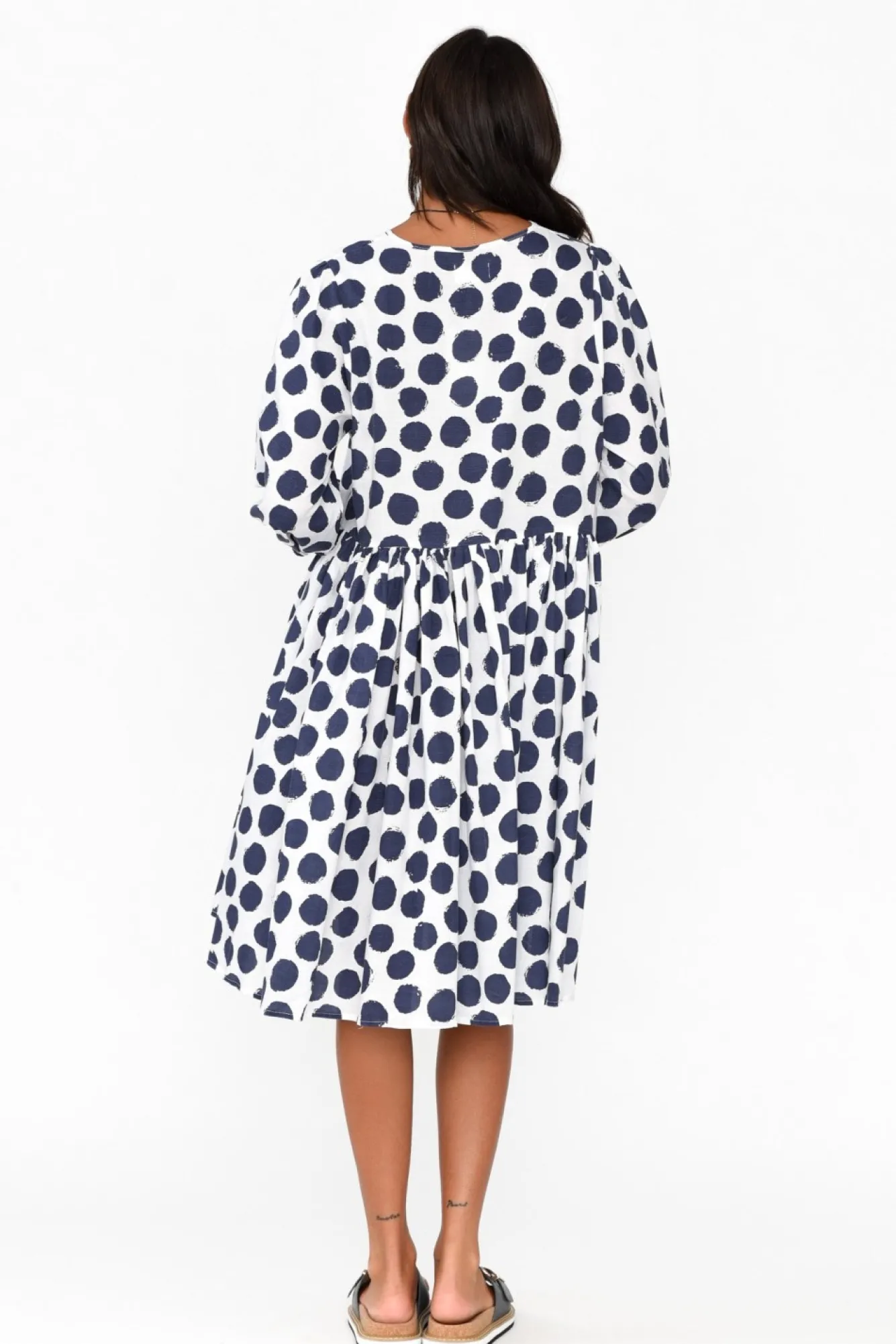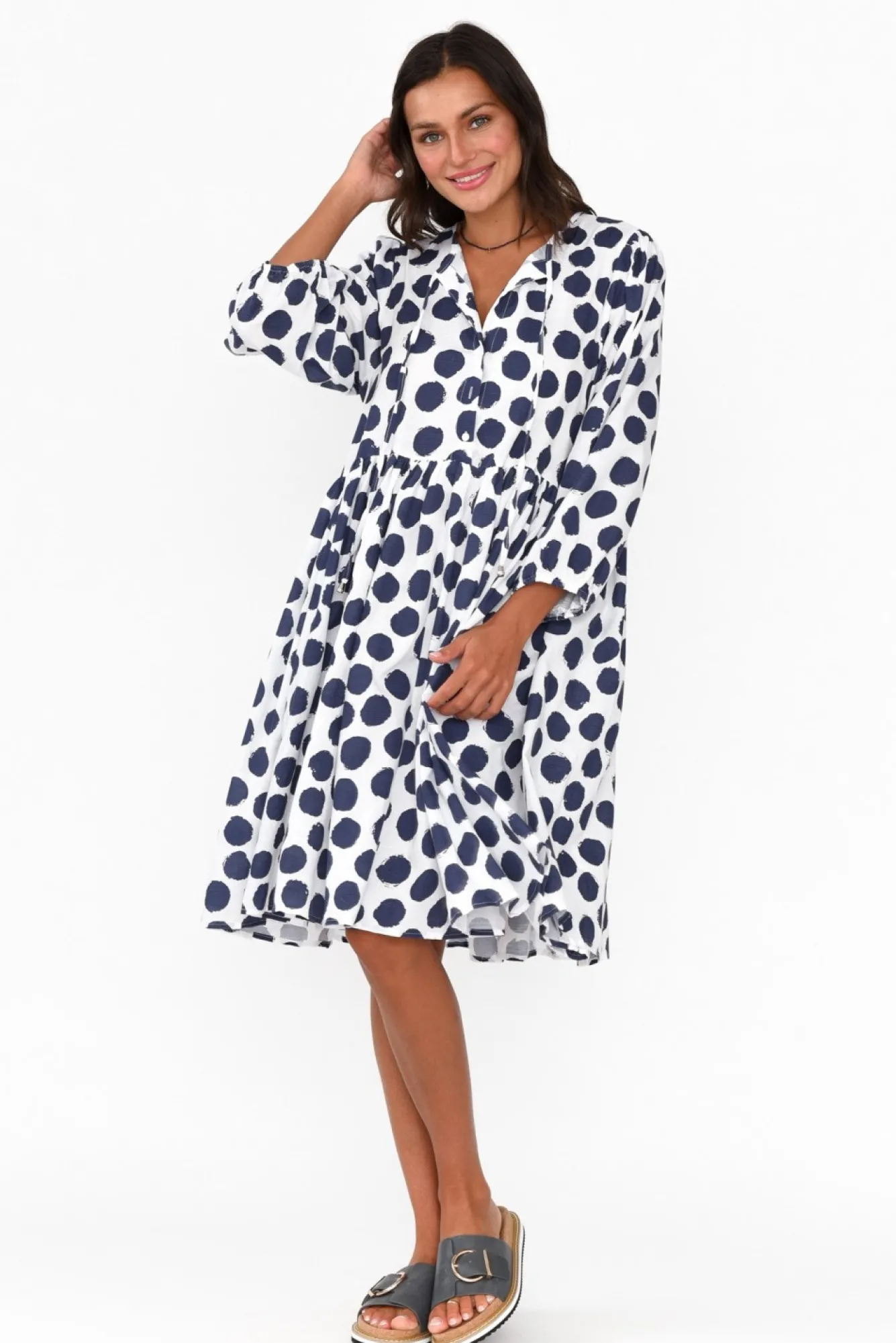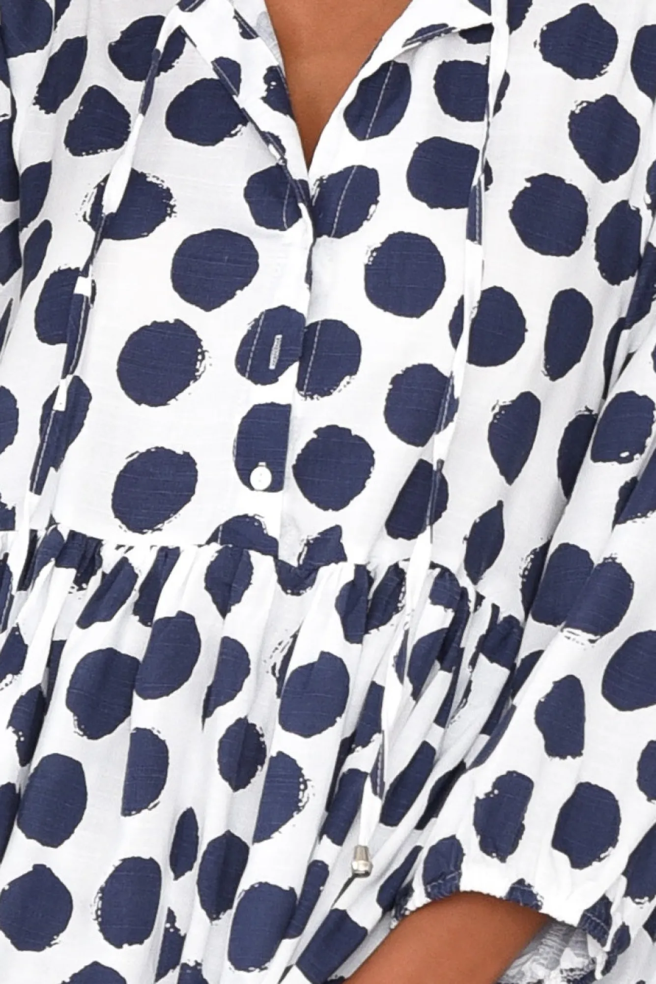 Fit: True To Size. Refer To Size & Fit Tab Below For Specific Size RecommendationNNfabric: 100% CottonNlightweight, Breathable And Non-Stretch Cotton With A Smooth Woven Hand Feel Nv-Split Neckline With And Adjustable Tie, Leading To Three Pearlescent ButtonsNN3/4 Length Puff Sleeves With An Elasticated Cuff Nversatile A-Line Silhouette With A Gathered Waist Seam To Enhance The Full SkirtNNtwo Discreet Hip Pockets Located In Side Seams NNstraight Hemline Falls To The Knee NNNcare: Cool Gentle Machine Wash RecommendedNNcolour: Crisp White Base With Navy Abstract Spot Print