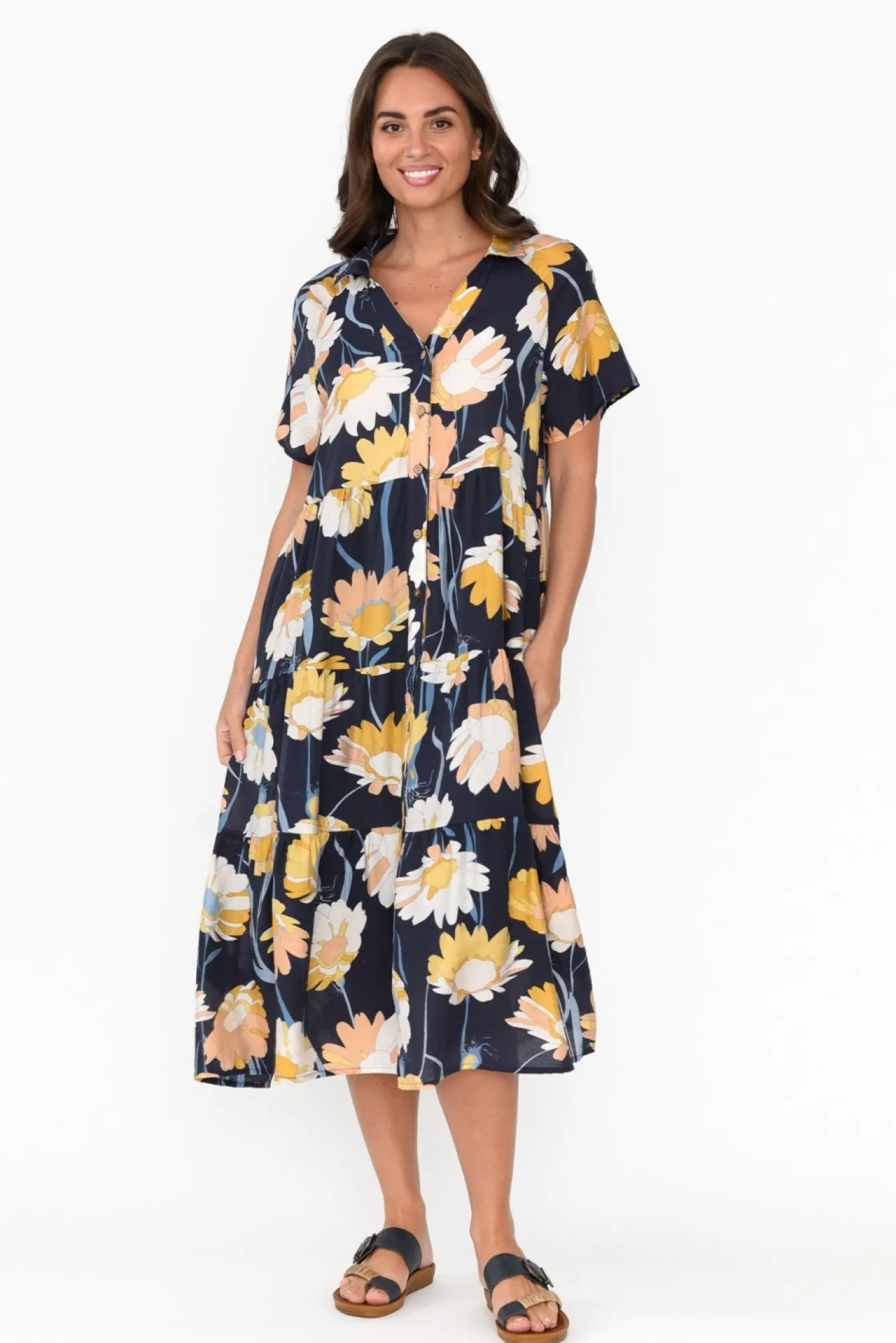 Cotton Dresses<Cali and Co Maelle Navy Flower Cotton Tier Dress