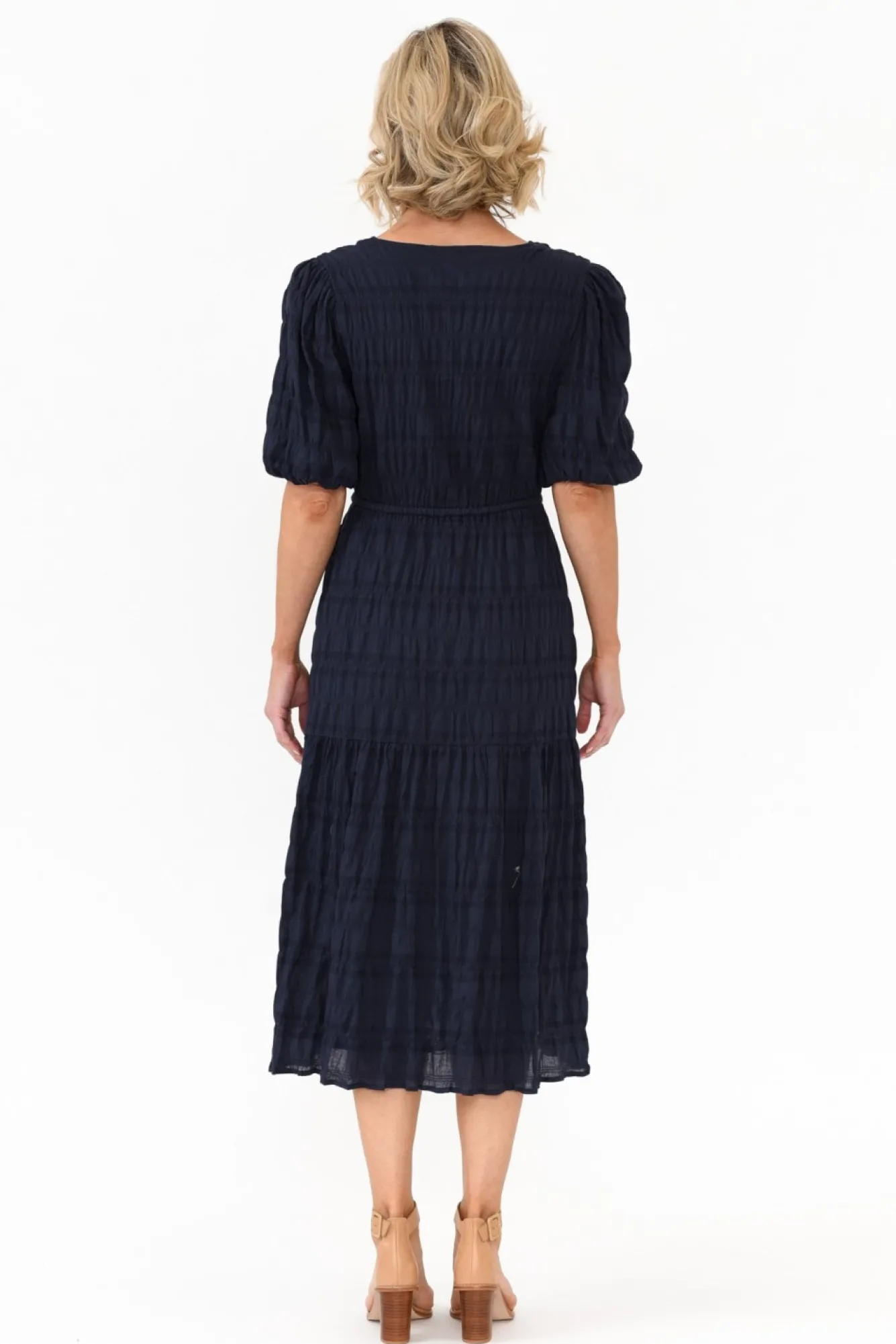 Fit: True To Size. Refer To Size & Fit Tab Below For Specific Size RecommendationNNfabric: 100% CottonNmade From Breathable And Lightweight Cotton With A Loose Shirred FinishNNfully Lined With A Navy Non-Stretch Cotton Fabric Ntimeless Round Neckline Skims The Collarbones NNhalf-Length Sleeves With Hidden Elasticated Cuffs To Create A Statement Puff LookNNversatile Straight Silhouette With A Slightly Elasticated Waist And Adjustable DrawstringNNintricate Horizontal Stitching Details Throughout For An Elevated LookNstraight Hemline Falls Below Knee Length NNNcare: Cool Gentle Machine Wash RecommendedNNcolour: Oceanic Navy Hue