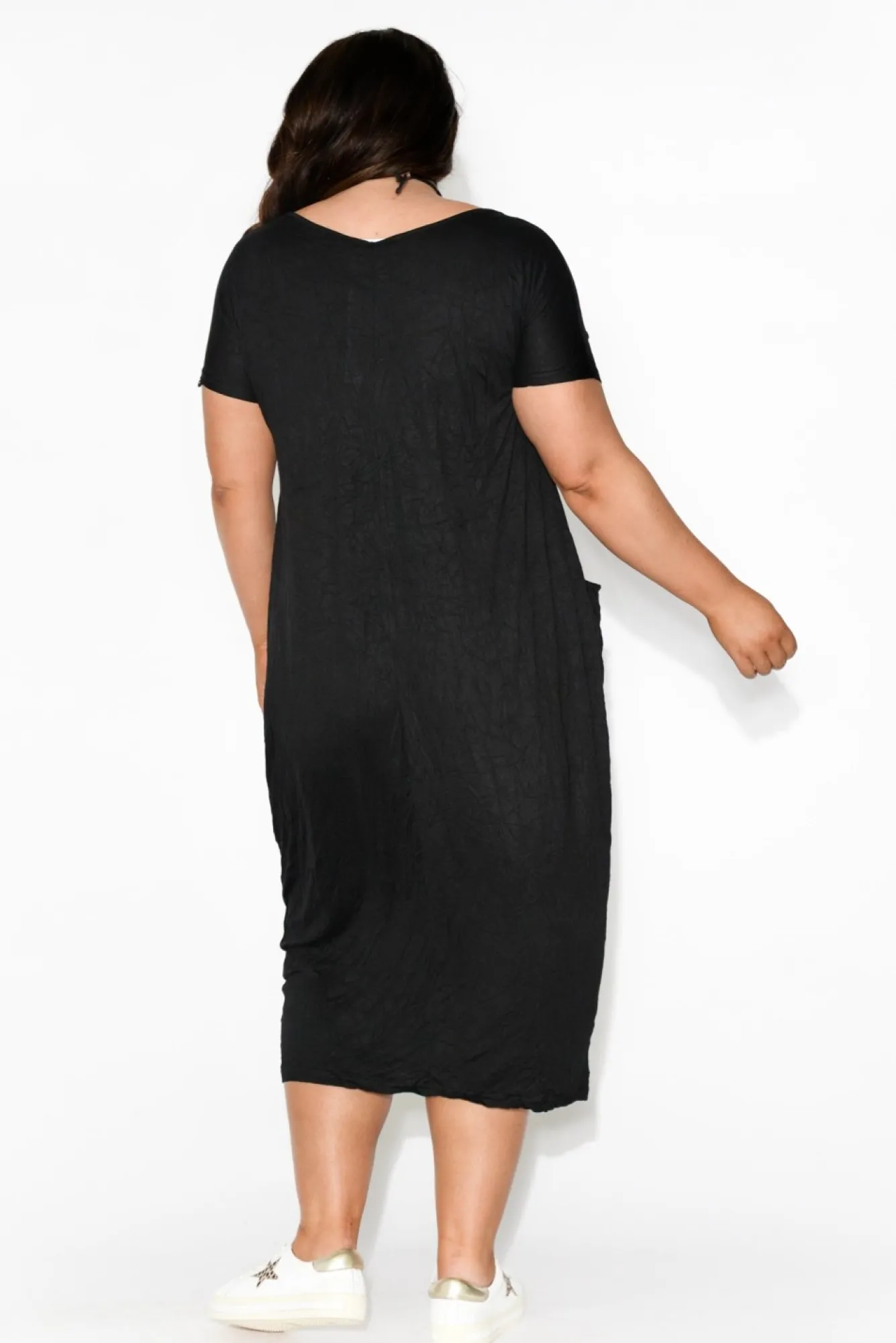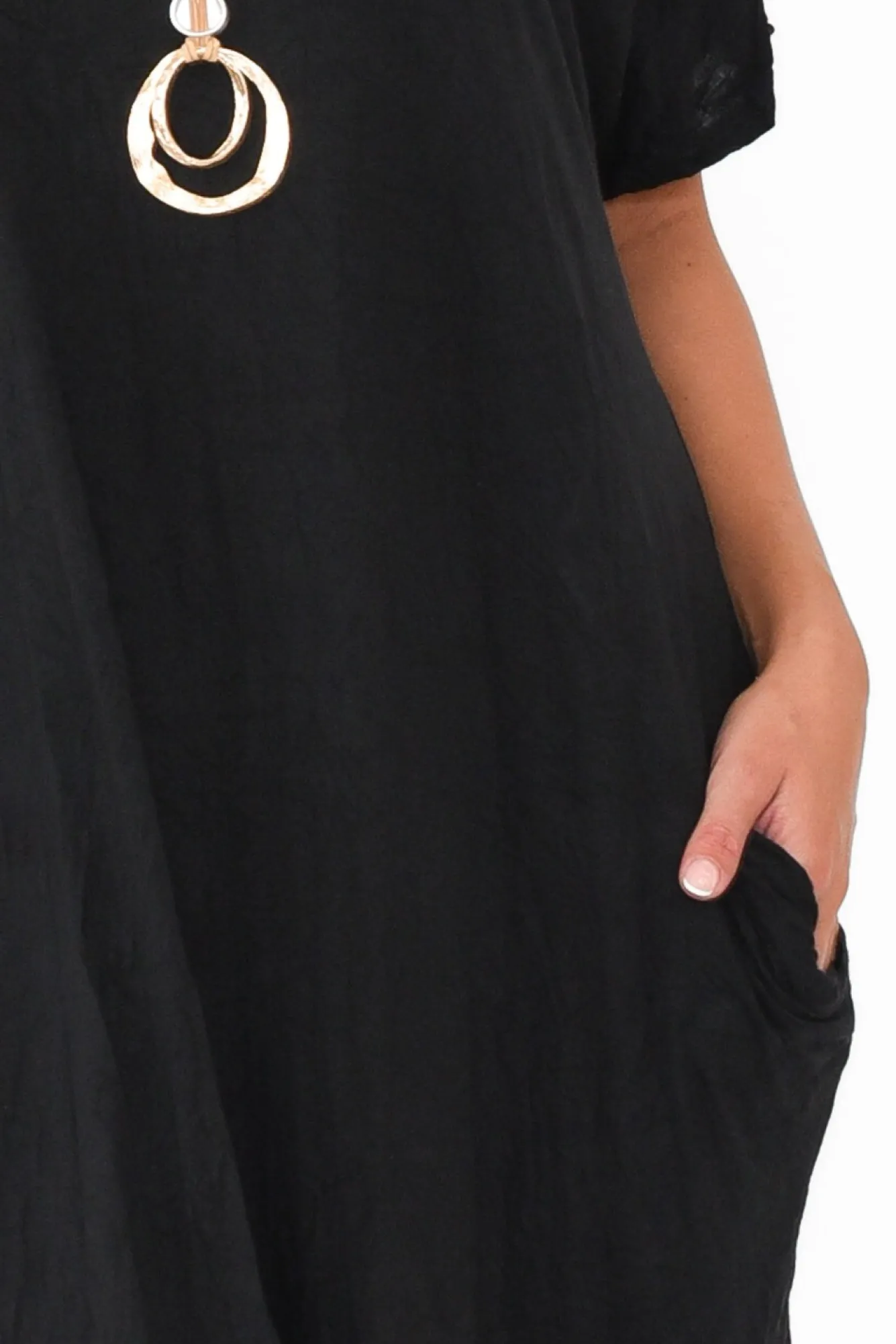 Fit: True. Refer To Size & Fit Tab Below For Specific Size RecommendationNNfabric: 100% Crinkle CottonNlightweight, Soft, Breathable Fabric With A Fuss-Free Crinkle Finish NNround Scoop NeckNshort SleevesNdrape SilhouetteNNtwo Large Hip PocketsNankle Skimming LengthNNcare: Cool Gentle Hand Wash RecommendedNNcolour: Black ShadeNnote: Please See Photos Rather Than Video For Most Accurate Colour.