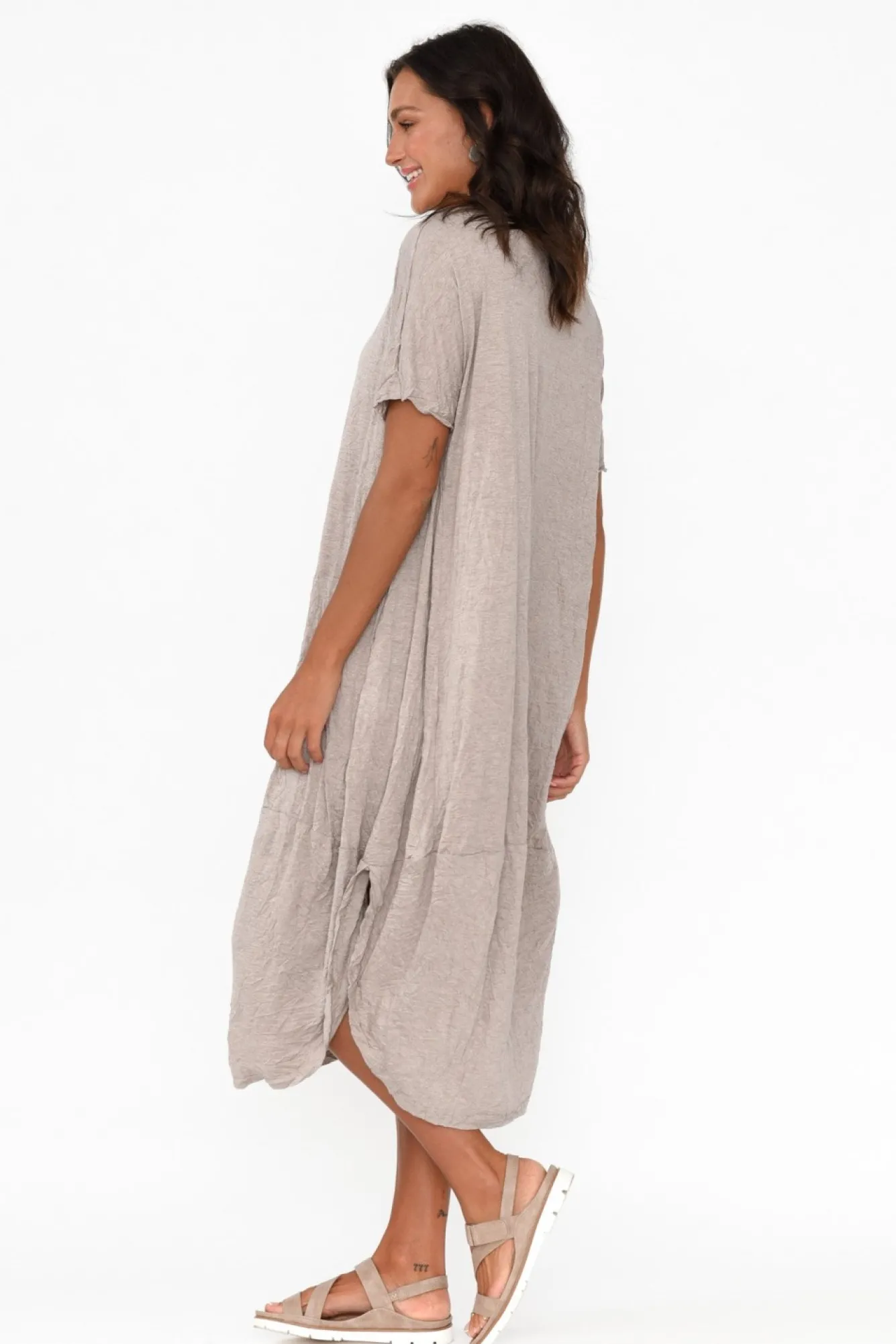Fit: True To Size. Refer To Size & Fit Tab Below For Specific Size RecommendationNNfabric: 100% CottonNsoft, Lightweight And Breathable Cotton Designed With A No-Fuss Crushed Finish NNsimple Round Neckline Complements The Straight Short Sleeves NNversatile Tulip Silhouette Enhanced By Seam Detailing At The Side And Hem NNtwo Front Pockets Discreetly Located In Side Seams NNside Splits For Ease-Of-MovementNcurved Hemline Falls Below Knee Length NNNcare: Cool Gentle Hand Wash RecommendedNNcolour: Lovely Neutral Beige-Grey Oat Tone
