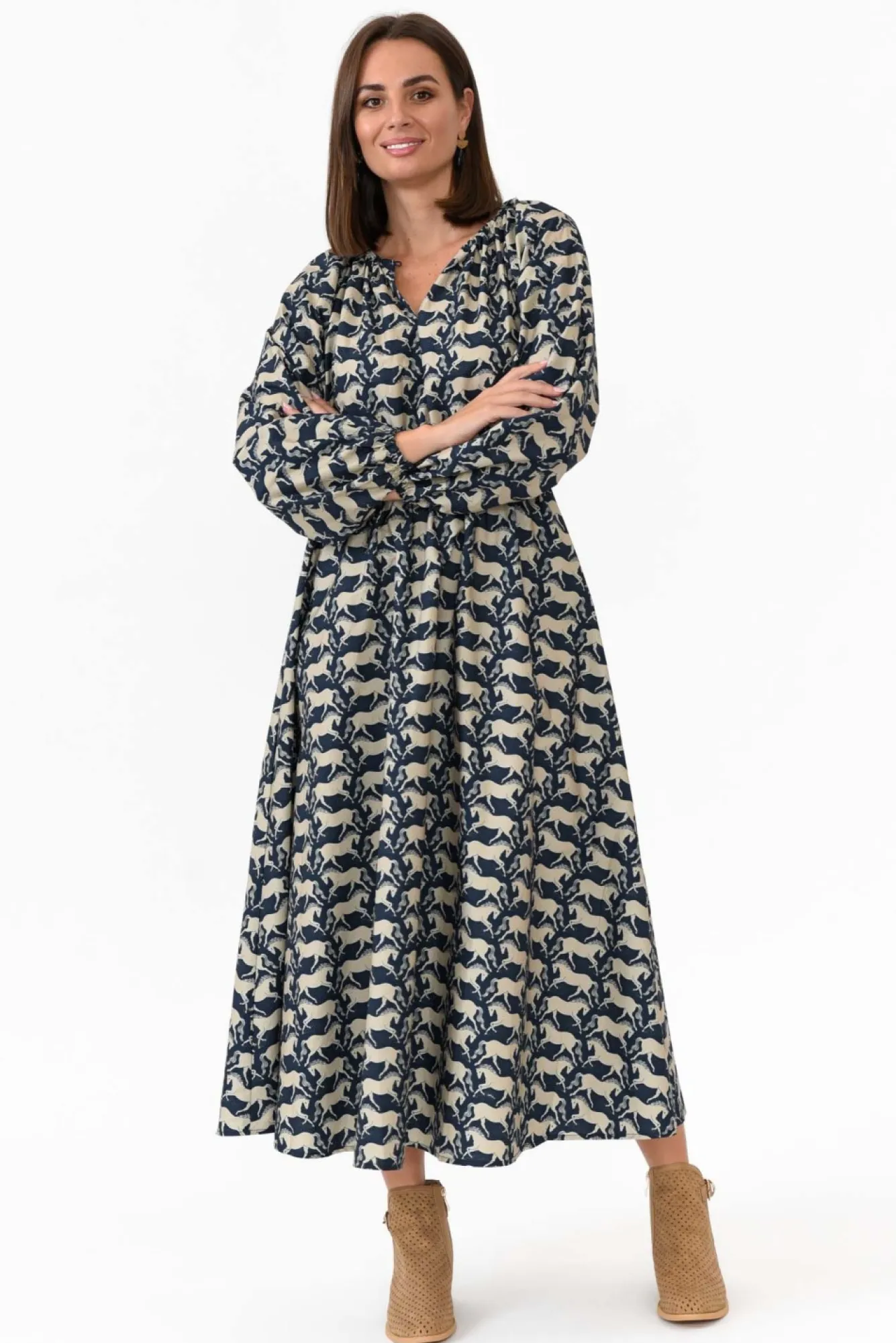 Fit: True To Size. Refer To Size & Fit Tab Below For Specific Size RecommendationNNfabric: 100% CottonNlightweight, Breathable Cotton With A Smooth, Crisp Hand Feel And A Structured DrapeNclassic Rounded Neckline With A V-Split KeyholeNNelastic Waistband Flatters The MidlineNfull-Length Puff Sleeves With Tapered Elastic CuffNNelegant A-Line Silhouette Creates A Full SkirtNstraight Hem Falls To A Midi LengthNNcare: Cool Gentle Machine Wash RecommendedNNcolour: Navy Base With A Detailed Taupe Horse Overlay