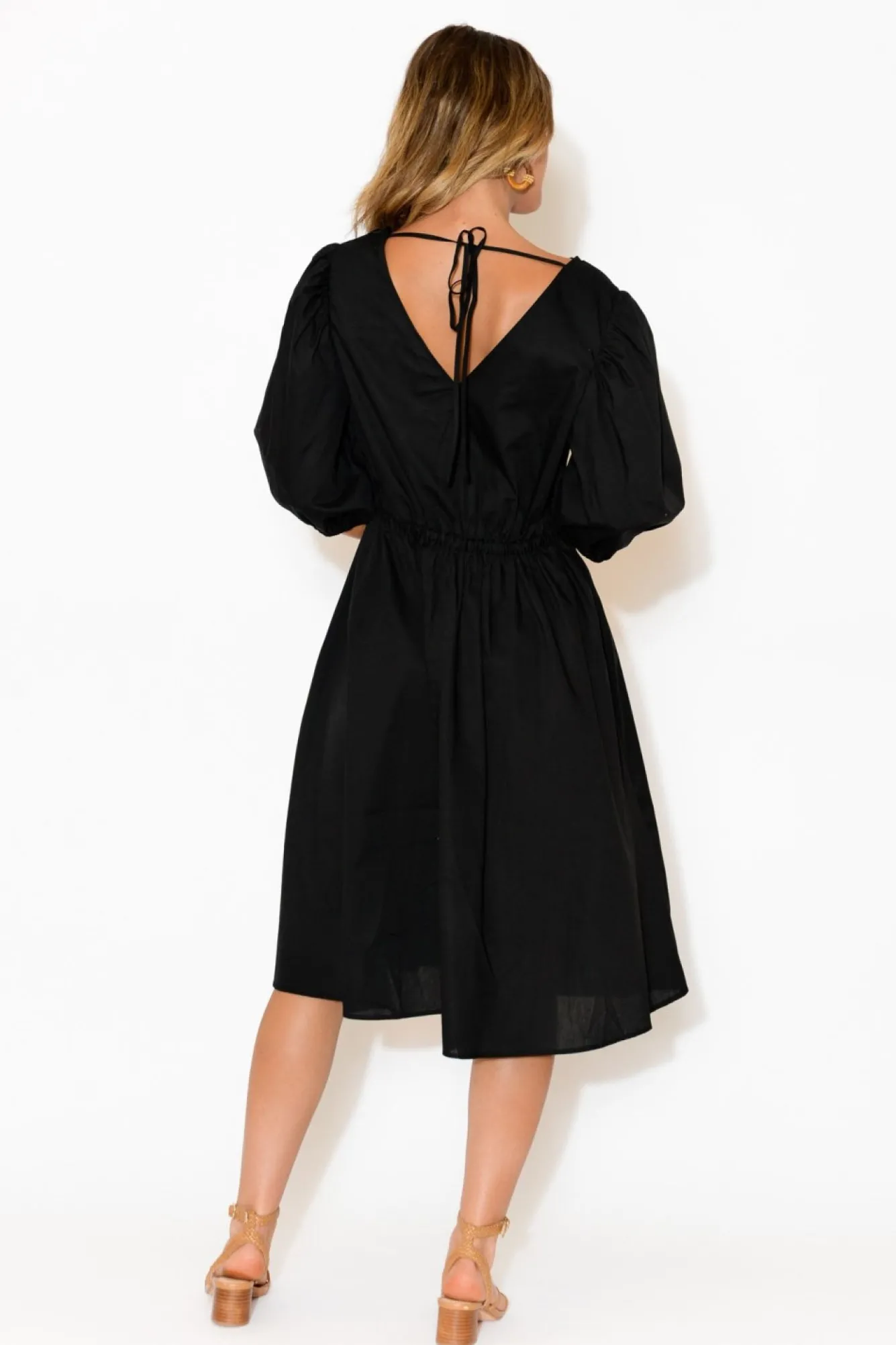Fit: True. Refer To Size & Fit Tab Below For Specific Size Recommendation NNfabric: 100% CottonNlightweight, Smooth, And Crisp CottonNsharp V -NecklineNNtie Up V Cut At BackNhalf Length Balloon Sleeve With Elastic CuffNNelastic Drawstring Waistband With Gold Aglets Allows You To Cinch The Waist For The Perfect FitNa-Line SilhouetteNNbelow Knee Length DressNNcare: Cool Gentle Machine Wash RecommendedNNcolour: Timeless Black Colour