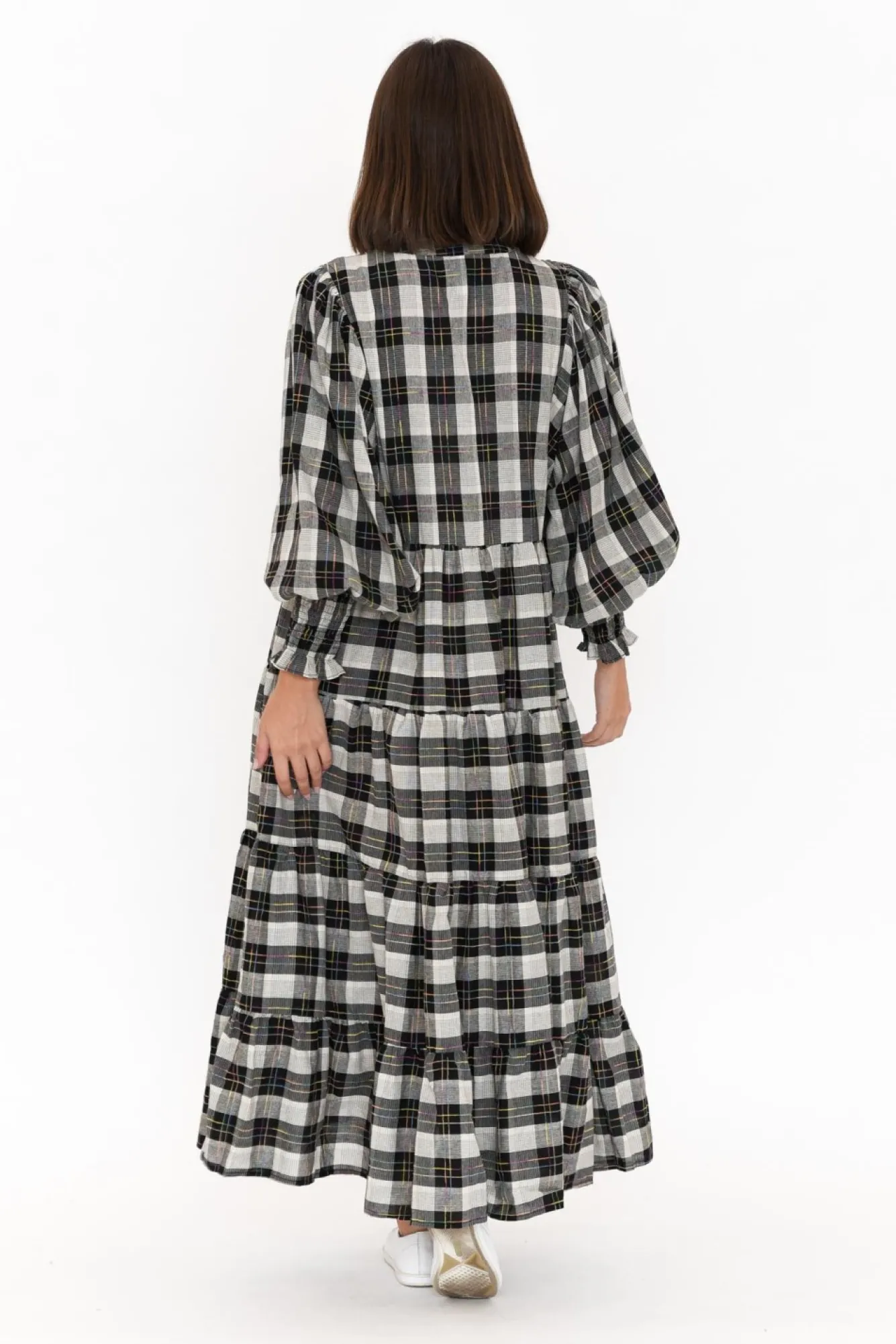Fit: True To Size. Refer To Size & Fit Tab Below For Specific Size RecommendationNNfabric: 100% CottonNconstructed From Lightweight, Ultra-Breathable And Non-Stretch Cotton With A Soft Hand Feel Nround Banded Neckline Complements The Button-Down Front From Neck To WaistNstatement Ballon-Sleeves Accentuated By Fitted Shirred CuffsNversatile Tiered A-Line Silhouette Enhanced By Subtle Pleating Under Tiers Ntwo Discreet Hip Pockets NNdrapes To Classic Maxi Length NNNcare: Cool Gentle Hand Wash RecommendedNNcolour: Black And White Check With Delicate Multicolour Thread DetailingNNNNfit Tip: This Style Features A Non-Stretch Waist Seam That Must Fit Over Your Bust. If You Have A Larger Bust, We Suggest Sizing Up. Please Consult The Size & Fit Tab Below To Determine The Size Best For You.
